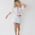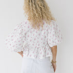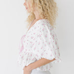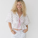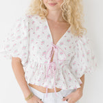 Add a touch of whimsy to your wardrobe with our Selina Ditzy Floral Crop Top. This charming top features a dainty floral print and a cute bow tie in the front. With its puffy short sleeves and flattering peplum cut, it's the perfect choice for a feminine and playful look.