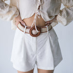 The Siena Shorts offers chic sophistication with its tailored fit. The high-waisted shorts flatter the silhouette while the crochet belt adds a playful boho touch. Perfect for both daytime and evening wear, these shorts will elevate any look with its polished yet feminine ensemble.