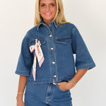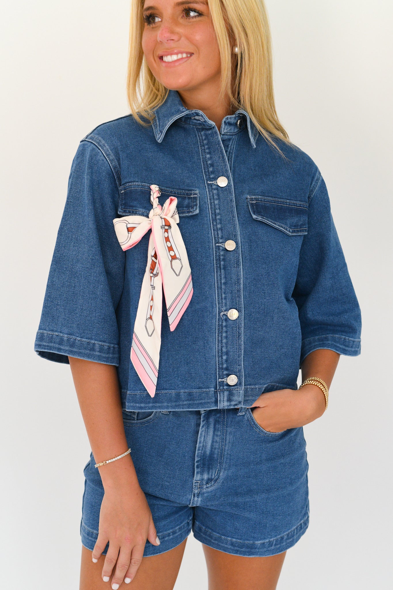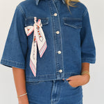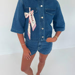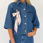 This Mia Denim Top and Short Set in light blue offers a stylish, comfortable look with short sleeves and a classic collared neckline. The added scarf detail brings a unique touch that enhances your outfit effortlessly, making it perfect for casual outings or relaxed days. Designed for easy wear, this set combines fashion and function to keep you confident and comfortable all day long.