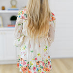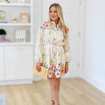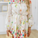 This dress features a beautiful floral border print on a lightweight cotton voile fabric. The lace insert adds a delicate touch to the design. Perfect for any spring occasion, this dress is both stylish and comfortable.