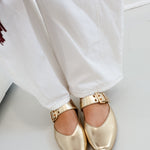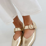 These Square Toe Ballet Flats in Gold combine classic Mary Jane style with a modern twist. Featuring a grommet-style adjustable buckle, they offer a secure and customizable fit for all-day comfort. The unique square toe with an almond front adds elegance while providing ample room for your toes. Perfect for pairing with both casual and dressy outfits, these flats are designed to support you with style and practicality.