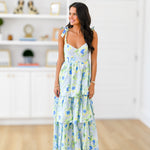 Elevate your warm-weather wardrobe with our Stacy Shoulder Strap Maxi Dress in Sky Blue. This dress features a beautiful floral print and ribbon shoulder straps, with a tiered design for a chic, flowy silhouette. Stay stylish and comfortable all day long