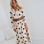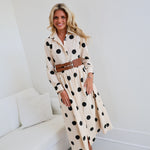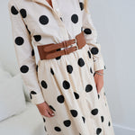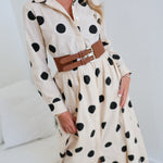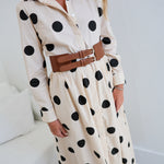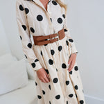 Embrace effortless style with the Tanya Polka Dot Shirt Dress featuring a chic faux leather belt. The classic ivory and black polka dot pattern brings timeless charm, while the belt defines your waist for a flattering silhouette. Perfect for day-to-night wear, this dress offers comfort and confidence in every step.