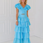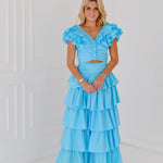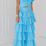 This blue Tara Ruffle Skirt Set is the perfect addition to any spring wardrobe! The ruffle skirt adds a fun and flirty touch, while the cropped length top features a button detail for added style. Stay on-trend and show off your fashion sense with this must-have set.