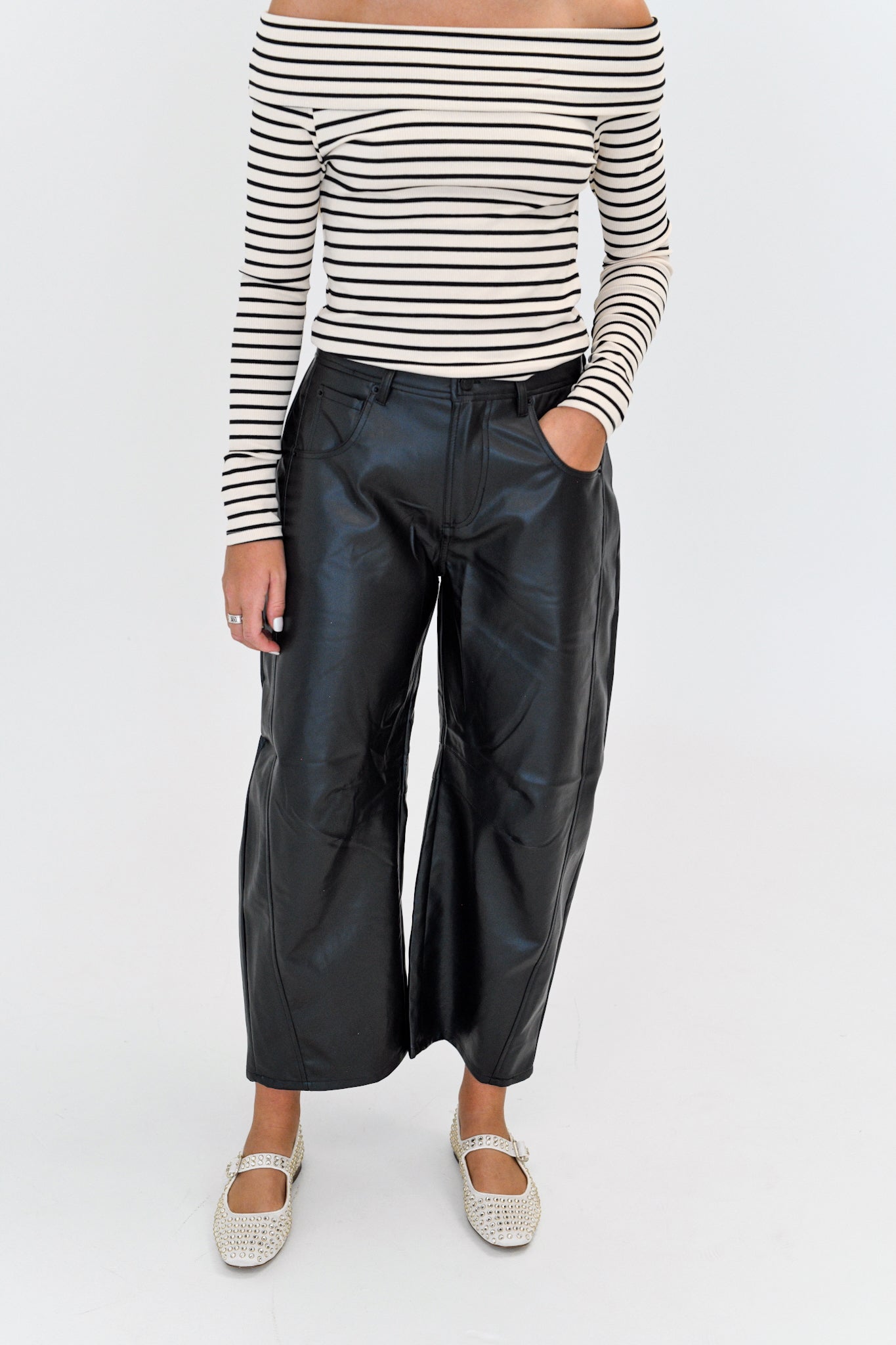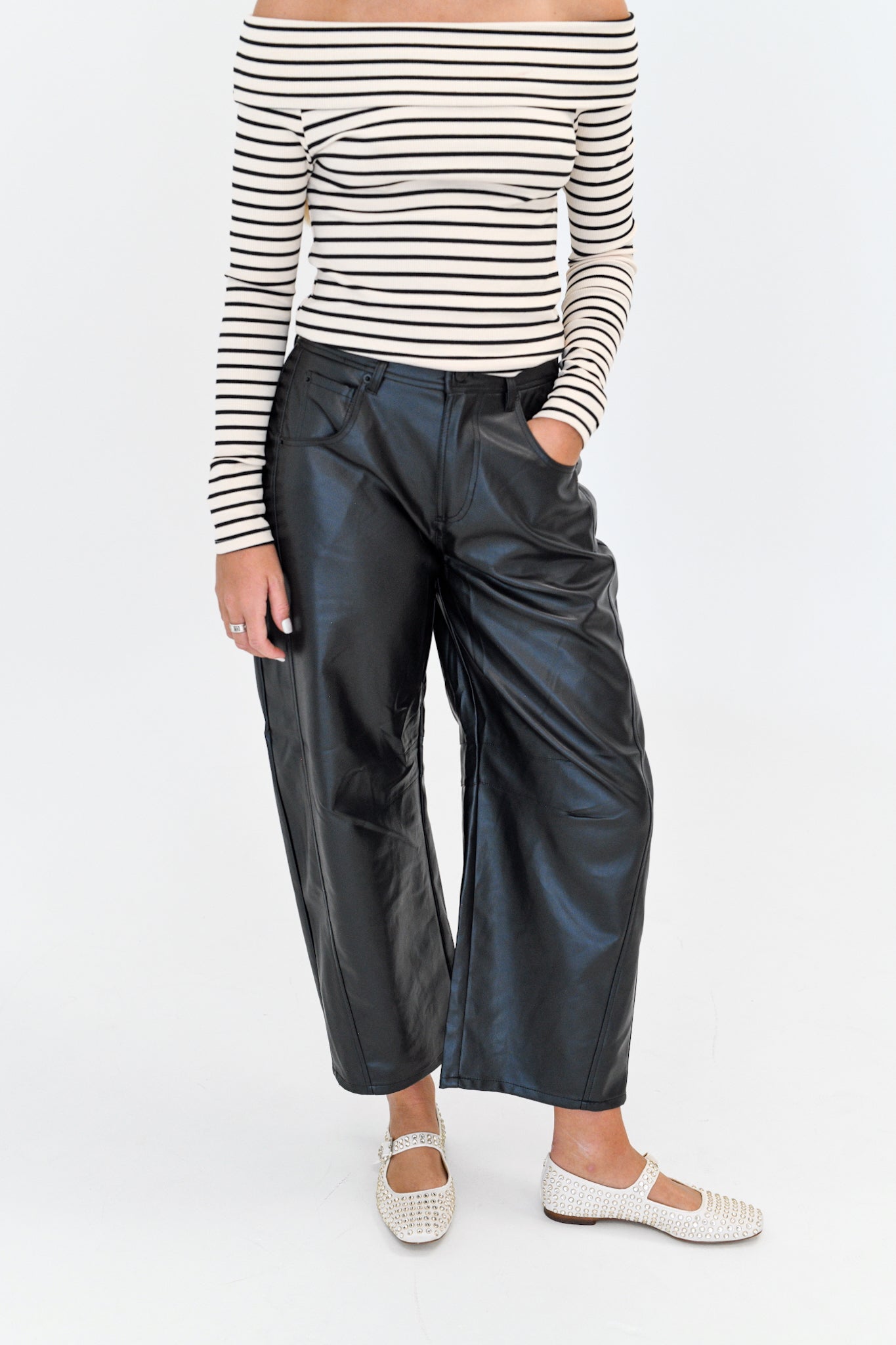Elevate your wardrobe with our Tess Pleather Barrel Pants in classic black. Made with high-quality pleather, these pants provide a sleek and stylish look while offering maximum comfort and durability. Perfect for any occasion, these pants will become a staple in your wardrobe, effortlessly combining fashion and function.