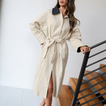 The Tilly Oversized Trench Coat in Beige-Navy offers a stylish and comfortable layering option with its relaxed fit and distinctive contrast collar. Designed to provide warmth and ease of movement, this long coat is perfect for chilly days while elevating any outfit with its classic yet modern look. Its versatile color combination pairs well with various wardrobe styles, making it a dependable choice for year-round wear.