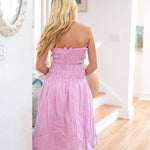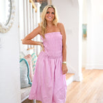 The Tori Smocked Midi Dress in Orchid is designed to brighten your wardrobe with its playful and flattering style. Its all-over smocked bodice offers a comfortable, curve-hugging fit, while the strapless design and flowing midi skirt provide ease and movement, making it an ideal choice for warm-weather days. This dress combines comfort and elegance to keep you feeling confident and stylish.