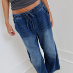 Experience comfort and style with the Whitney Barrel Pants in Dark Denim. Featuring a horseshoe cut for a flattering silhouette and a stretchy waistband, these pants offer ease of movement and a secure fit throughout your day. Perfect for those who want a blend of classic denim look with added comfort.