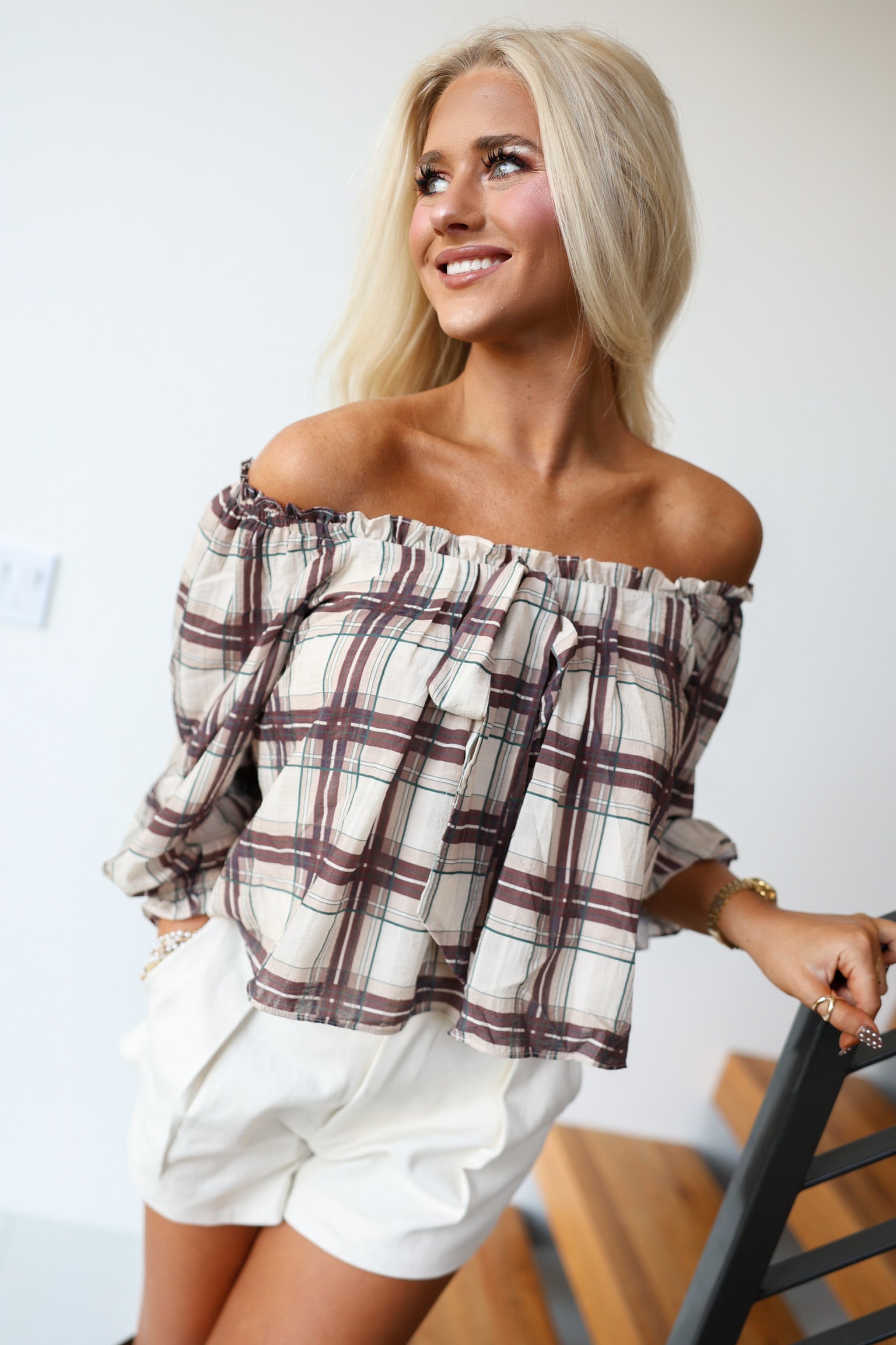 Ciera Plaid Off The Shoulder Top - Brown/Ivory