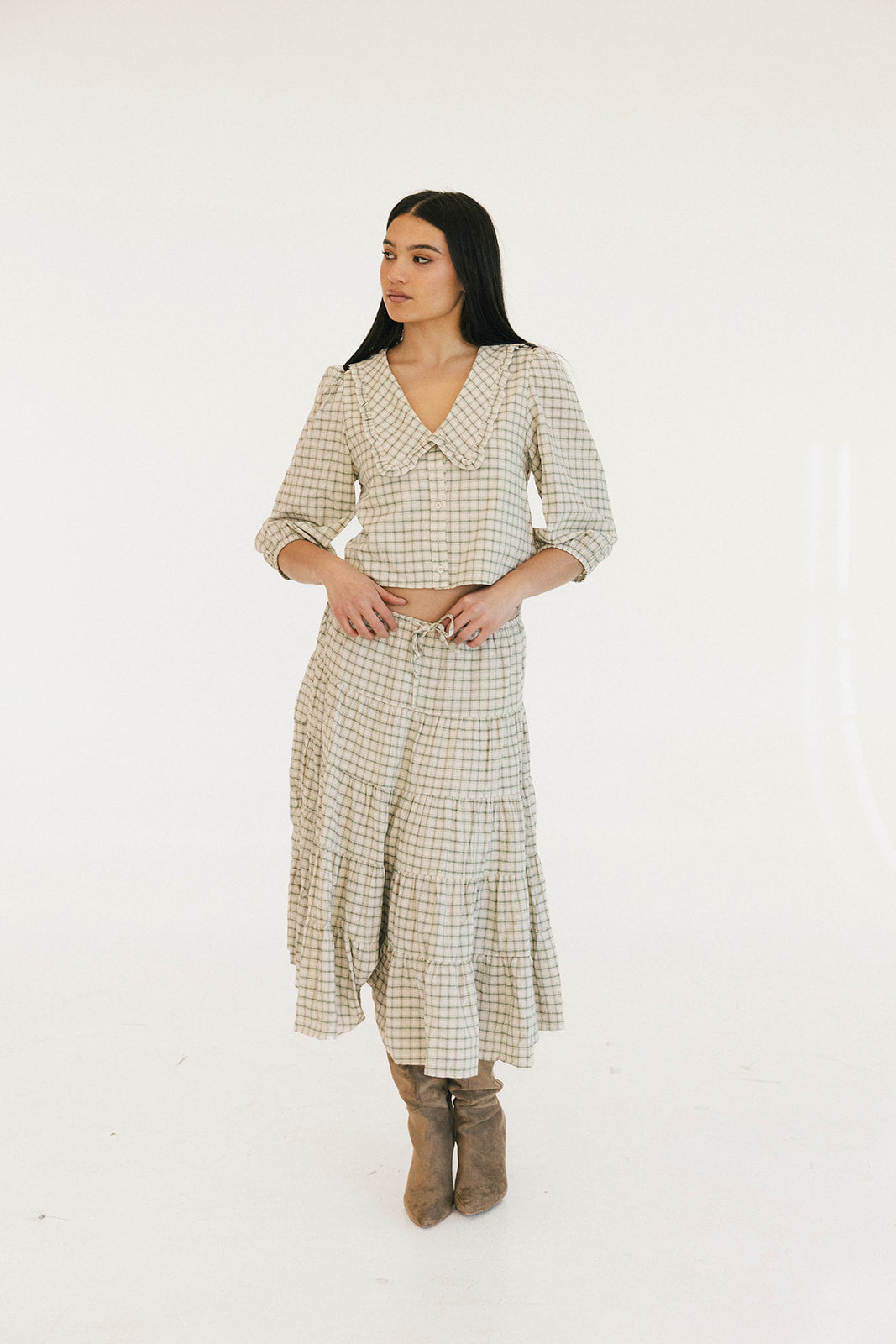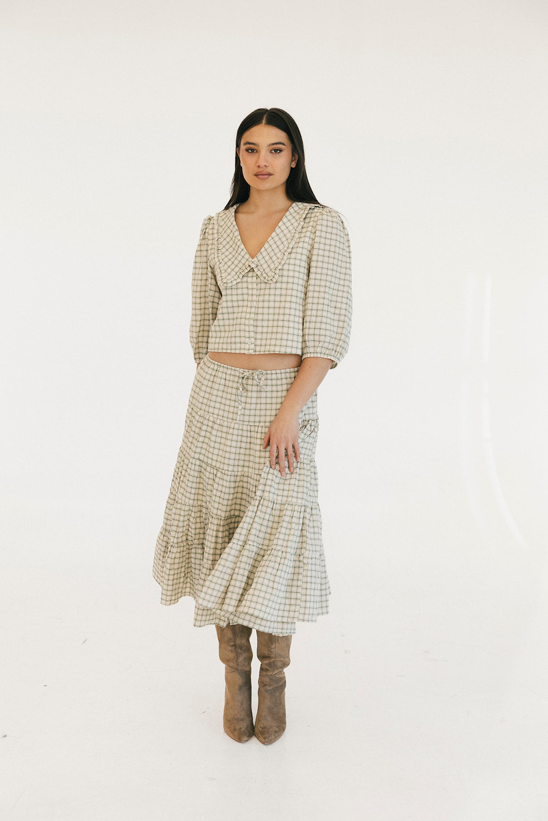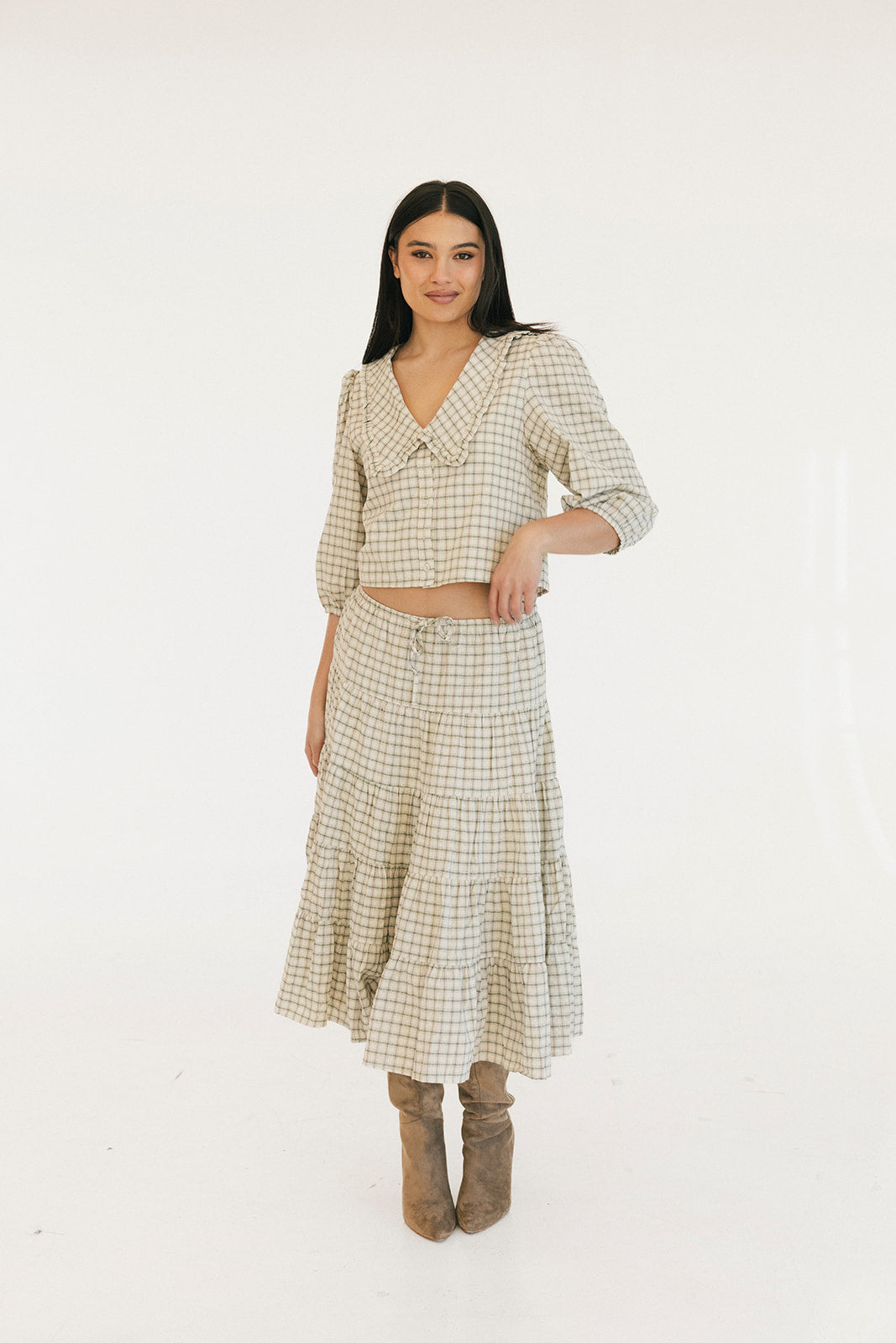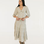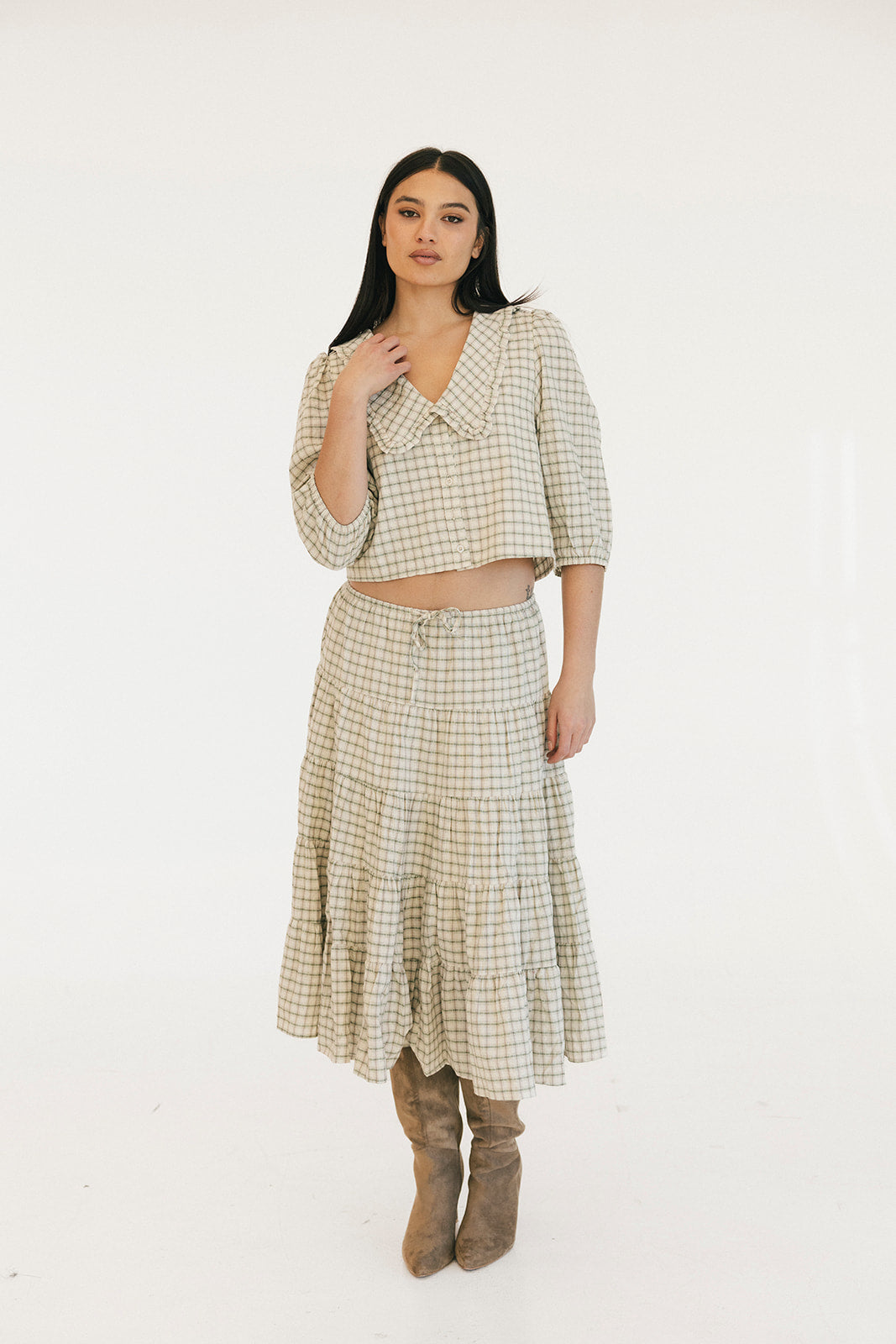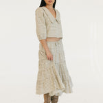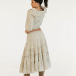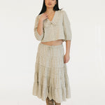 The Casey Plaid Skirt in Olive is a versatile wardrobe essential that combines comfort with effortless style. Crafted from a lightweight cotton blend, this midi skirt features a flattering tiered silhouette with gathered seams that create beautiful movement and dimension. The elastic waistband with adjustable tie ensures a personalized fit that works for your body, making it easy to slip on and feel confident throughout your day. Perfect for layering or wearing solo, this piece transitions seamlessly from casual outings to relaxed gatherings.