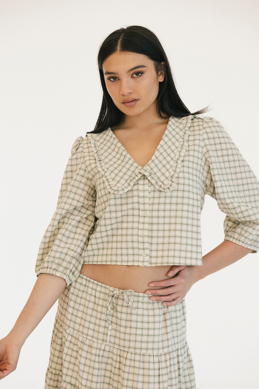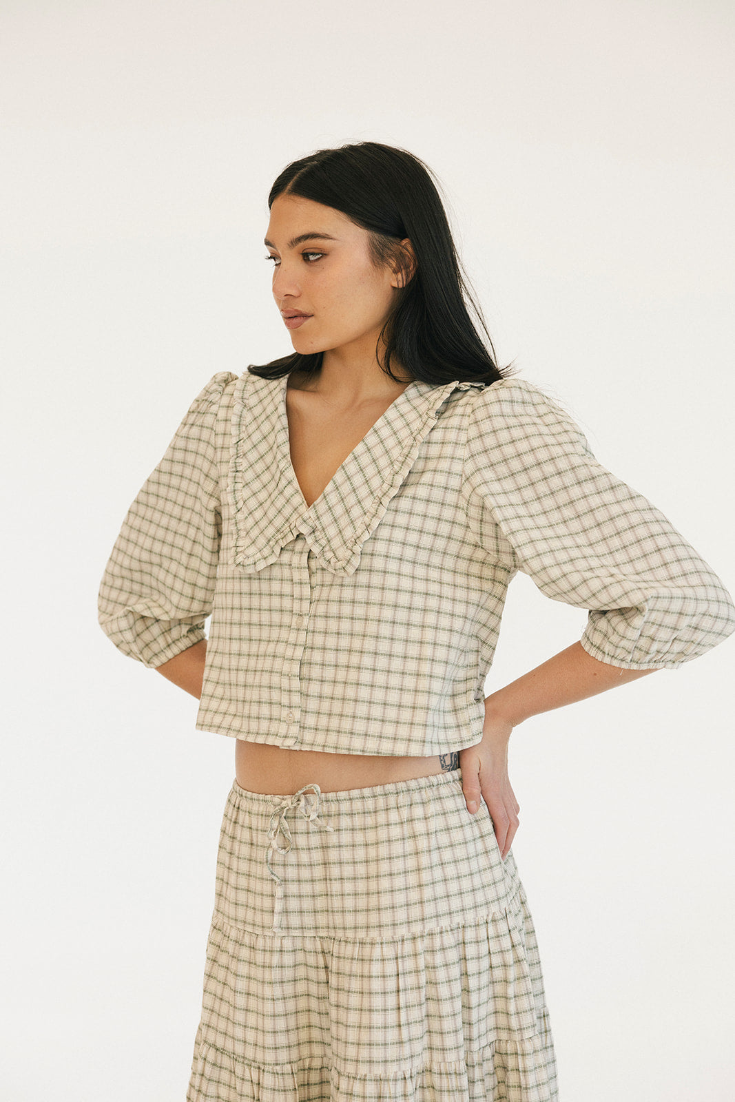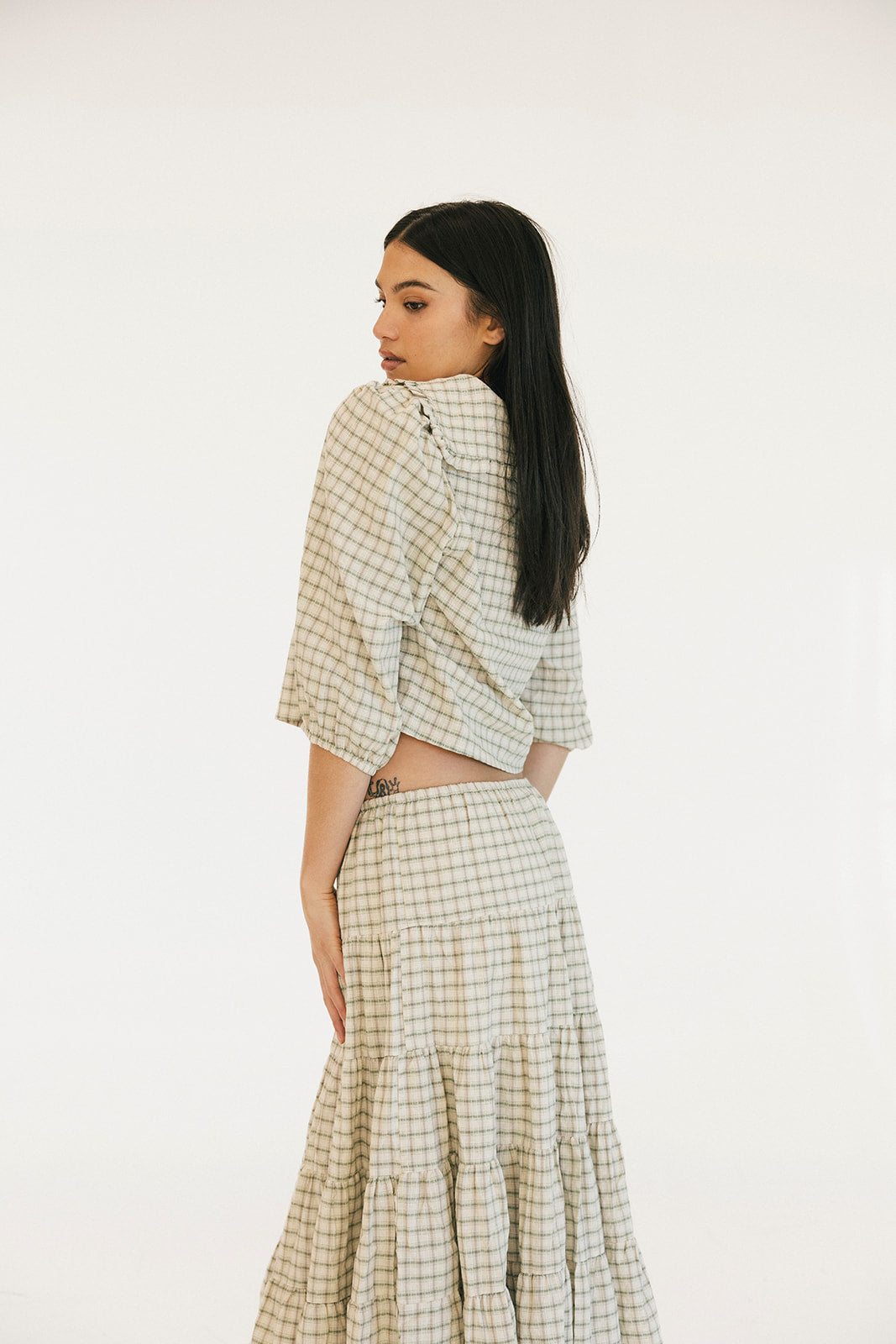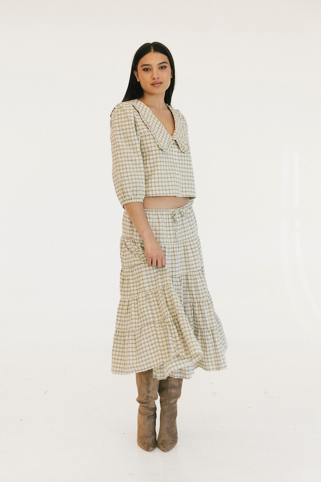 The Casey Plaid Skirt in Olive is a versatile wardrobe essential that combines comfort with effortless style. Crafted from a lightweight cotton blend, this midi skirt features a flattering tiered silhouette with gathered seams that create beautiful movement and dimension. The elastic waistband with adjustable tie ensures a personalized fit that works for your body, making it easy to slip on and feel confident throughout your day. Perfect for layering or wearing solo, this piece transitions seamlessly from casual outings to relaxed gatherings.