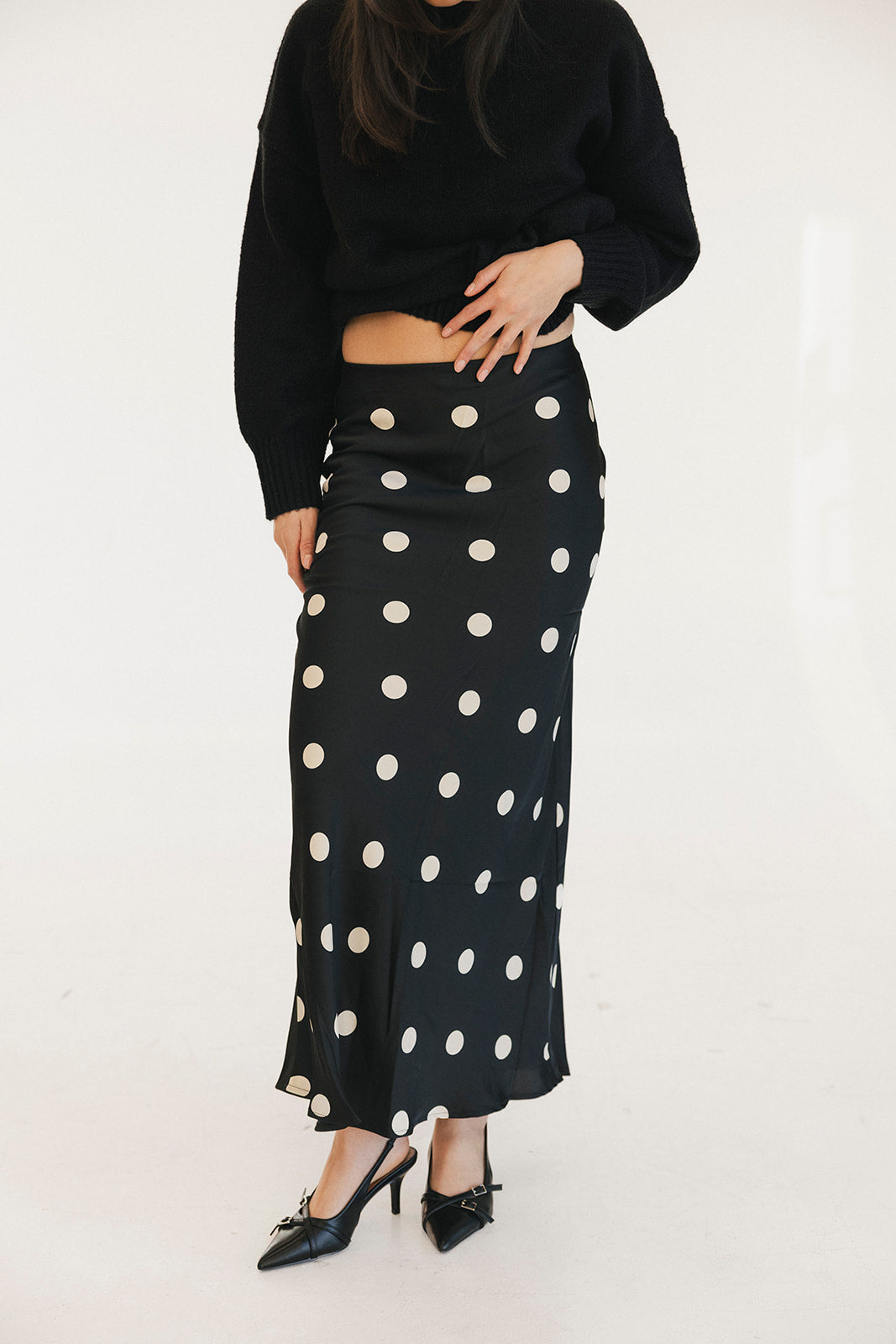 Elevate your everyday style with the Casey Satin Midi Skirt, featuring a timeless black and cream polka dot pattern that works beautifully for any occasion. The luxurious satin fabric drapes gracefully, creating an elegant silhouette that flatters all body types. An elastic waist ensures all-day comfort without sacrificing sophistication, making this midi skirt perfect for both casual outings and dressed-up events. Pair it with your favorite blouse or sweater for a polished look you'll love wearing again and again.