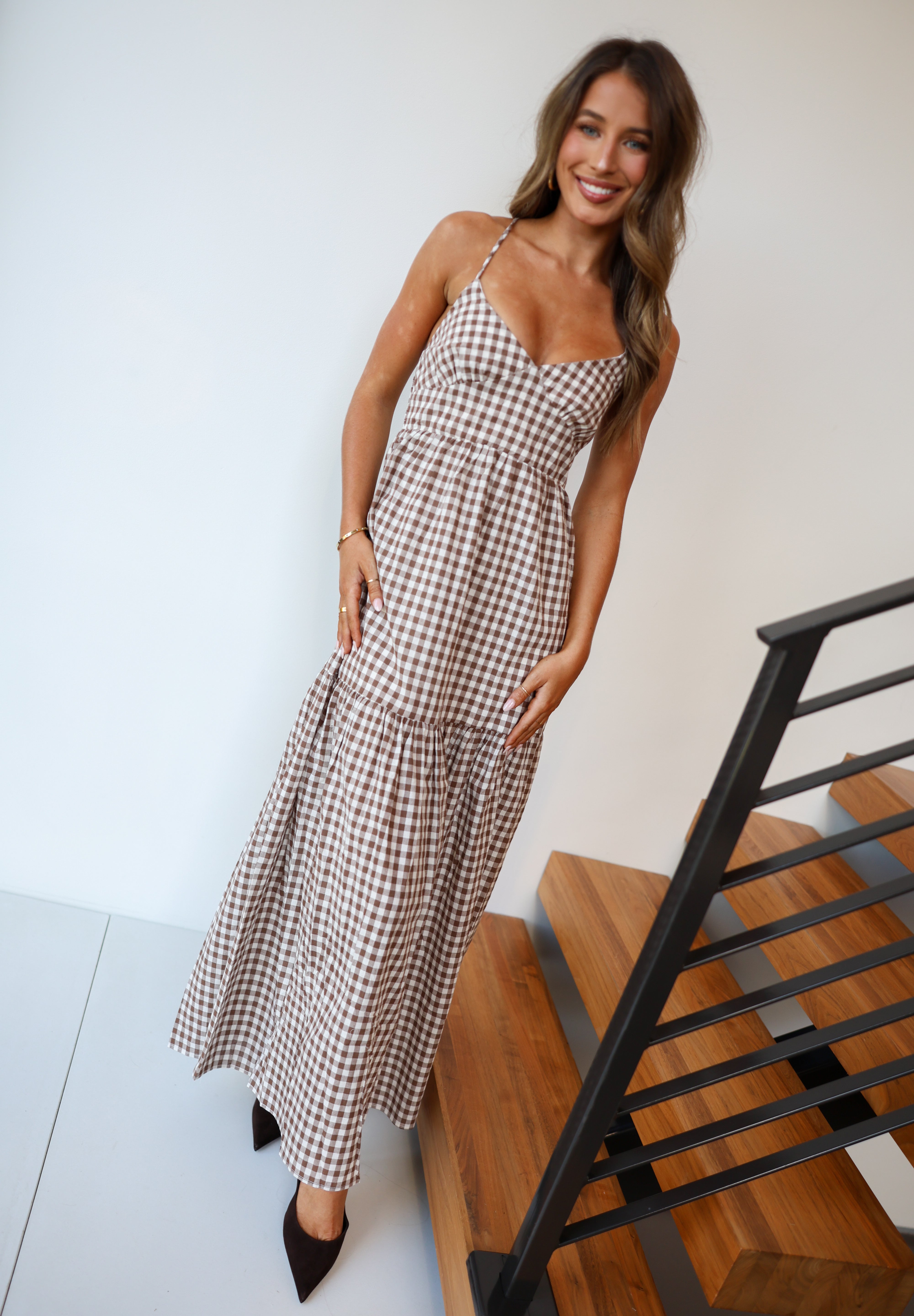 Polly Gingham Tiered Maxi Dress - Brown
