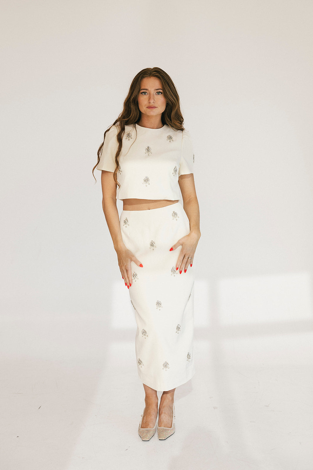 Jewel Embellished Top And Midi Skirt Set - Cream