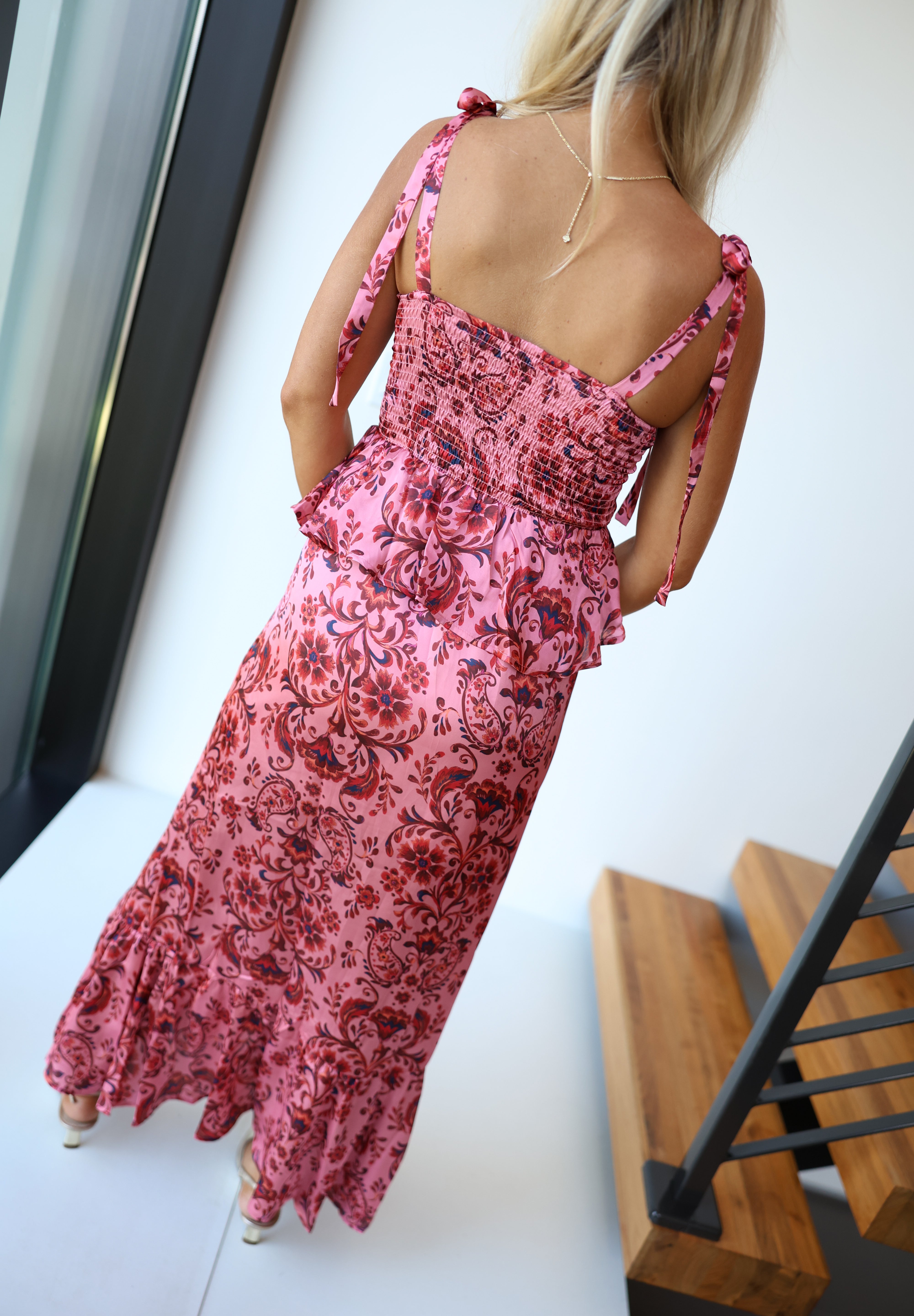 The Alma Floral Peplum Maxi Dress in Salmon Red offers a flattering fit with its sweetheart neckline and tie shoulder straps, highlighting your feminine silhouette. The peplum waist shapes your figure gracefully, while the full-length skirt’s subtle ruffle tiers add elegant movement. Crafted from lightweight fabric, this dress keeps you comfortable and polished throughout the day, making it perfect for both casual outings and special events. Embrace effortless style and confidence with this romantic, timeless piece.
