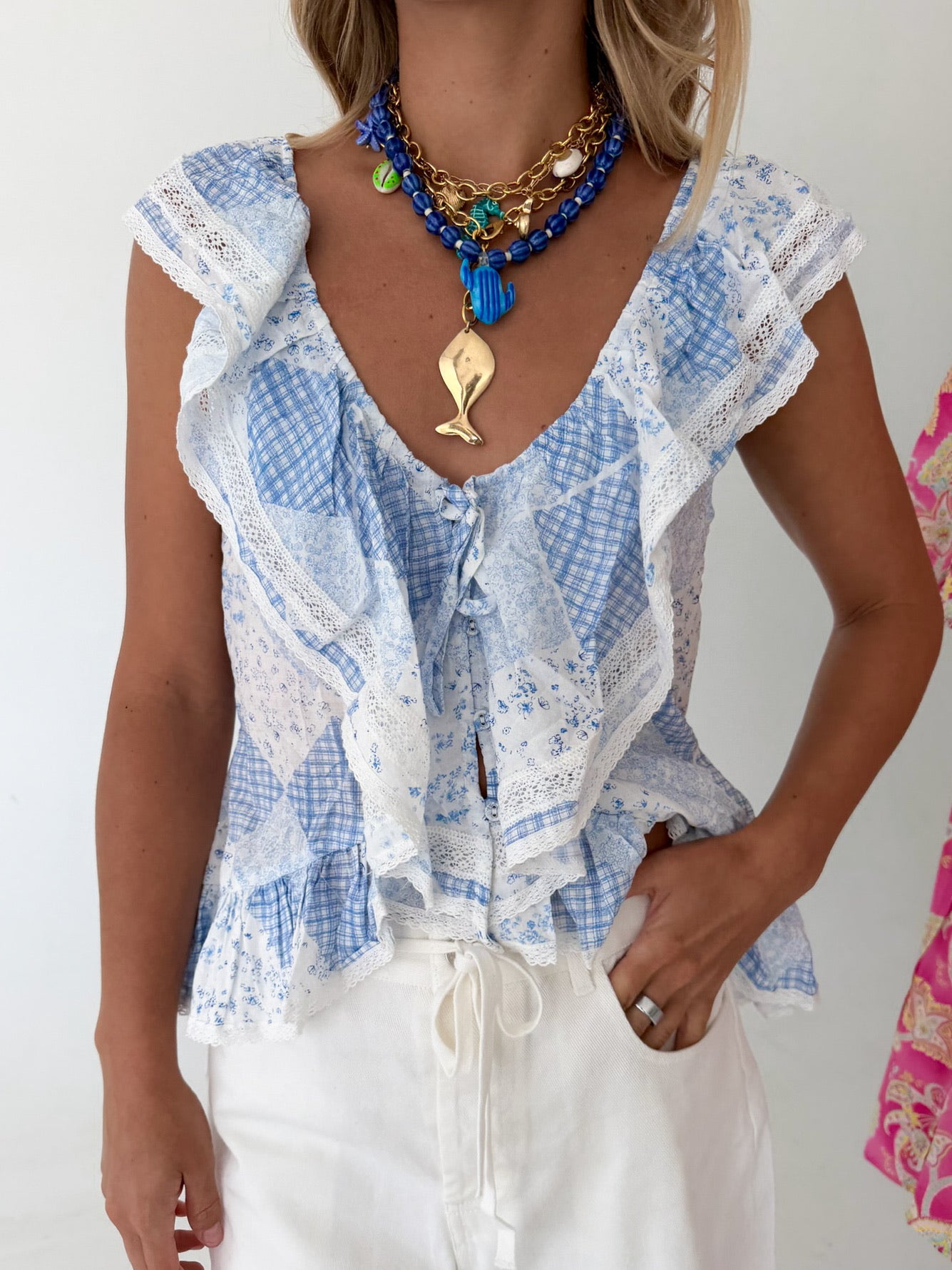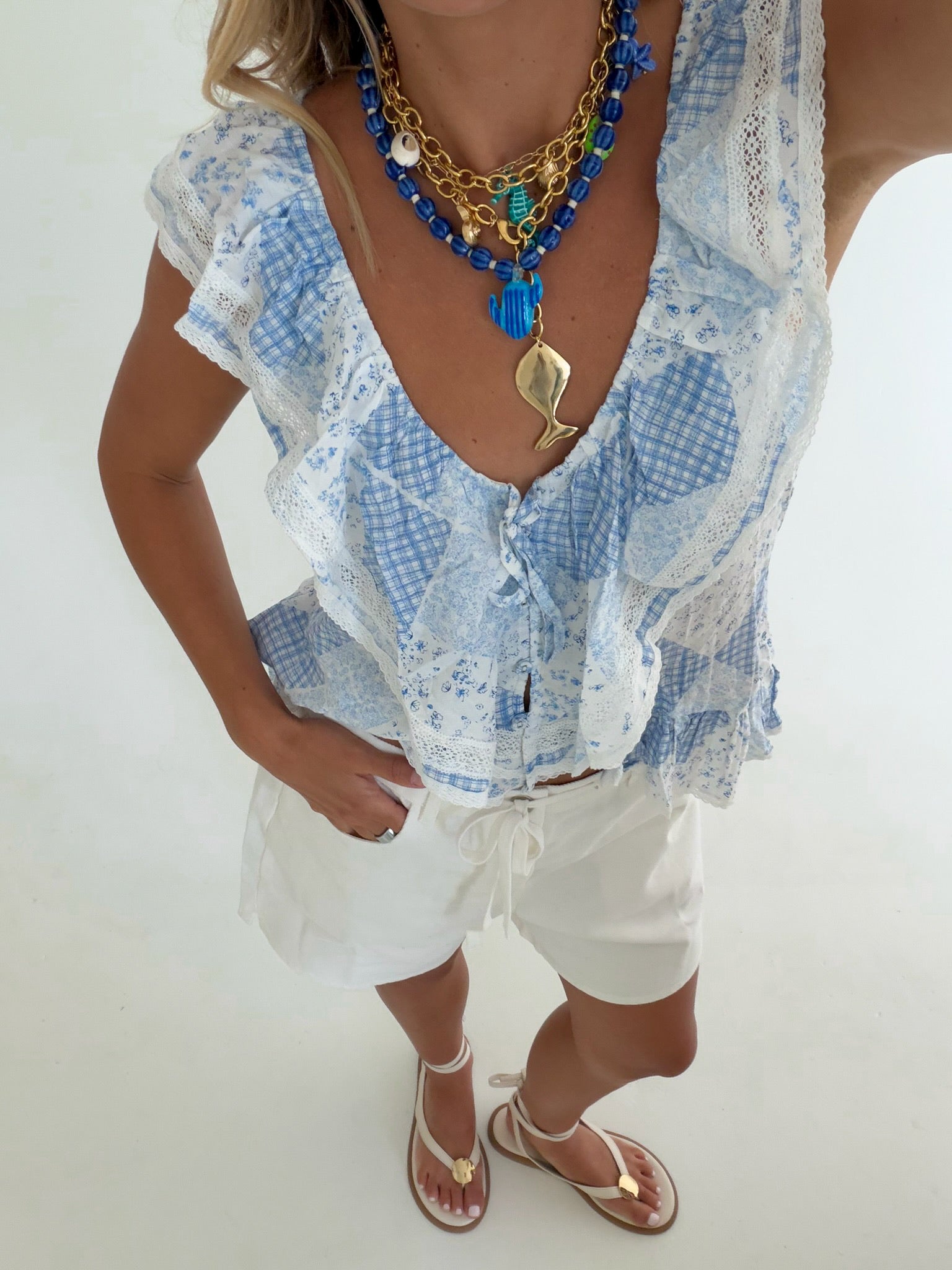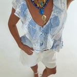 Soft baby blue fabric flows effortlessly in this charming cascading ruffle wing sleeve top. The dramatic wing sleeves feature layered ruffles that create movement and dimension, perfect for adding a touch of elegance to any outfit. The relaxed fit and lightweight material make it comfortable for all-day wear, while the delicate ruffle details elevate your style. Pair it with jeans, skirts, or trousers for a versatile look that transitions seamlessly from casual to dressy occasions.