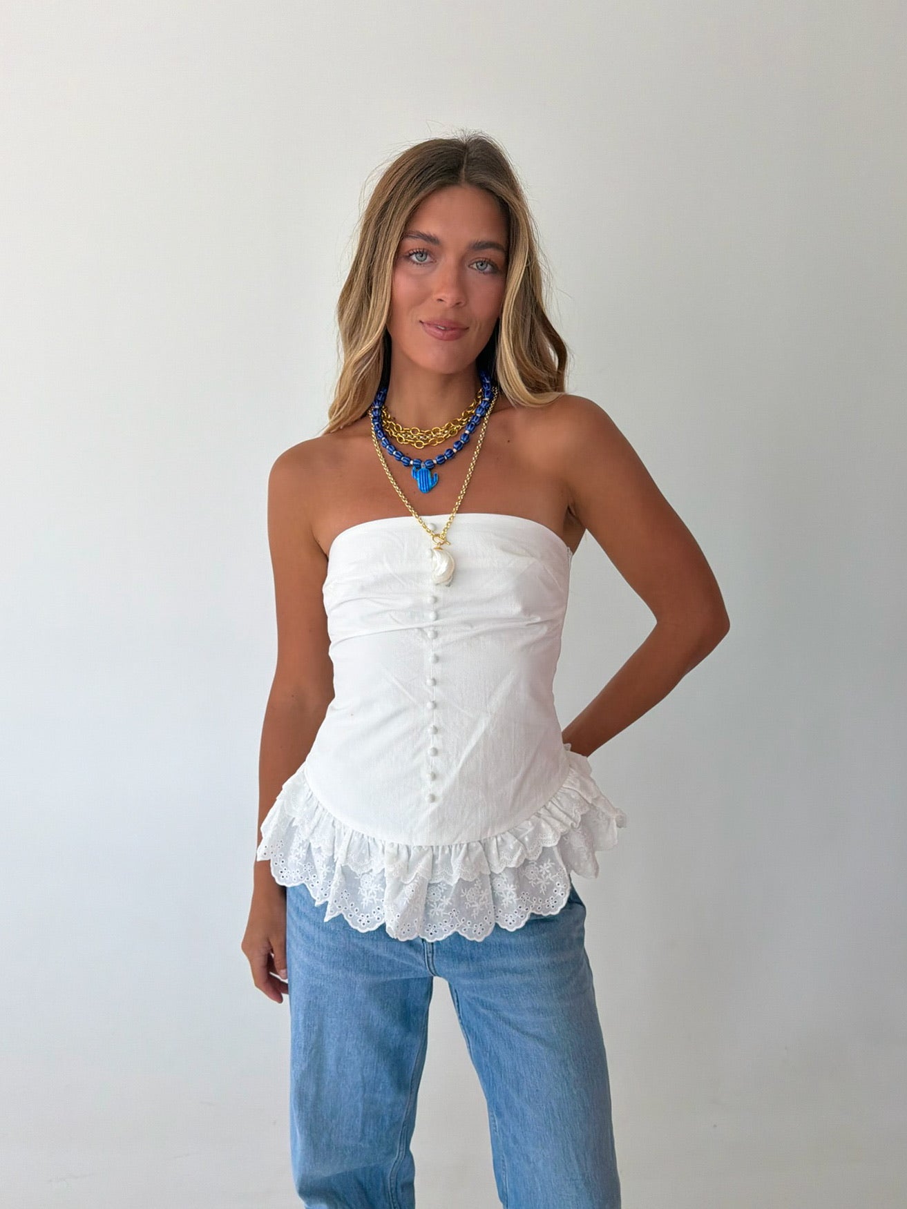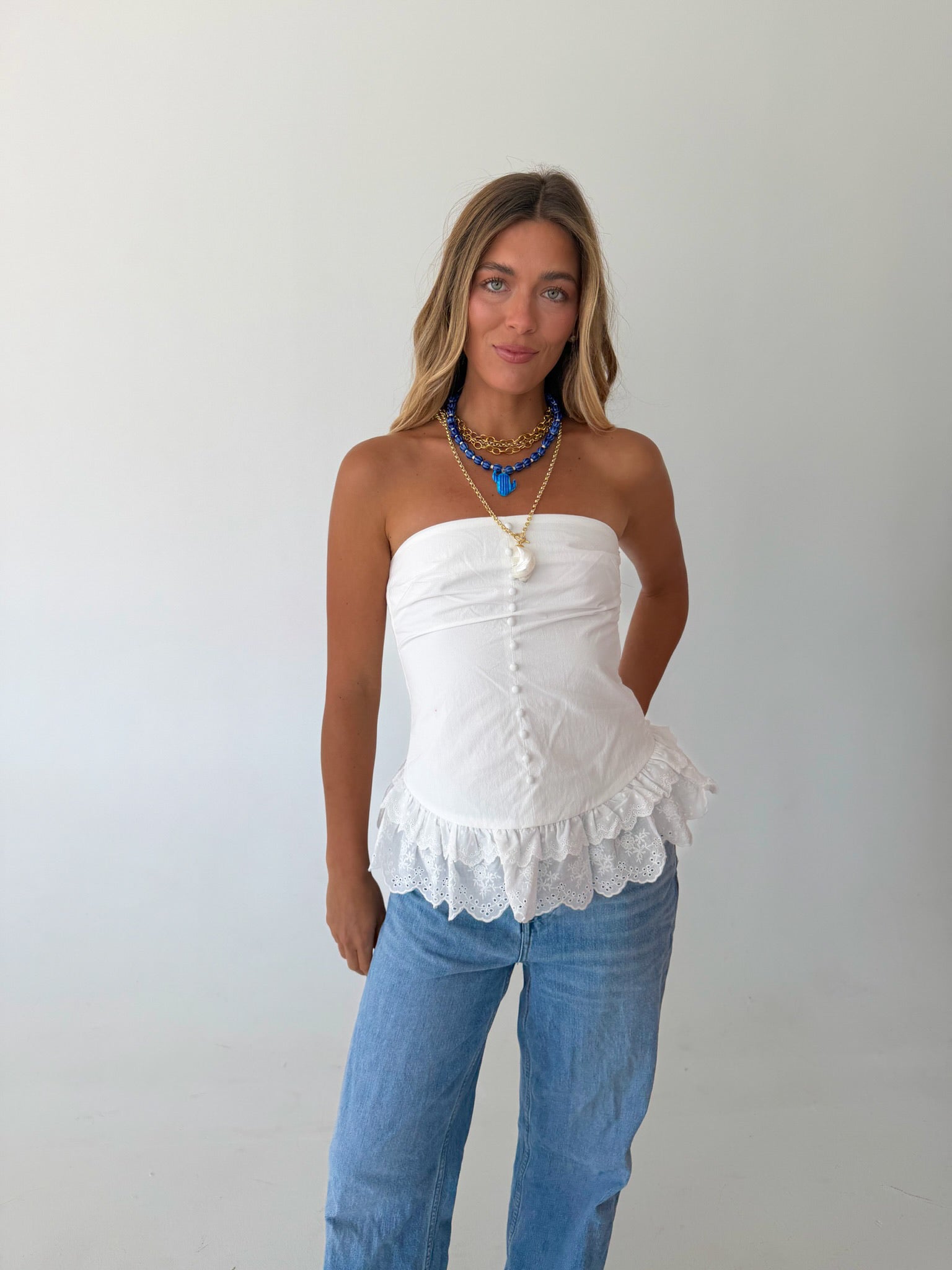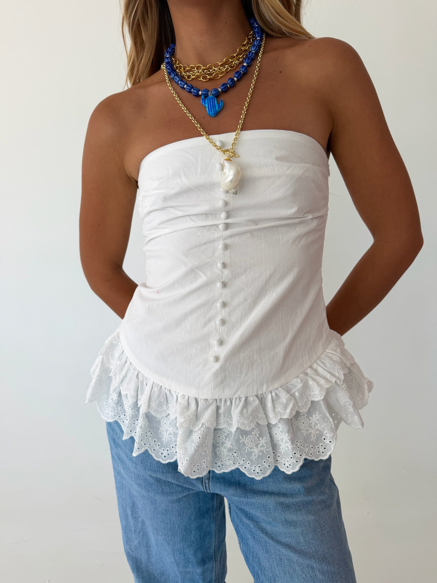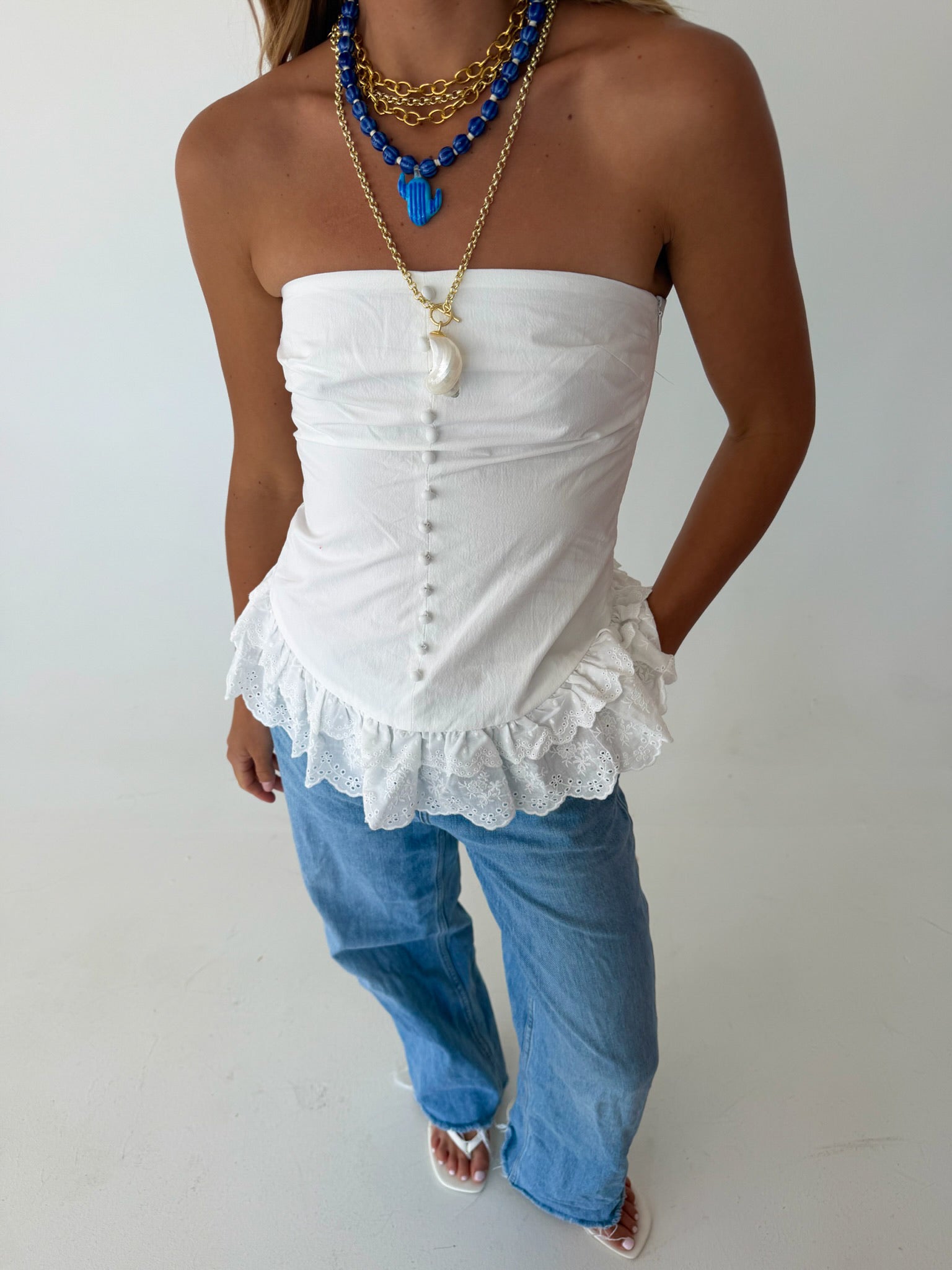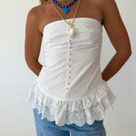 Effortless elegance meets playful style with this poplin tube top. The front button closure adds a touch of sophistication, while delicate lace detailing at the hem creates a feminine finish. Perfect for layering or wearing solo, this versatile piece transitions seamlessly from casual days to evening outings. The structured poplin fabric provides comfortable support and a polished look that works with everything in your wardrobe.