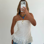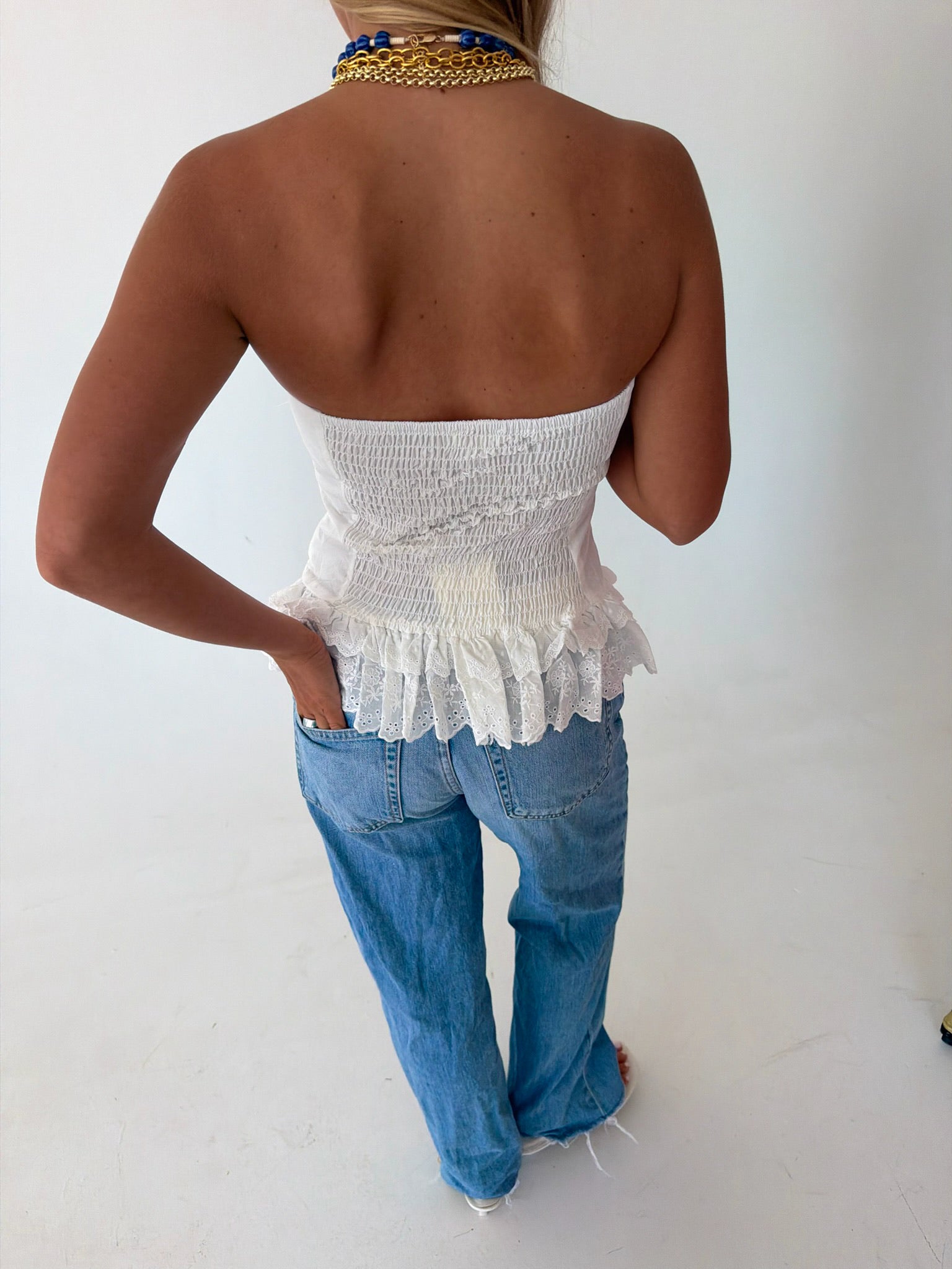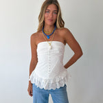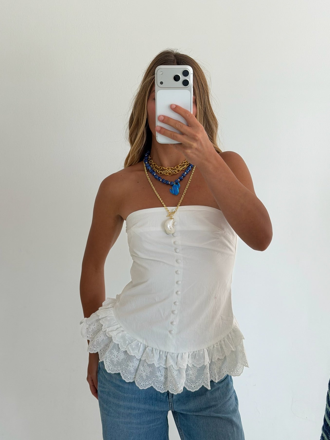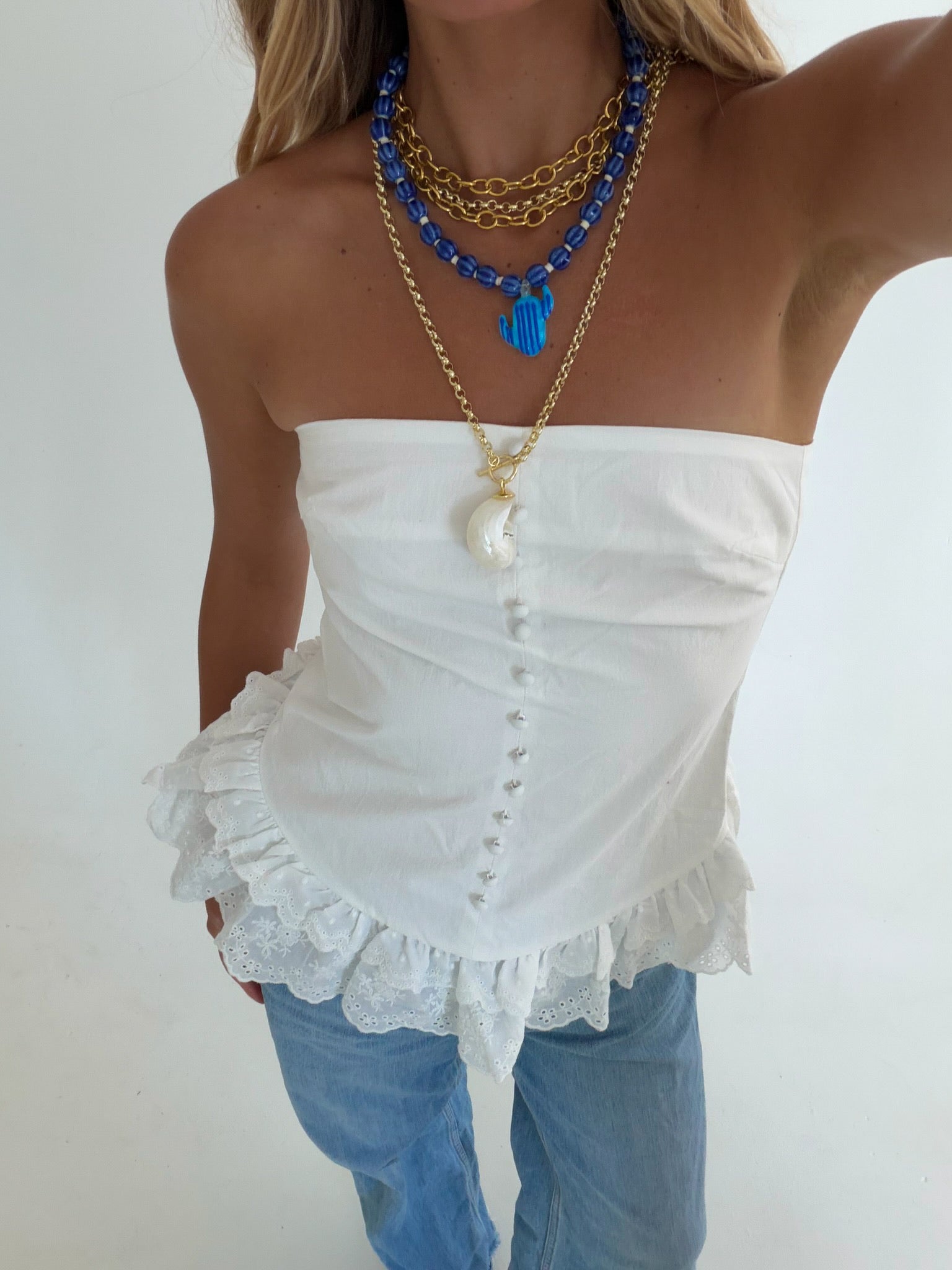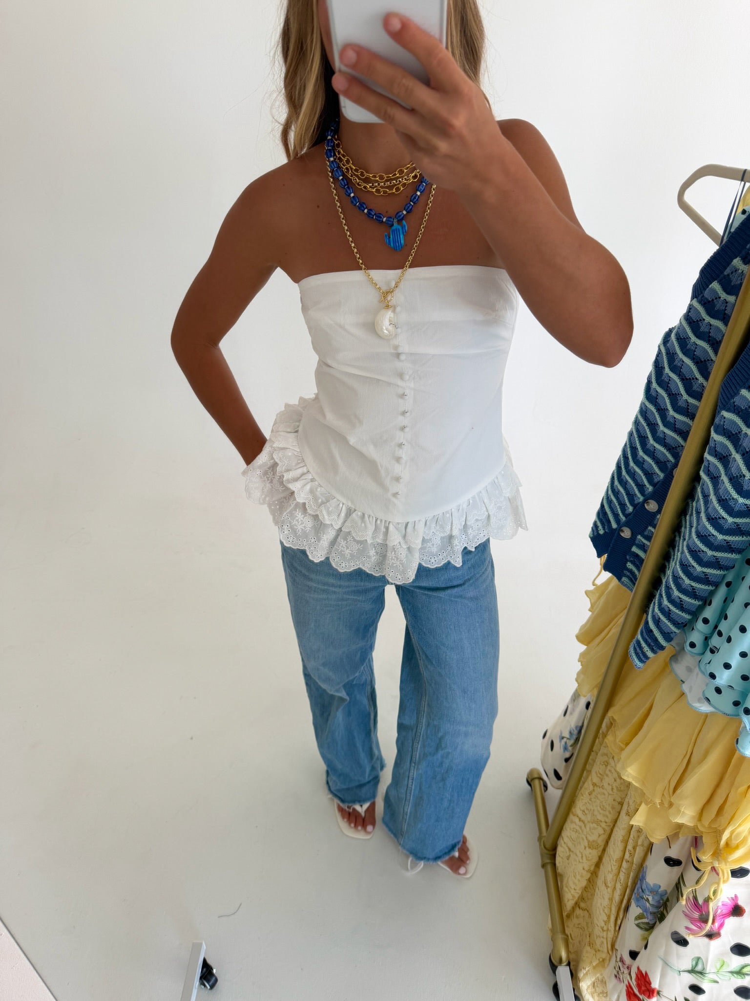 Effortless elegance meets playful style with this poplin tube top. The front button closure adds a touch of sophistication, while delicate lace detailing at the hem creates a feminine finish. Perfect for layering or wearing solo, this versatile piece transitions seamlessly from casual days to evening outings. The structured poplin fabric provides comfortable support and a polished look that works with everything in your wardrobe.