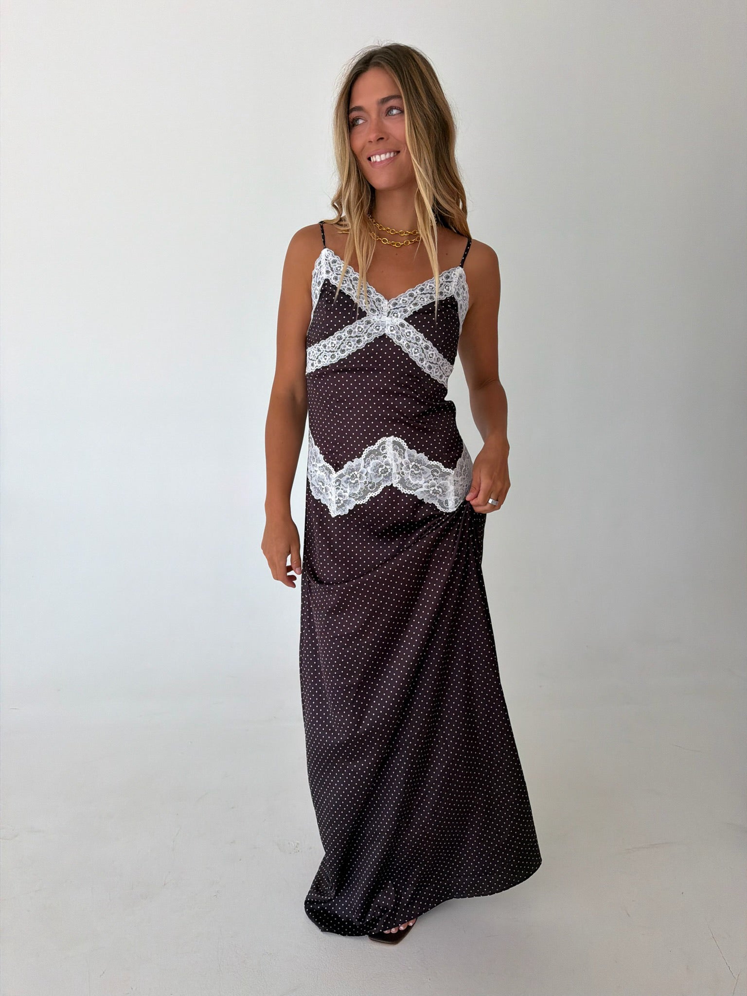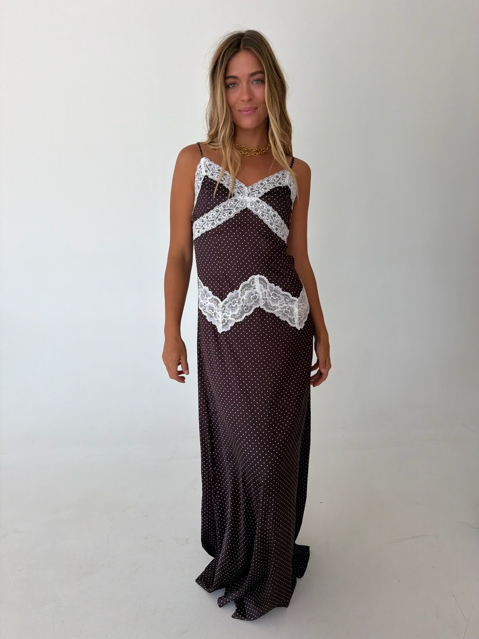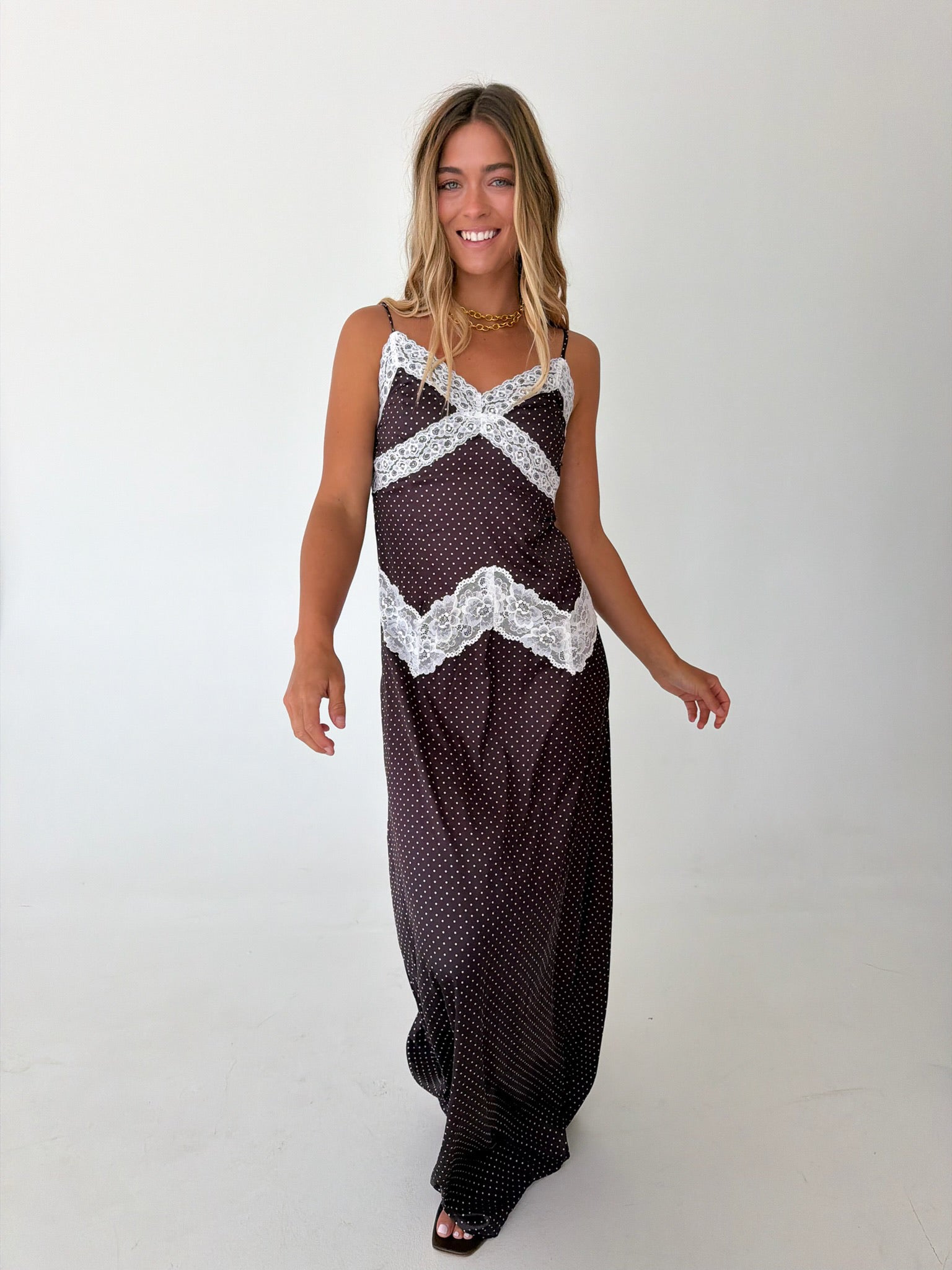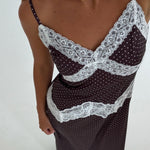 Effortless elegance meets playful charm in this midi slip dress. The soft polka dot pattern pairs beautifully with delicate lace trim detailing along the neckline and hem, creating a romantic silhouette. Perfect for brunch dates, casual outings, or layering under your favorite cardigan. The slip dress design offers versatile styling options—wear it solo or as a chic layering piece. Smooth, comfortable fabric drapes gracefully for all-day wear.