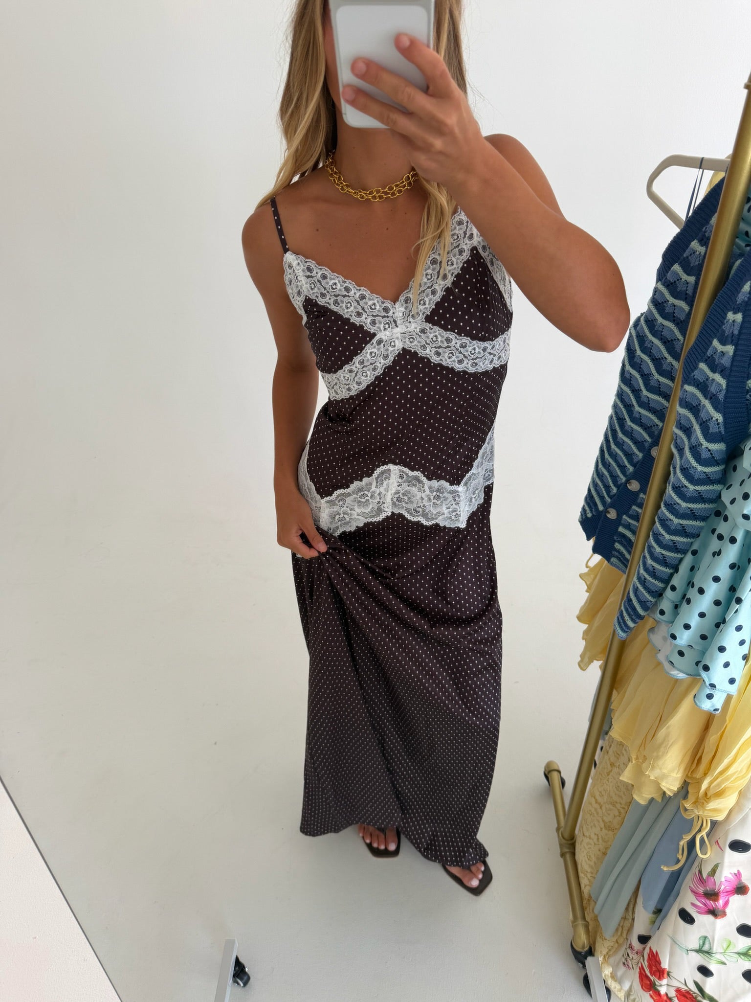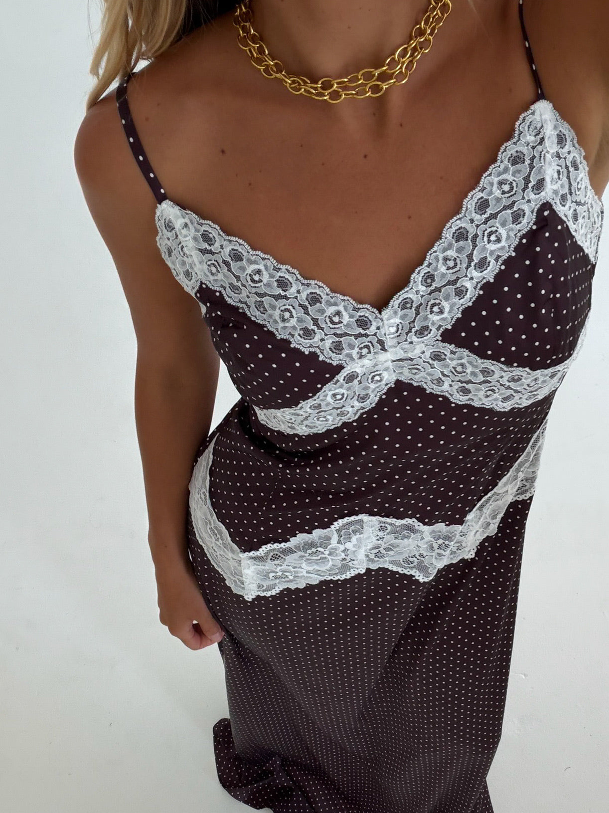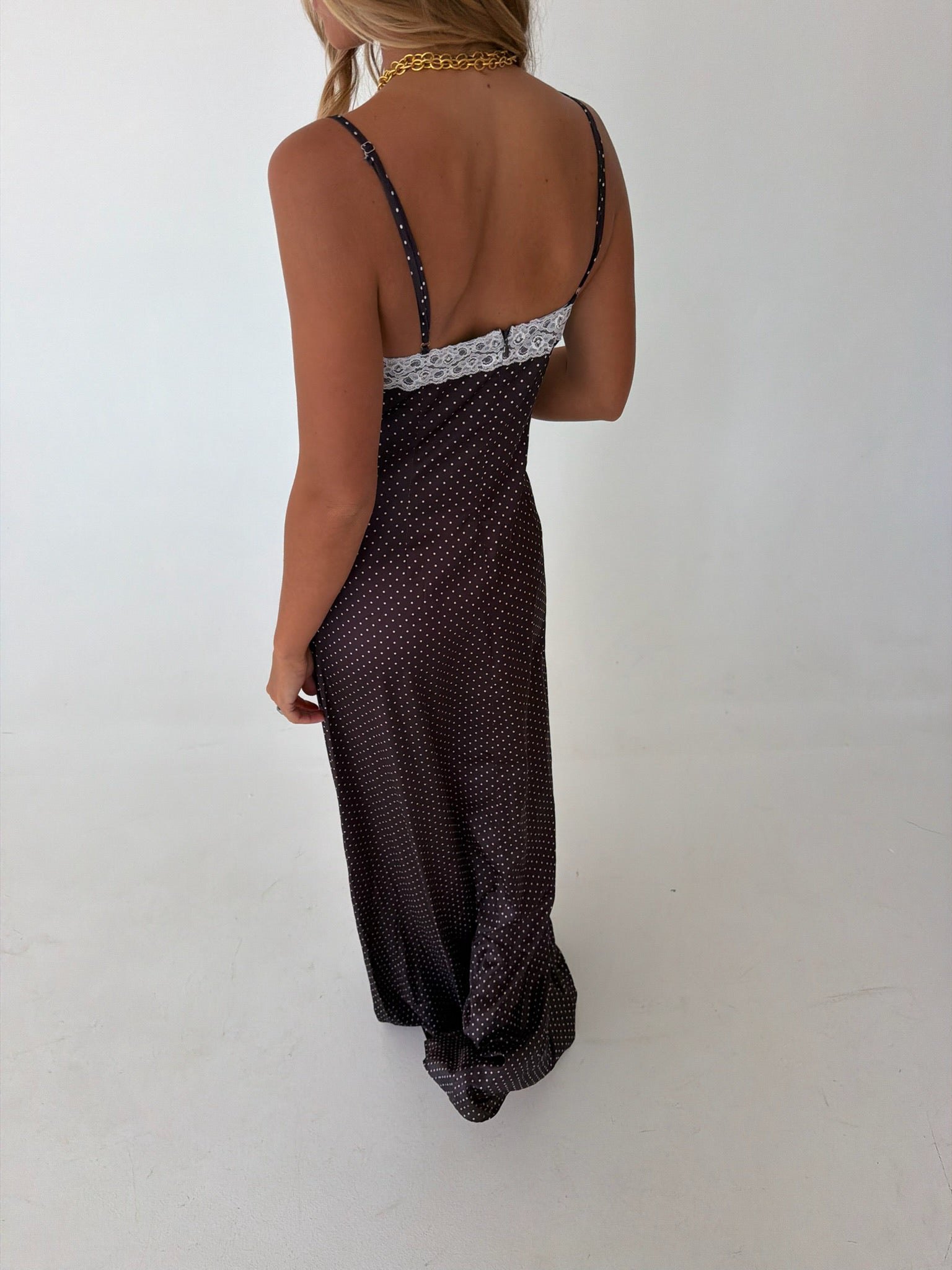 Effortless elegance meets playful charm in this midi slip dress. The soft polka dot pattern pairs beautifully with delicate lace trim detailing along the neckline and hem, creating a romantic silhouette. Perfect for brunch dates, casual outings, or layering under your favorite cardigan. The slip dress design offers versatile styling options—wear it solo or as a chic layering piece. Smooth, comfortable fabric drapes gracefully for all-day wear.