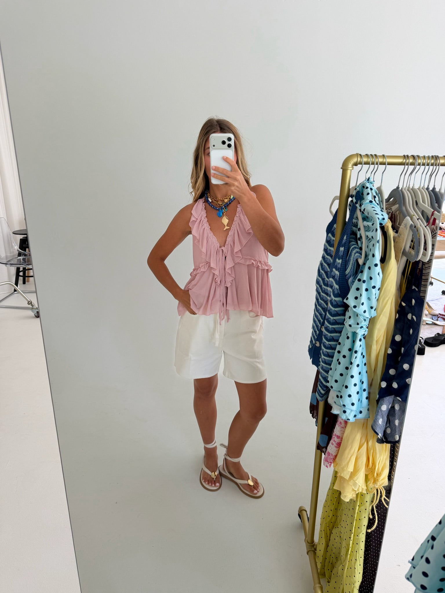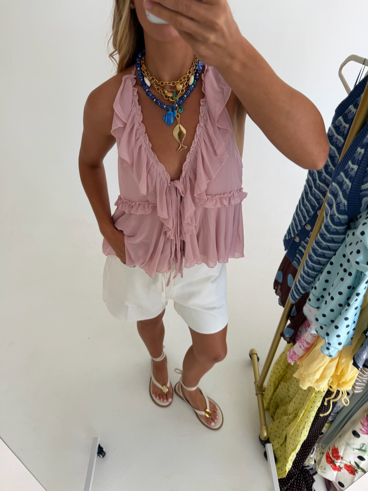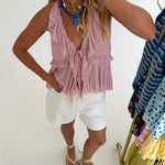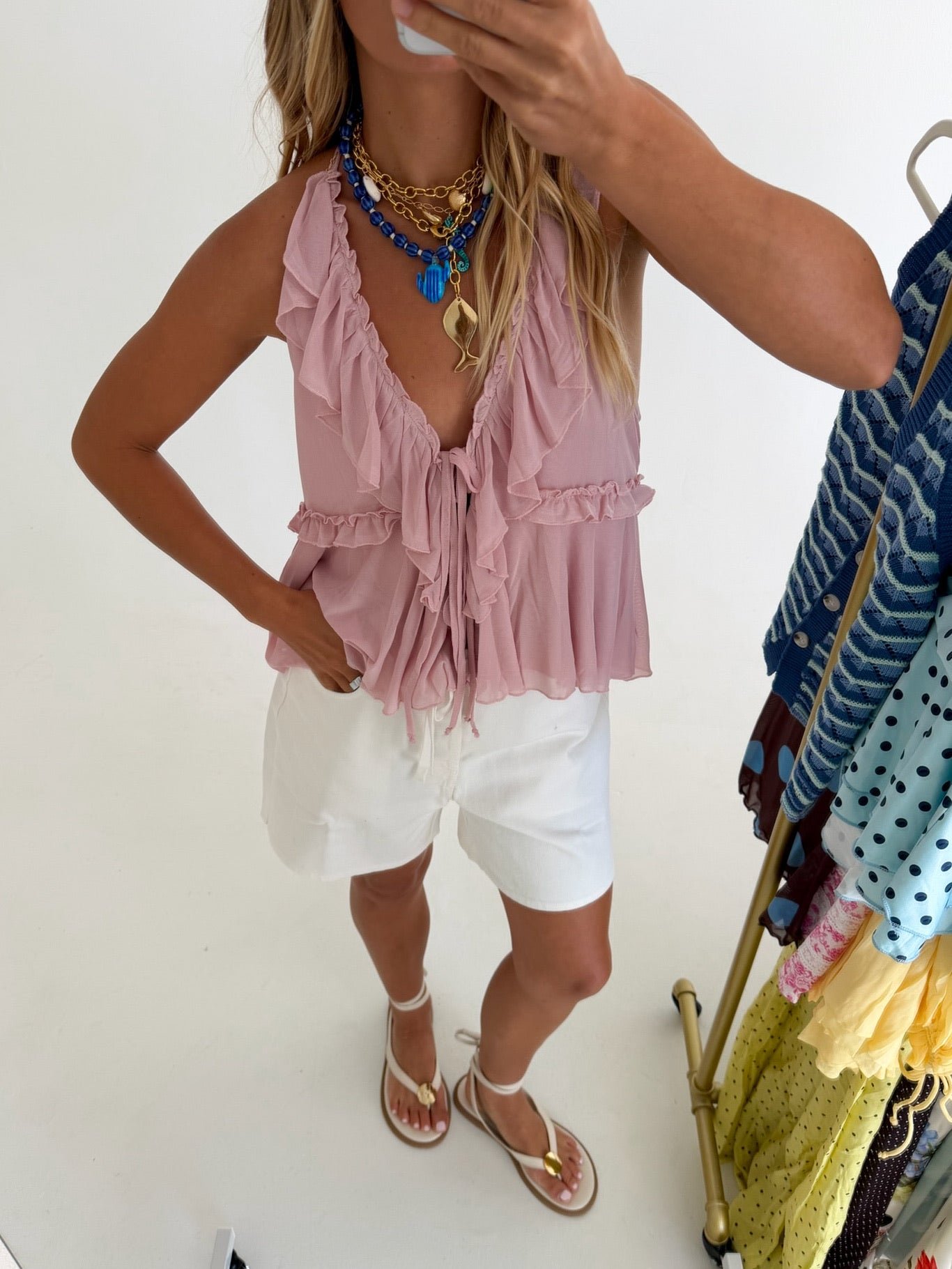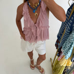 Elevate your wardrobe with this stunning mesh top featuring delicate lace ruffles and double tie details. The sheer mesh fabric creates an airy, feminine silhouette perfect for layering or wearing as a statement piece. Solid color design offers versatility for any occasion—dress it up for nights out or keep it casual with your favorite basics. The double ties at the neckline add a charming, adjustable touch for a customized fit. Lightweight and breathable, this top transitions seamlessly from day to evening wear.