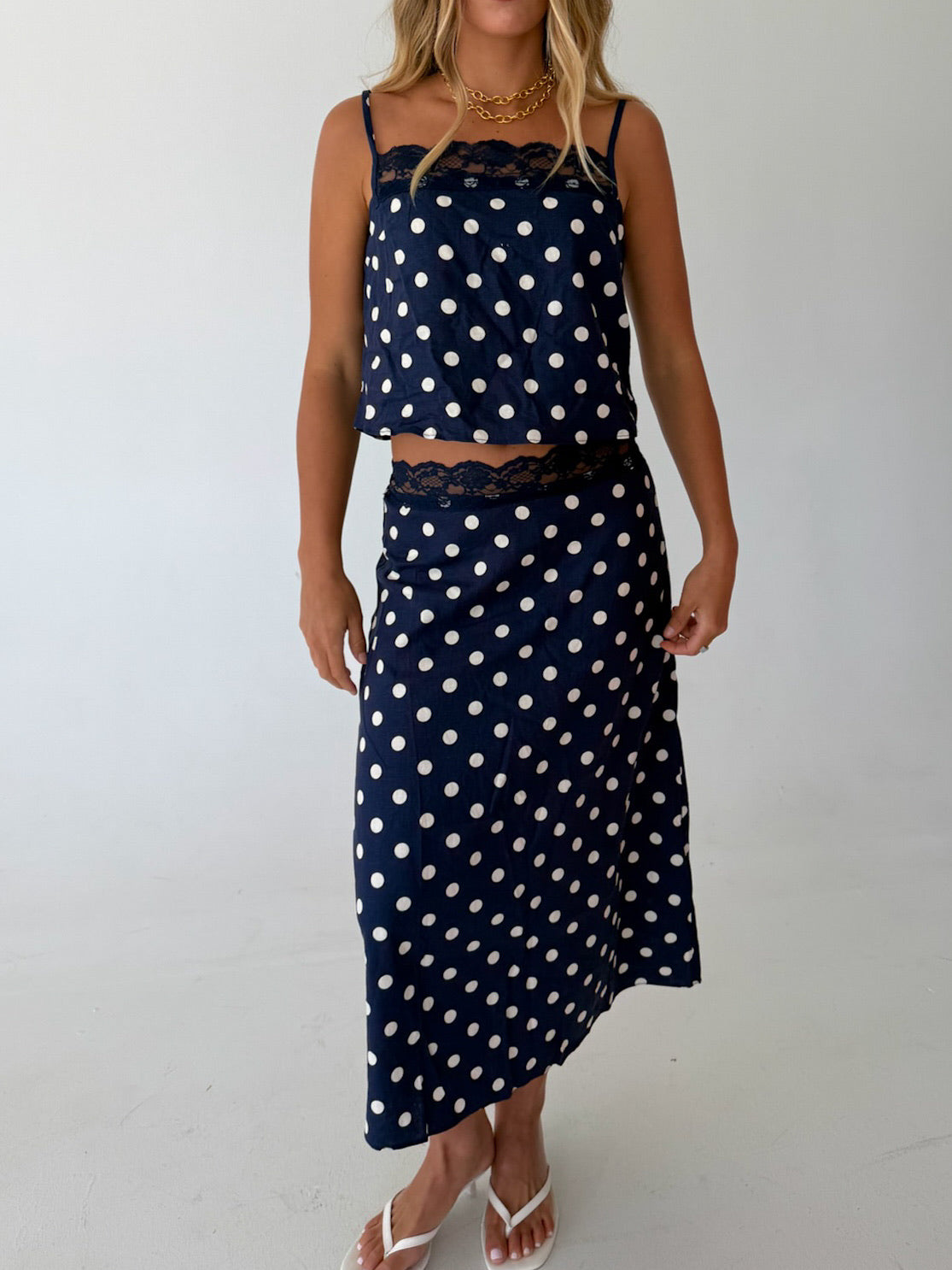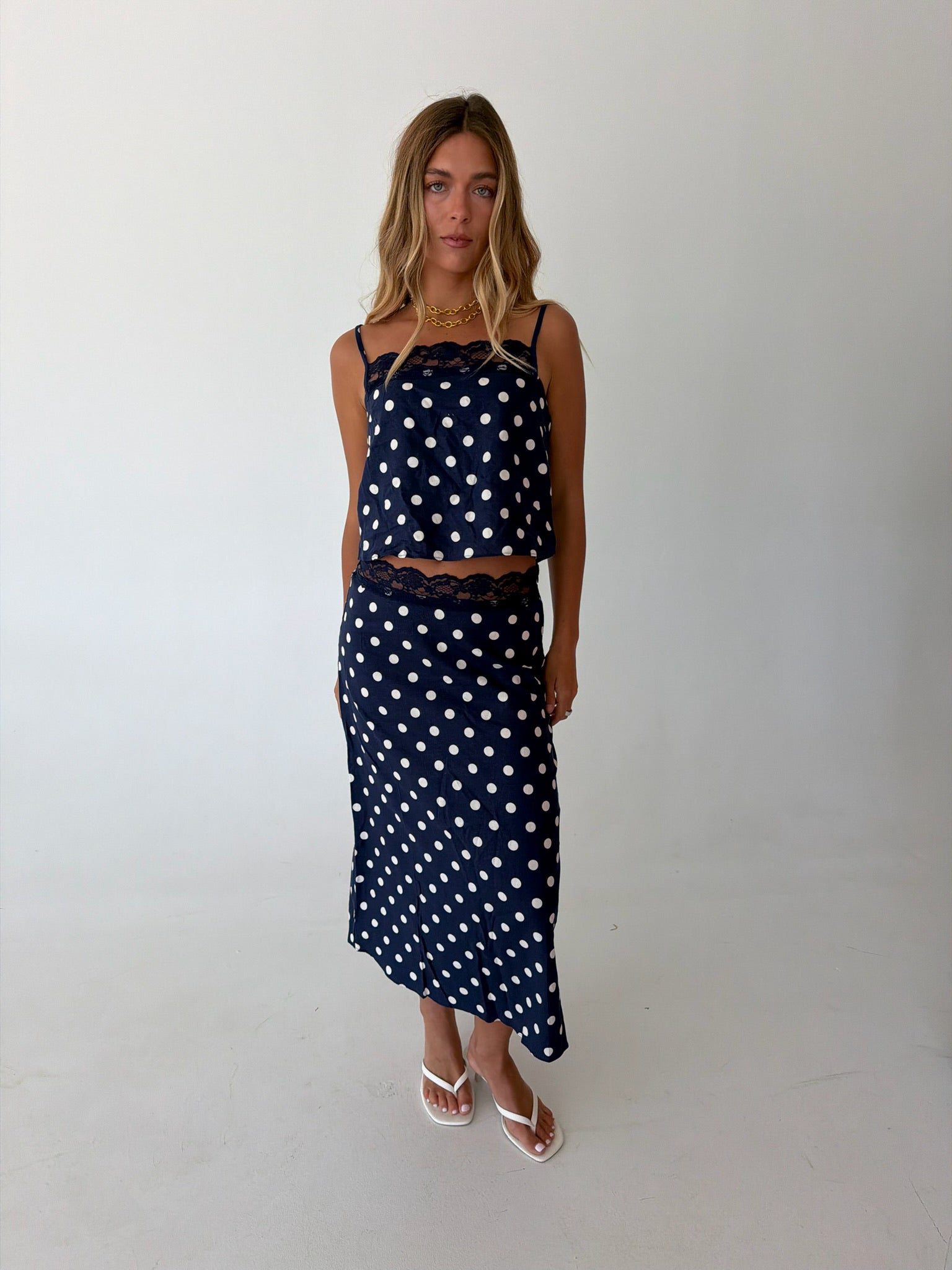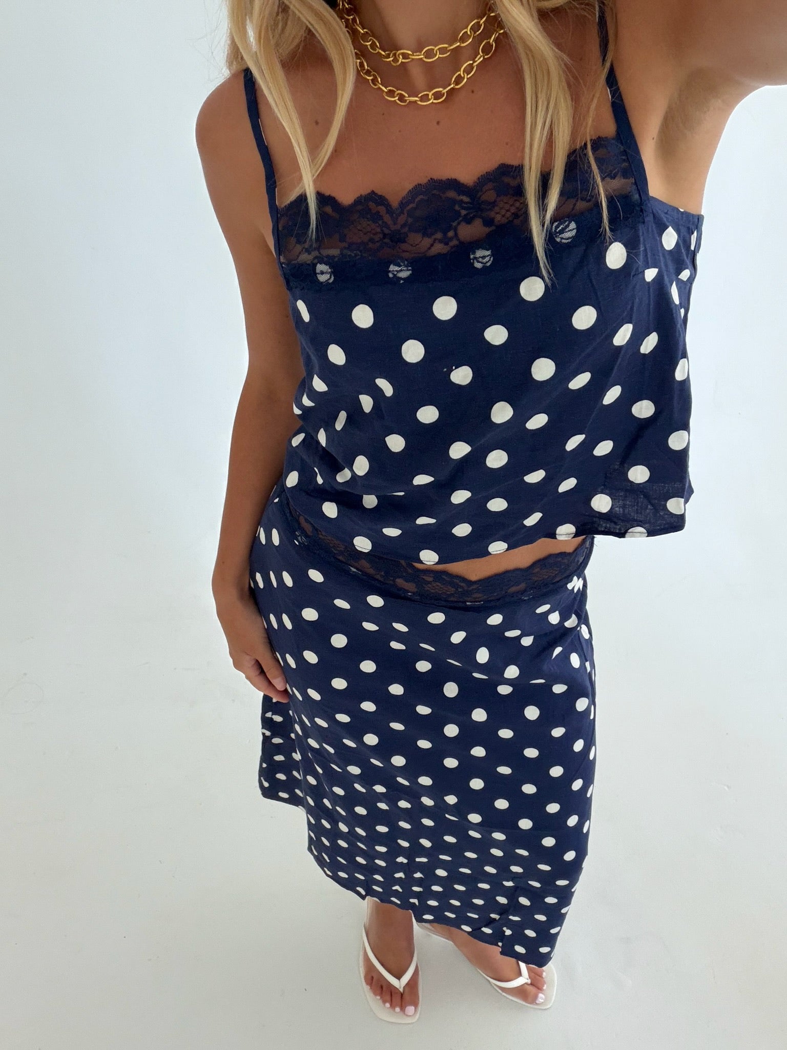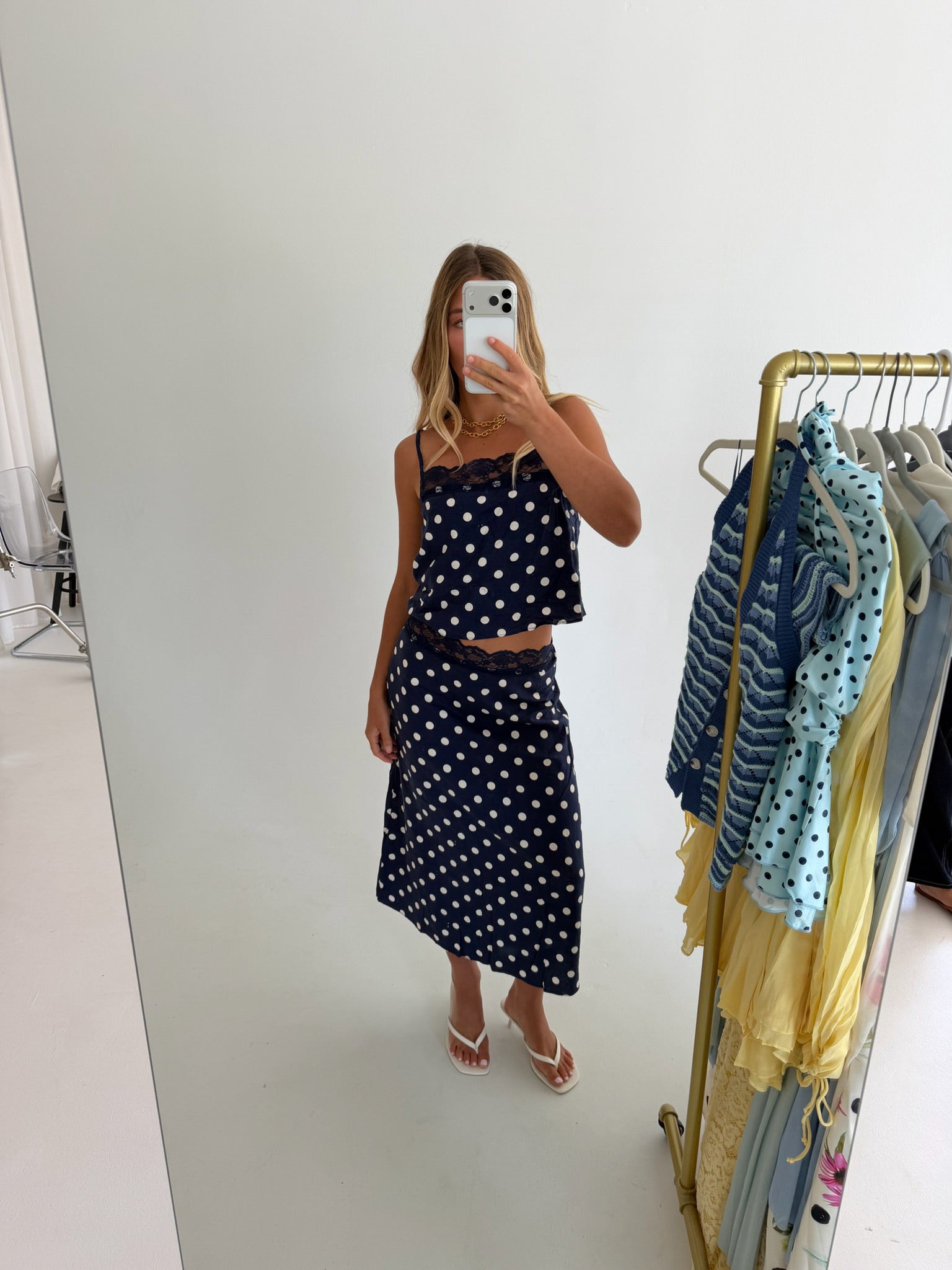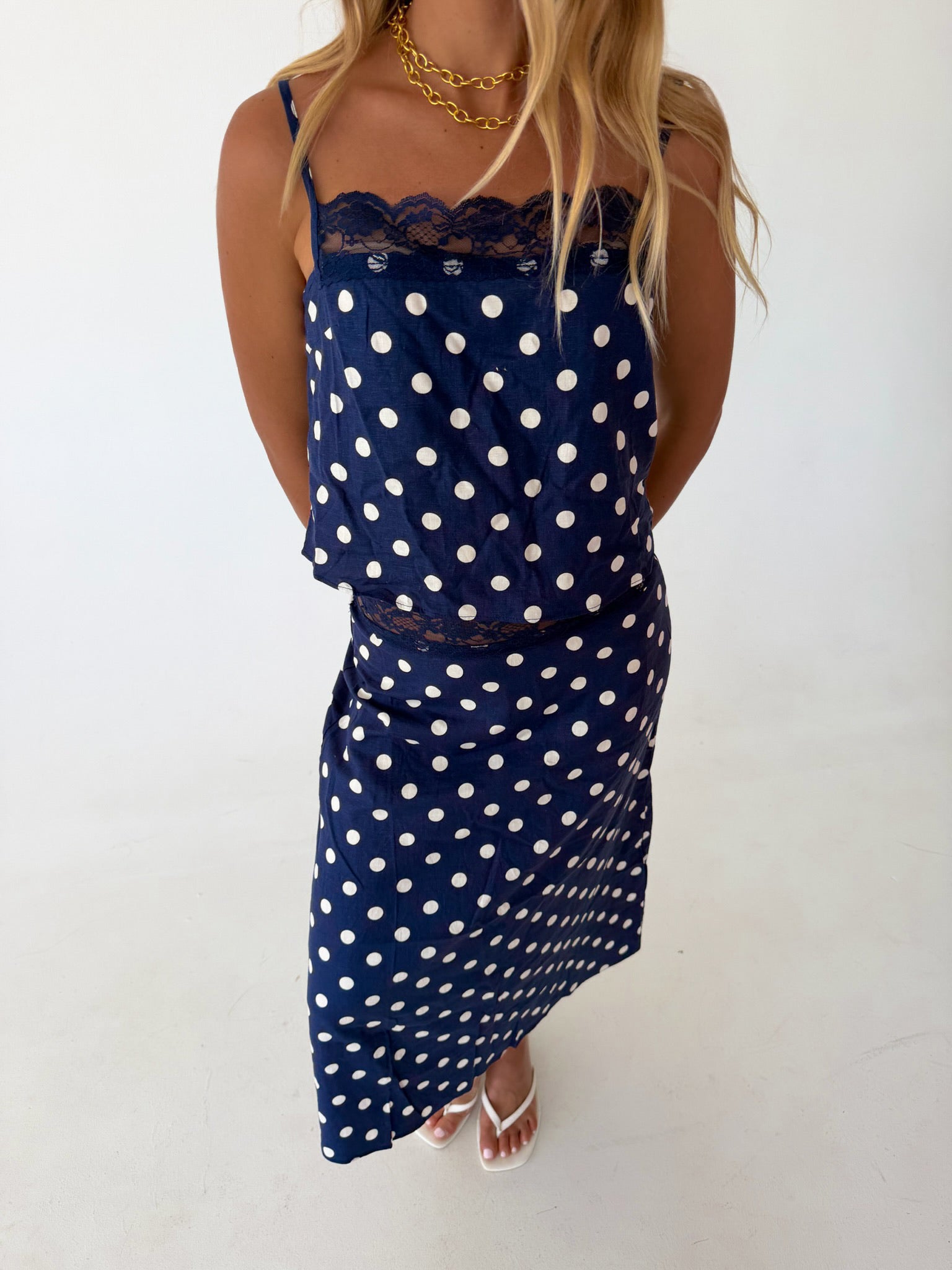 Elegant navy and natural lace trim top featuring delicate polka dot detailing. The Mallory combines timeless sophistication with playful charm, perfect for layering or wearing solo. Soft, breathable fabric with refined lace accents along the neckline and sleeves adds feminine appeal to any wardrobe. Versatile enough for casual outings or dressed up for special occasions.