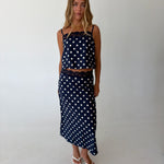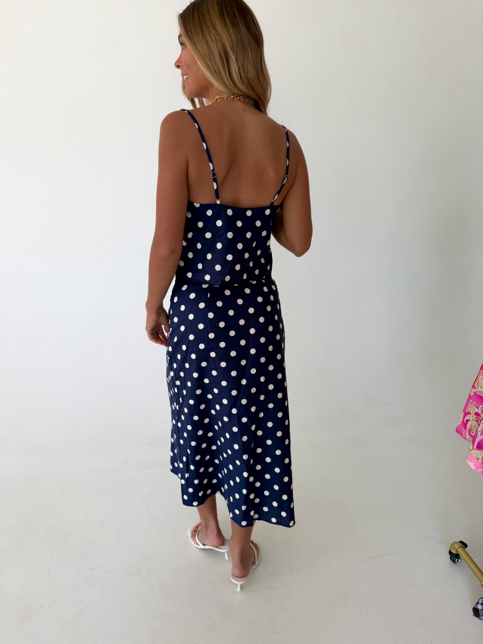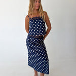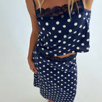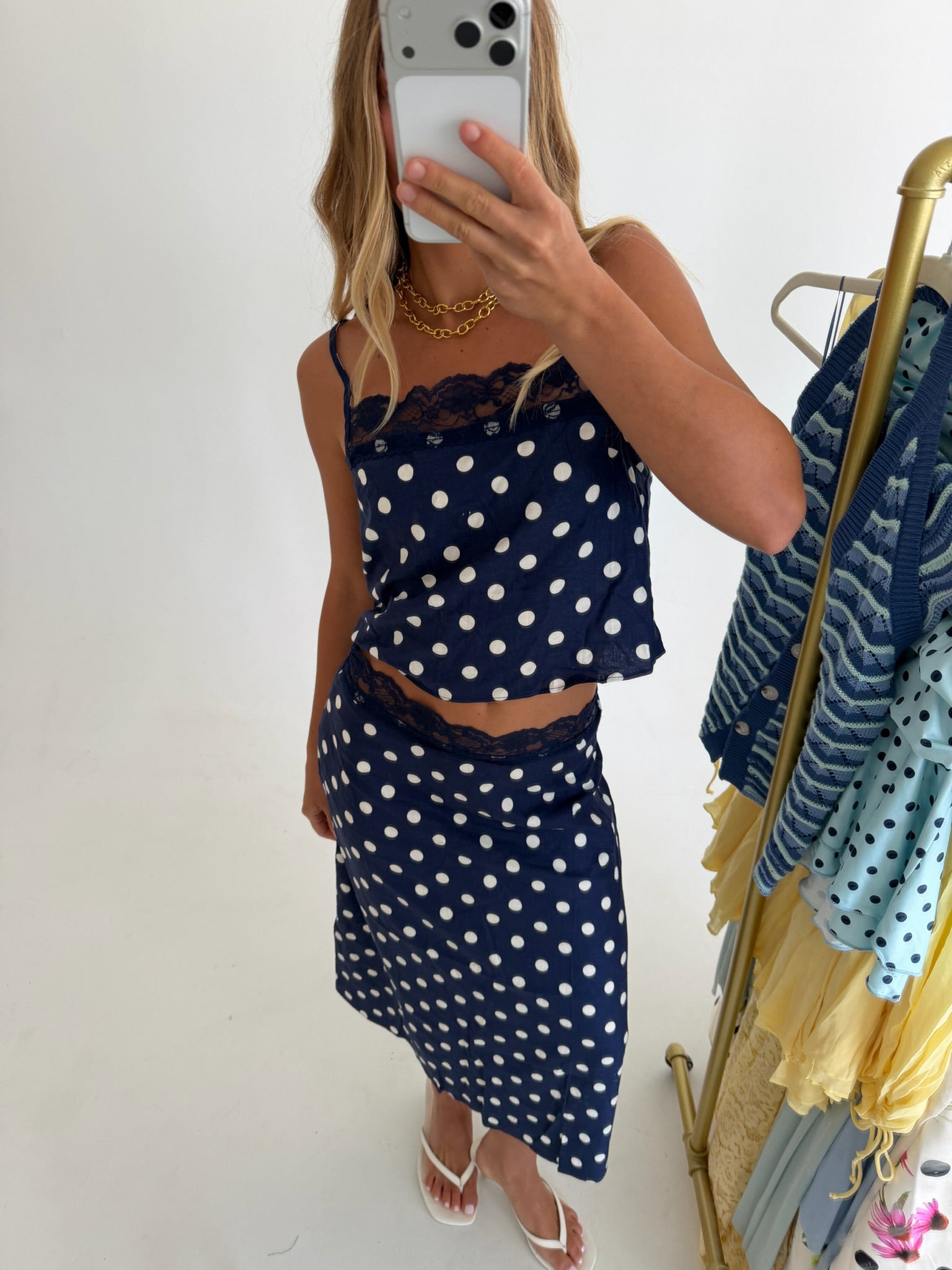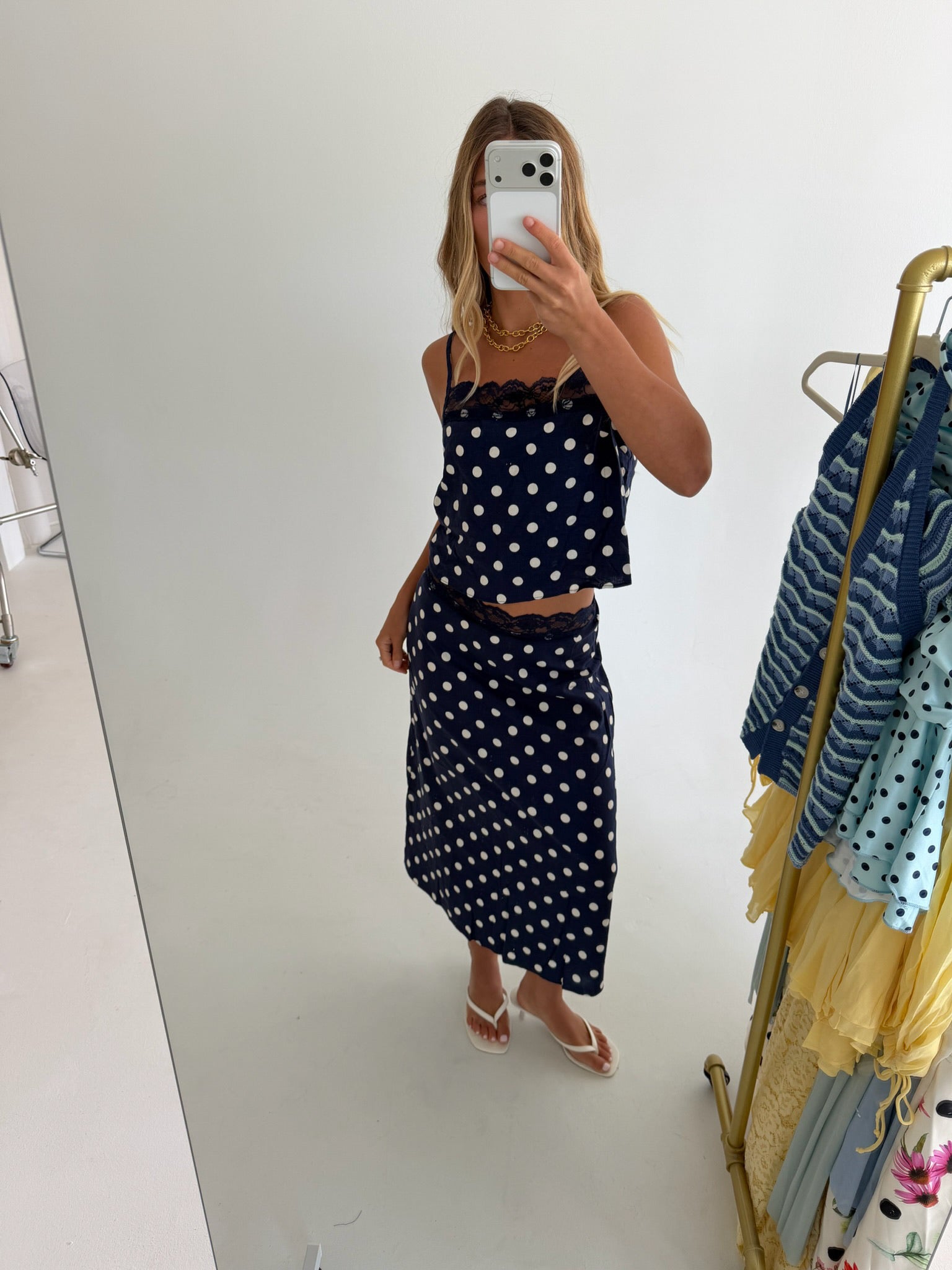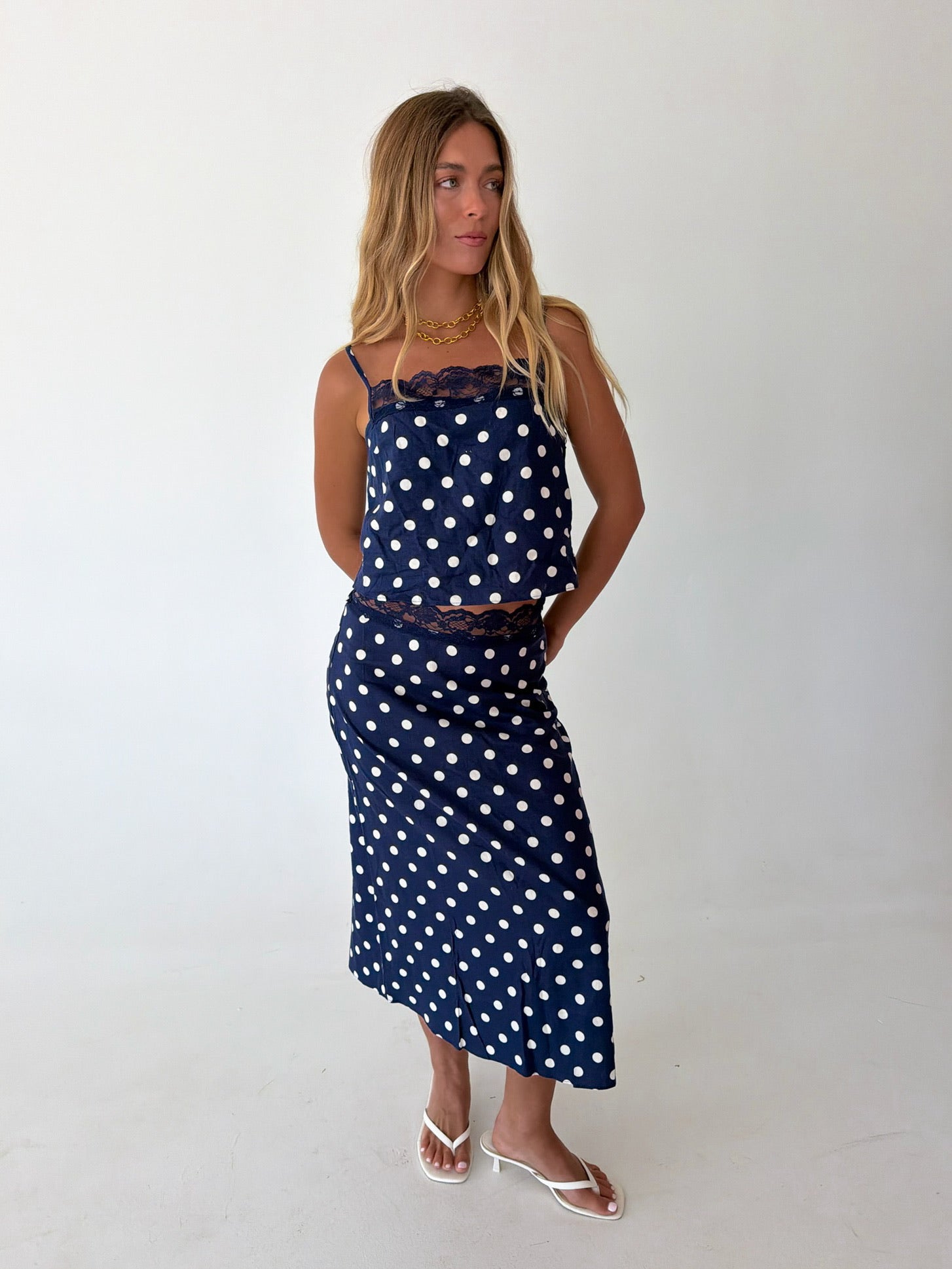 Elegant navy and natural lace trim top featuring delicate polka dot detailing. The Mallory combines timeless sophistication with playful charm, perfect for layering or wearing solo. Soft, breathable fabric with refined lace accents along the neckline and sleeves adds feminine appeal to any wardrobe. Versatile enough for casual outings or dressed up for special occasions.