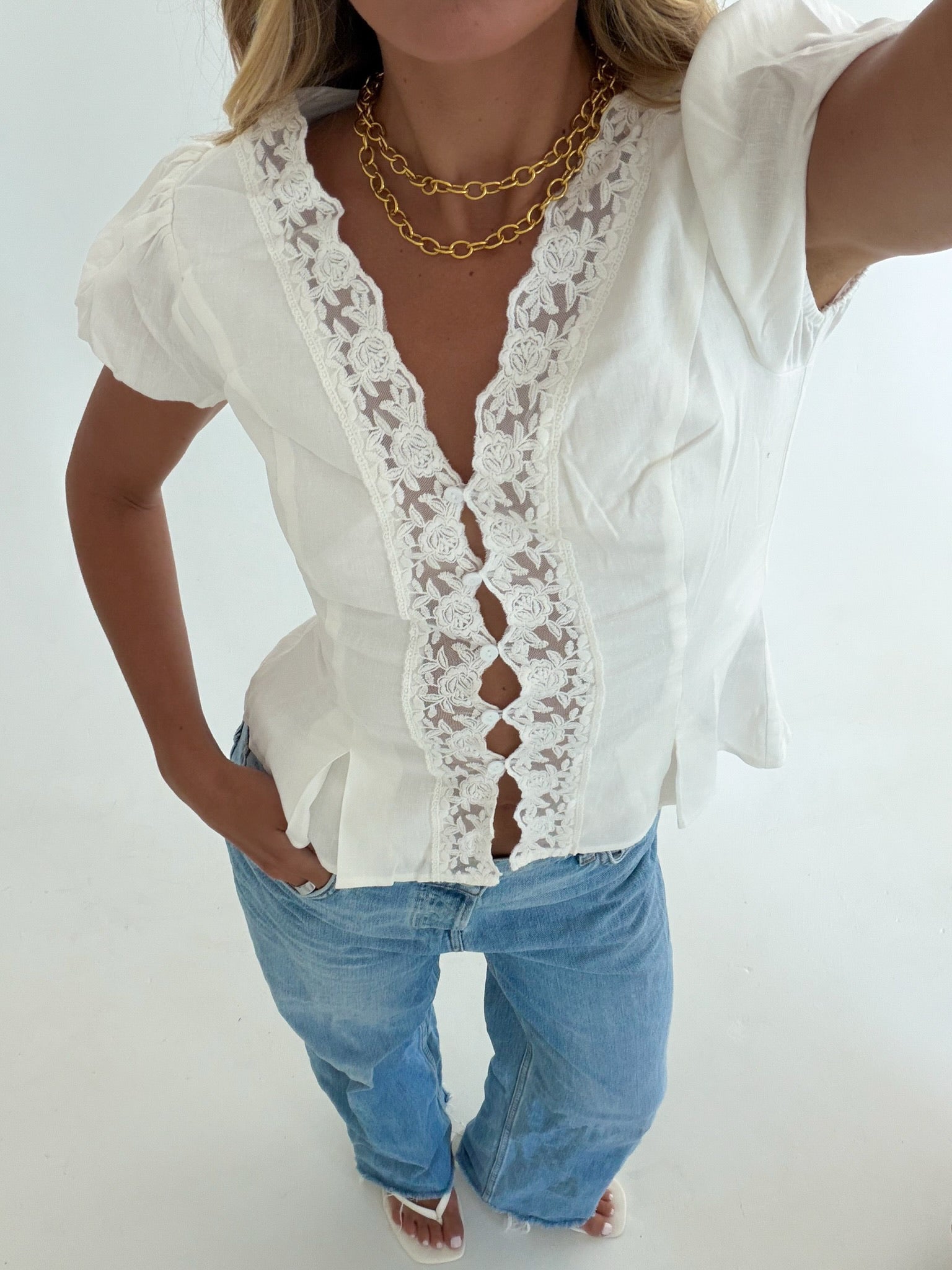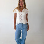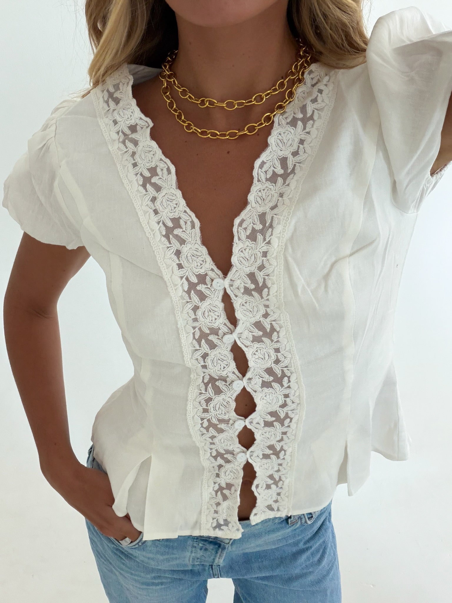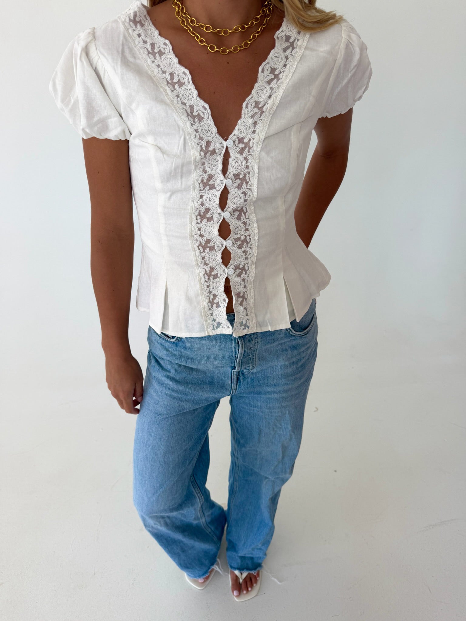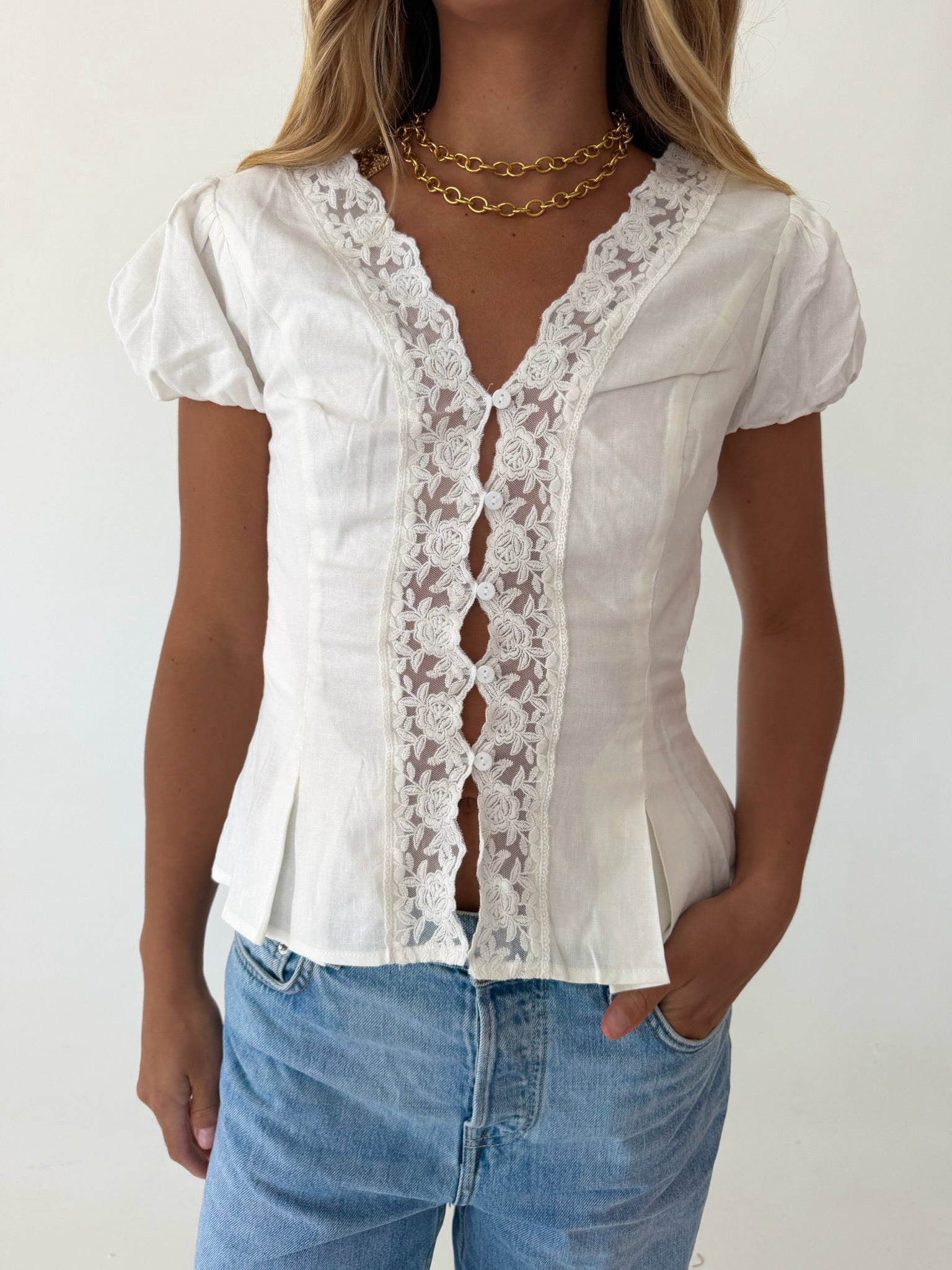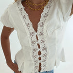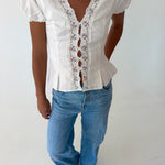 Mindi Lace Trim Puff Sleeves Top - White