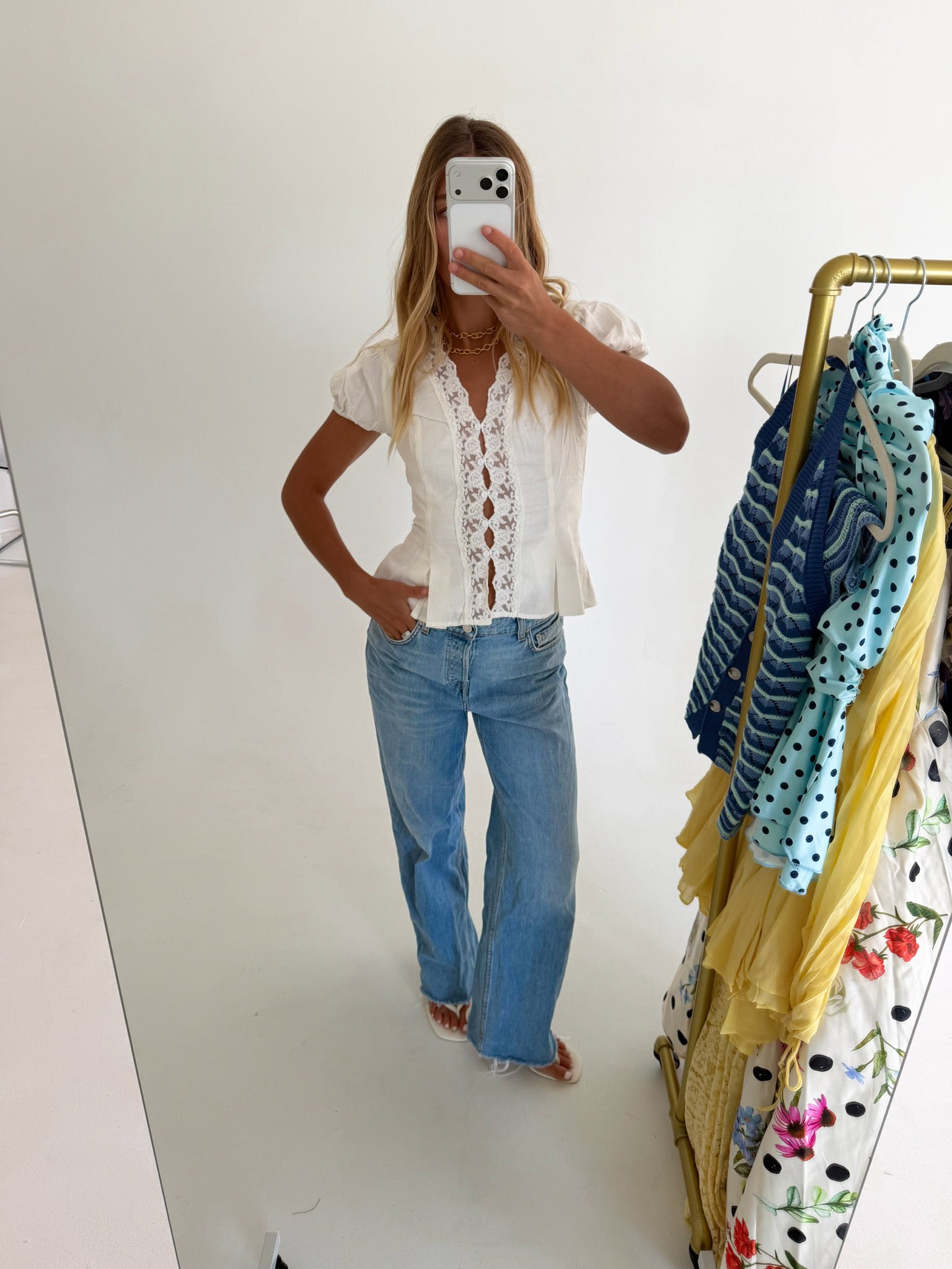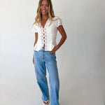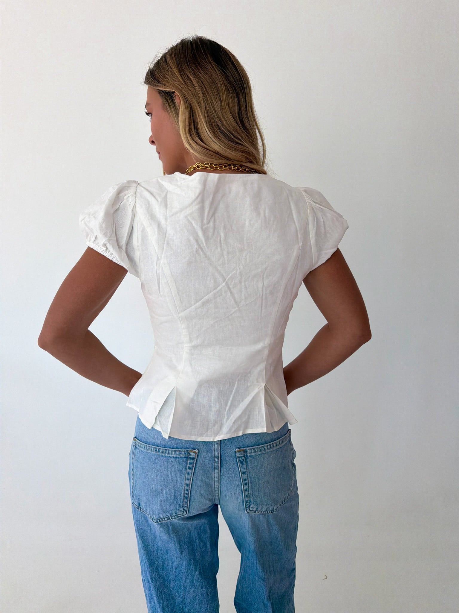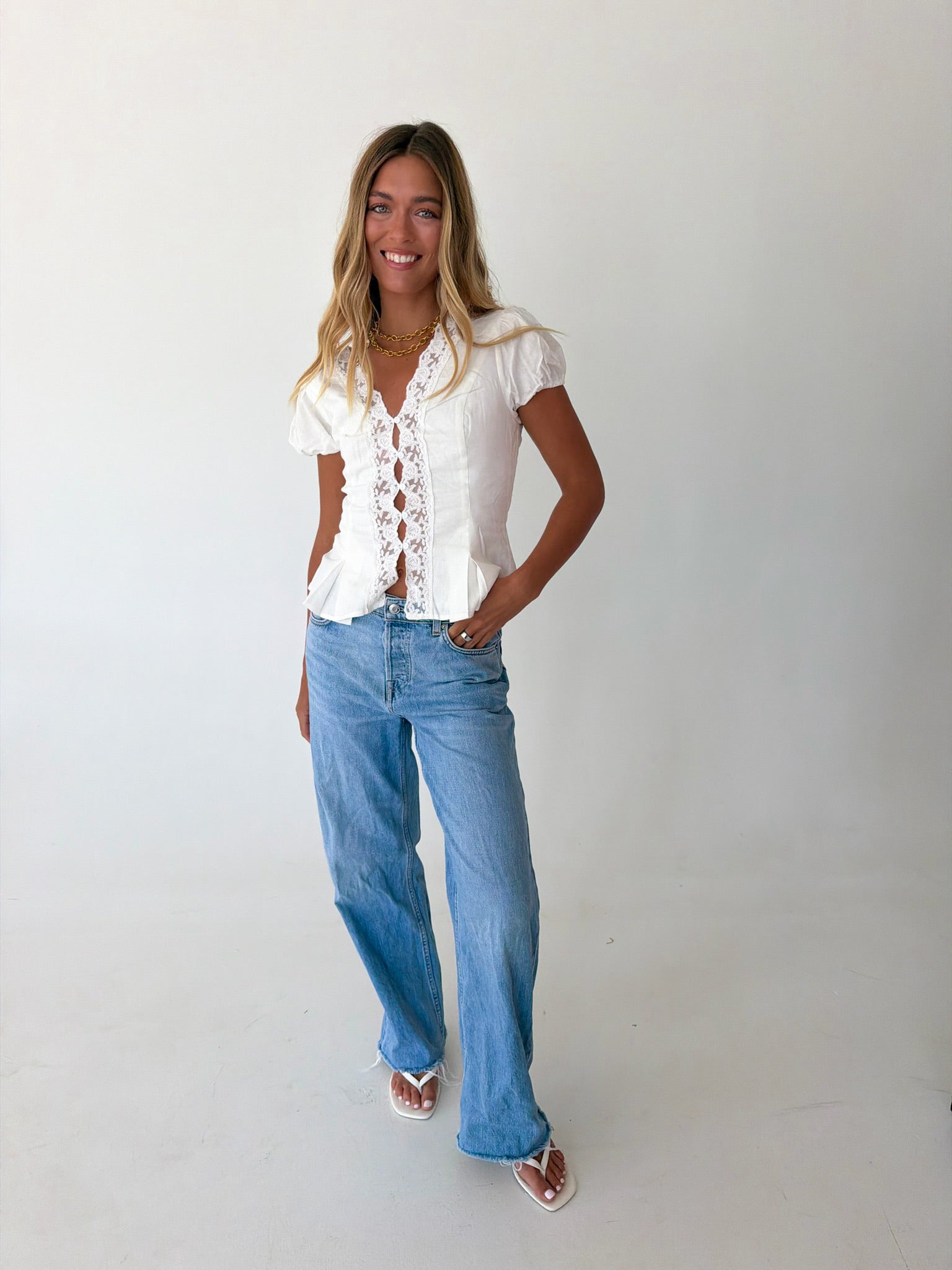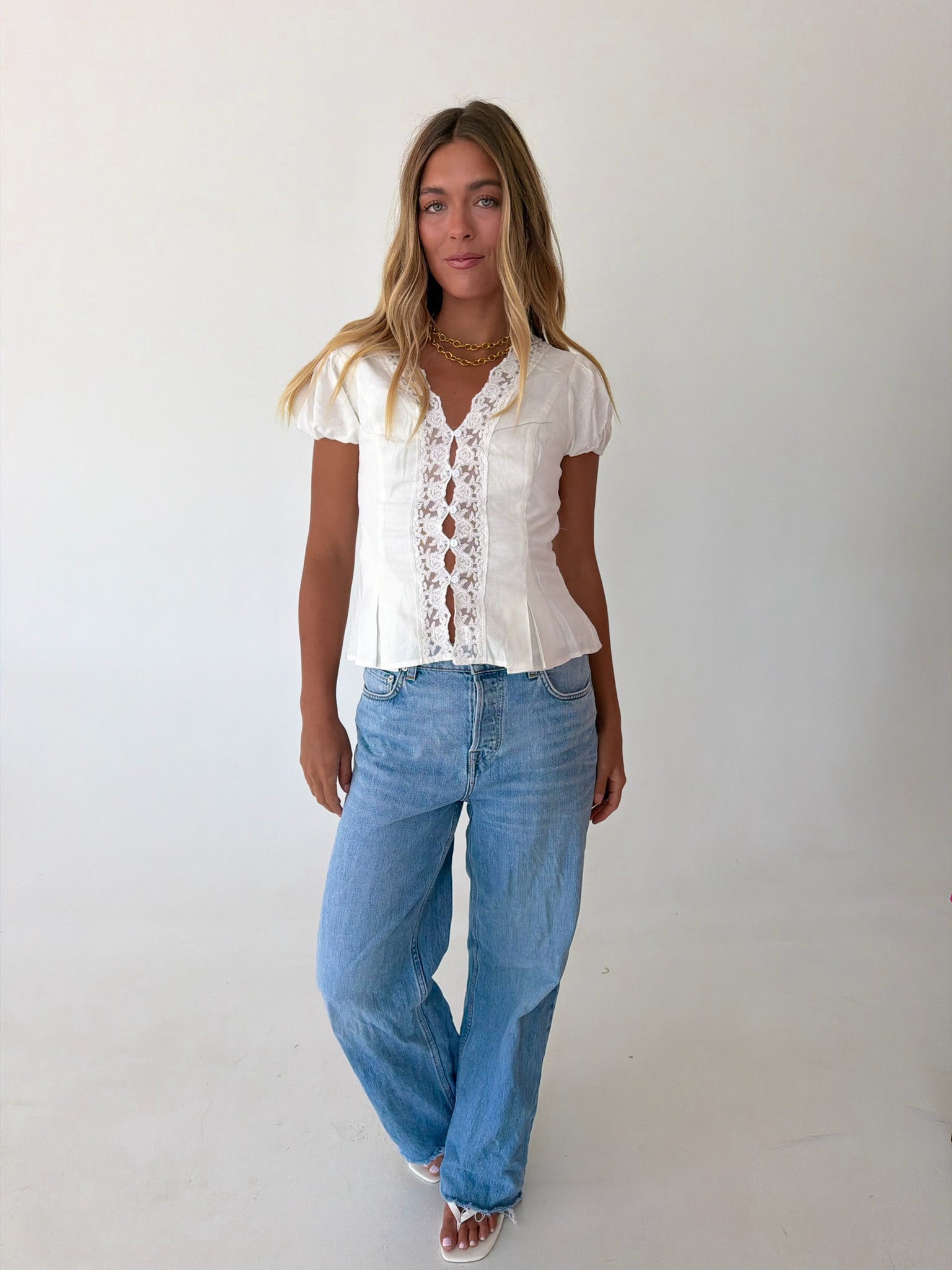 Mindi Lace Trim Puff Sleeves Top - White