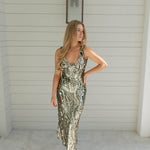 Turn heads at your next night out in this stunning V-neck sequin dress. The luxurious gold and black sequins catch the light beautifully, creating an eye-catching shimmer that commands attention. The flattering V-neckline adds elegance and sophistication to your look. Perfect for cocktail parties, celebrations, or any occasion where you want to feel absolutely fabulous. This dress is your ticket to feeling confident, glamorous, and unforgettable.
