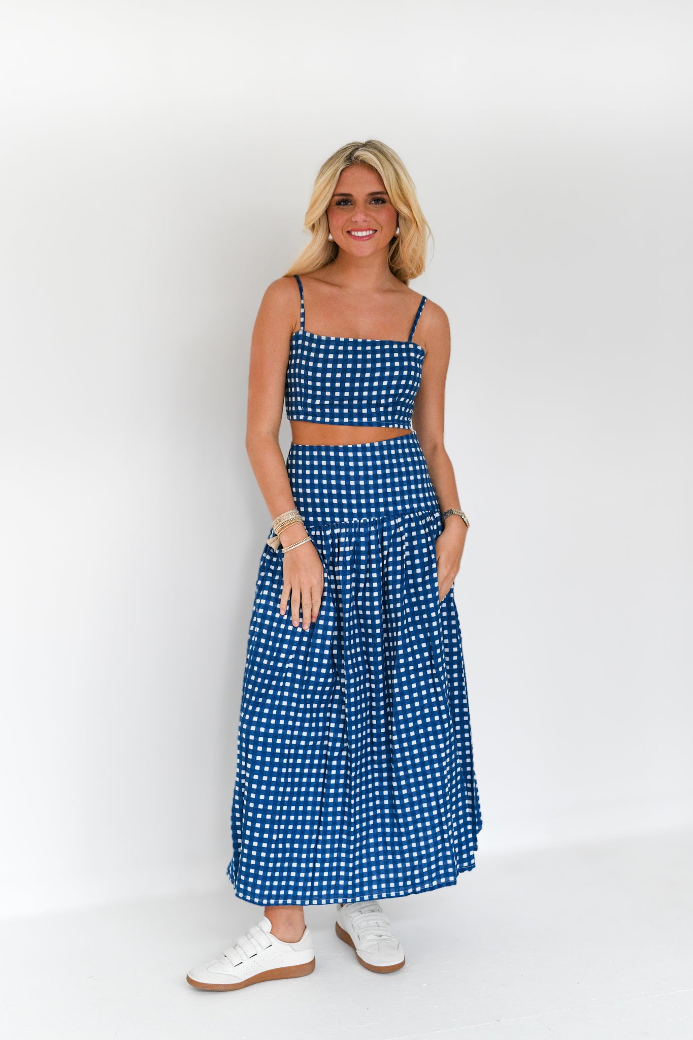 This navy and white gingham skirt set features a flattering crop top paired with a flowing maxi skirt, creating a stylish and comfortable outfit perfect for game day. Its breathable fabric and relaxed fit keep you cool and confident while cheering on your team. Embrace effortless style and support your favorite game in this versatile set.