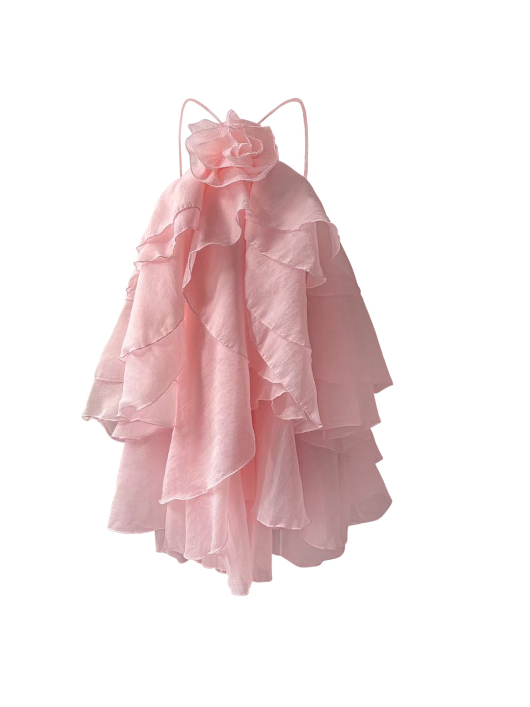 This flowy and feminine ruffle mini dress is perfect for any occasion. With delicate flower details and halter straps, it will elevate any outfit. Stay stylish, comfortable, and effortlessly chic in this must-have piece.