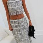 This elegant Jenny Maxi Skirt Set in striking white and black features a halter tie neck and sleeveless design for a comfortable, flattering fit. The double drawstring tie waist ensures adjustable shaping, while the tiered crinkle fabric and ruffle trim add delicate movement and texture. Crafted from lightweight chiffon, this backless full body outfit offers breathable style for day or evening occasions. Perfect for those seeking a chic yet effortless look with timeless paisley charm.