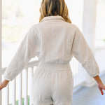 Effortlessly chic and versatile, the Kallie Collared Zip Front Denim Romper in white is a must-have for any fashion-forward wardrobe. With its stylish collar and convenient zip front, this romper is both comfortable and stylish. Perfect for any occasion, this romper will keep you looking effortlessly put-together.