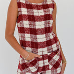 The Kate Tweed Romper in ivory and burgundy offers a chic and comfortable look with its sleeveless design and round neckline. Crafted from tweed fabric, it delivers a textured style that stands out while providing pockets for added convenience. This romper is perfect for those seeking an easy, polished outfit that supports your busy lifestyle with both flair and function.