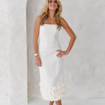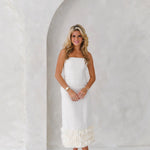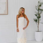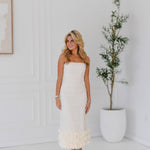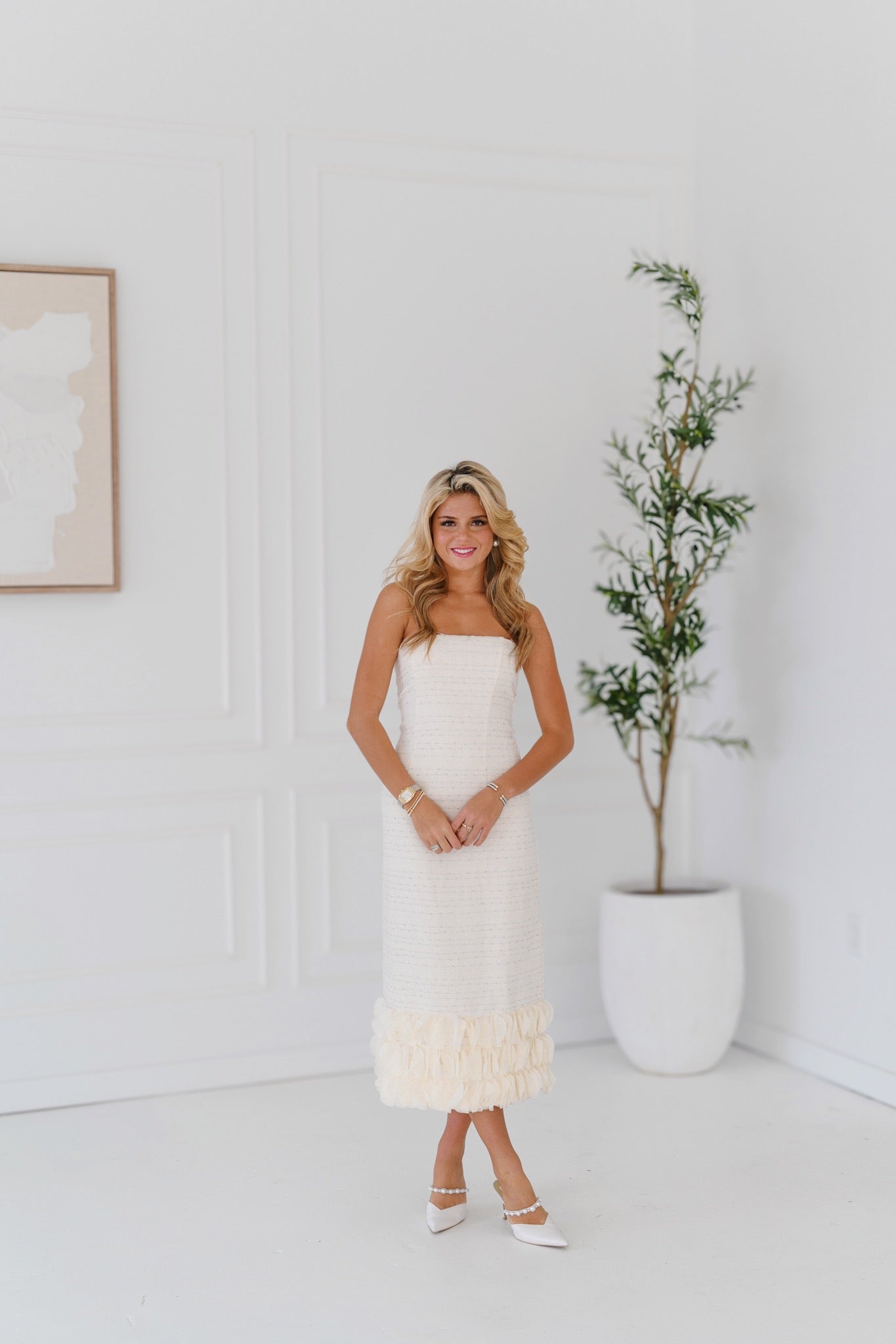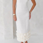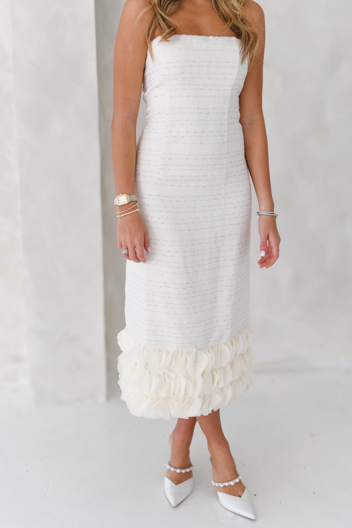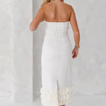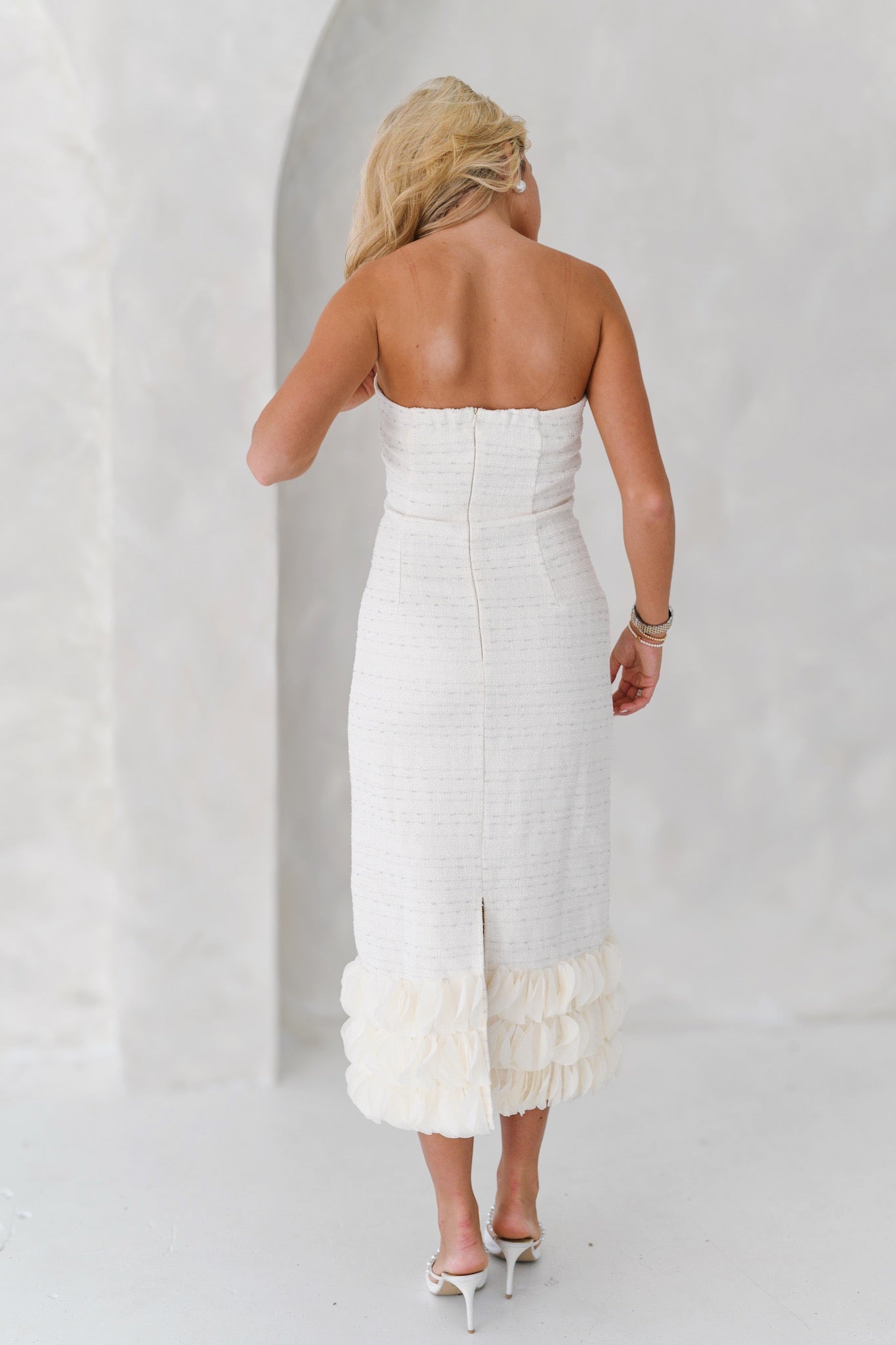 Effortlessly elevate your look with the Kyla Tweed Strapless Dress. The 3D floral texture adds a touch of elegance, while the maxi length and back split hem provide a flattering silhouette. The tweed material ensures both comfort and style, making this the perfect dress for any occasion.