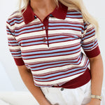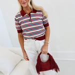 Experience comfort and style with the Lenny Striped Polo Top in Burgundy Multi. Crafted from a soft blend of cotton, polyester, and nylon, this half button-up sweater features a classic collar neck and short sleeves, making it perfect for layering or wearing on its own. The striped design adds a timeless touch while its breathable fabric ensures all-day ease. Ideal for casual outings or relaxed workdays, this top supports your style effortlessly.