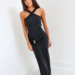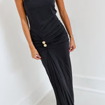 This maxi dress features a graceful neckline and elegant drape design, accented by a refined gold trim that adds a touch of sophistication. Its flowing silhouette ensures comfort and ease, making it perfect for both formal occasions and stylish everyday wear. The timeless details promise a flattering fit that enhances your natural elegance.