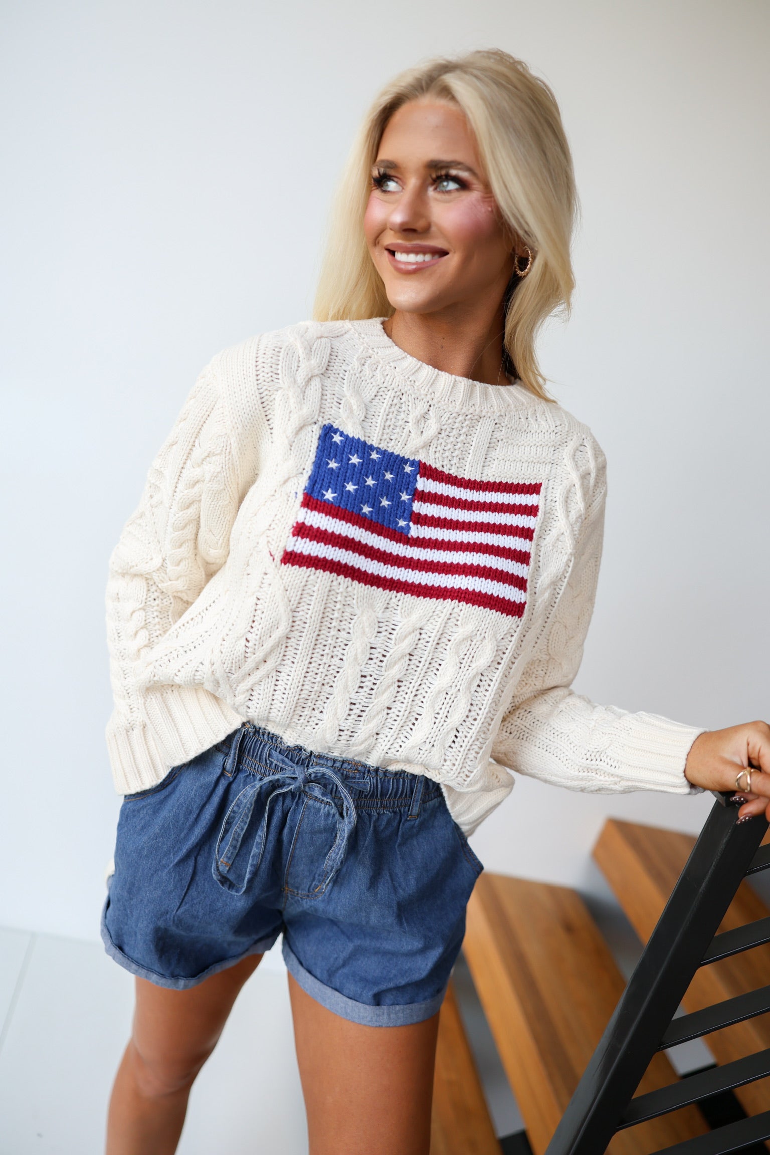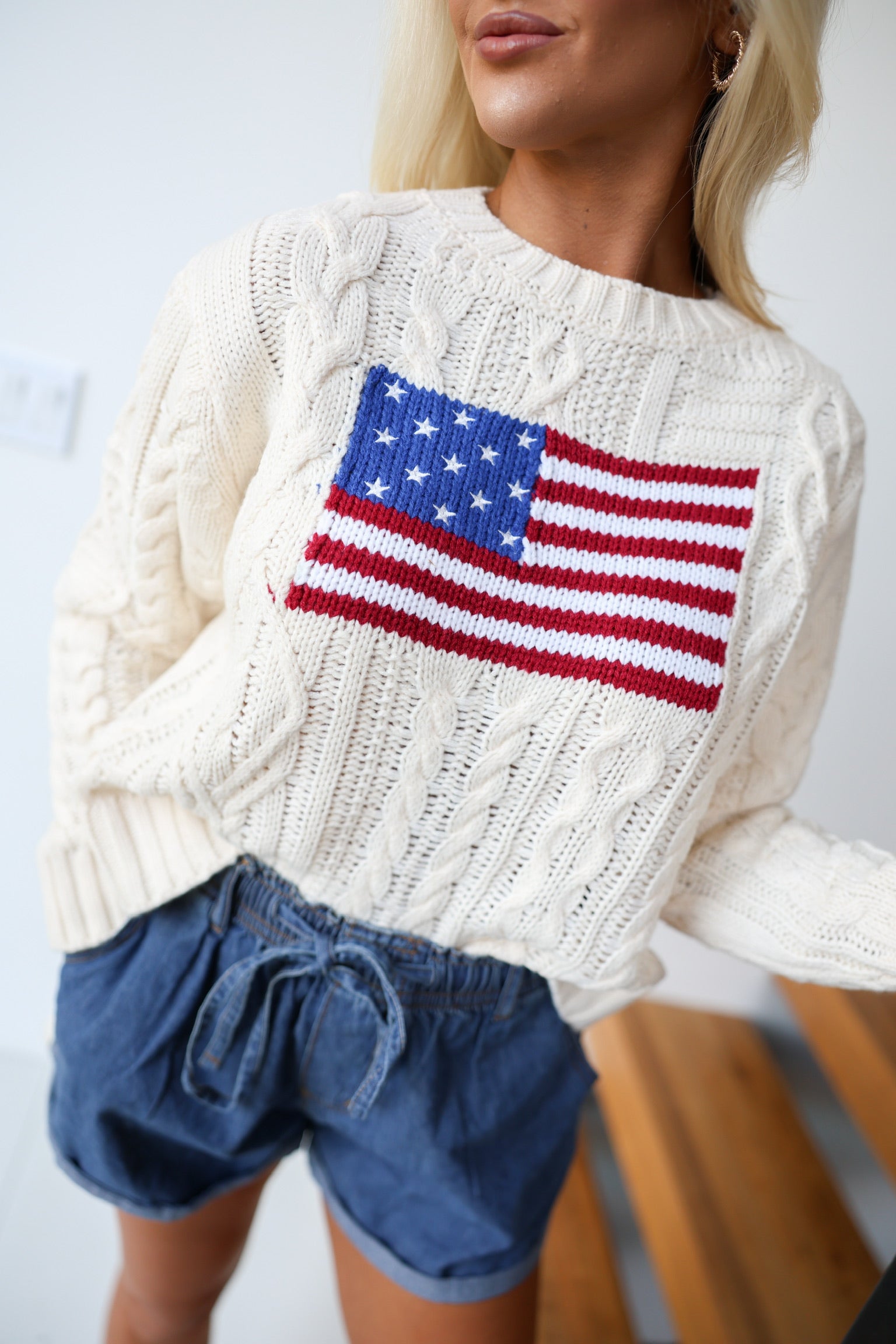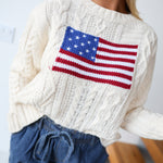 Stay cozy and showcase your patriotic spirit with the Livvy Cable Knit Sweater in Cream. Crafted with a classic cable knit pattern, this sweater offers warmth and timeless style. Its soft texture makes it perfect for chilly days, while the subtle USA flag detail adds a meaningful touch. Ideal for layering or wearing on its own, this sweater supports both comfort and your love for the country.