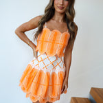 The Lola Mini Strap Dress in White and Orange features a playful ruffle hem, combining comfort with a flattering silhouette. Its lightweight design makes it perfect for warm days, while the ruffle detail adds a touch of feminine charm. Ideal for casual outings or special occasions, this dress offers both style and ease, helping you feel confident and effortlessly chic.