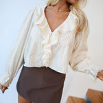 This blouse features a textured fabric that offers a soft, vintage-inspired drape for effortless style. Its relaxed fit ensures comfortable wear throughout the day. The V-neckline is beautifully framed by a wide ruffle trim edged in delicate lace, adding a touch of femininity. Long puff sleeves with elasticized ruffle cuffs complete the look, providing both charm and ease of movement. Perfect for those seeking a graceful yet comfortable addition to their wardrobe.