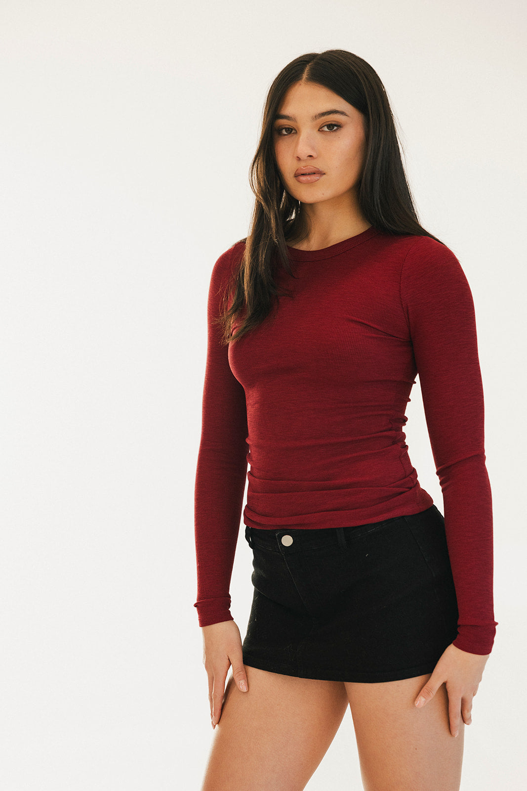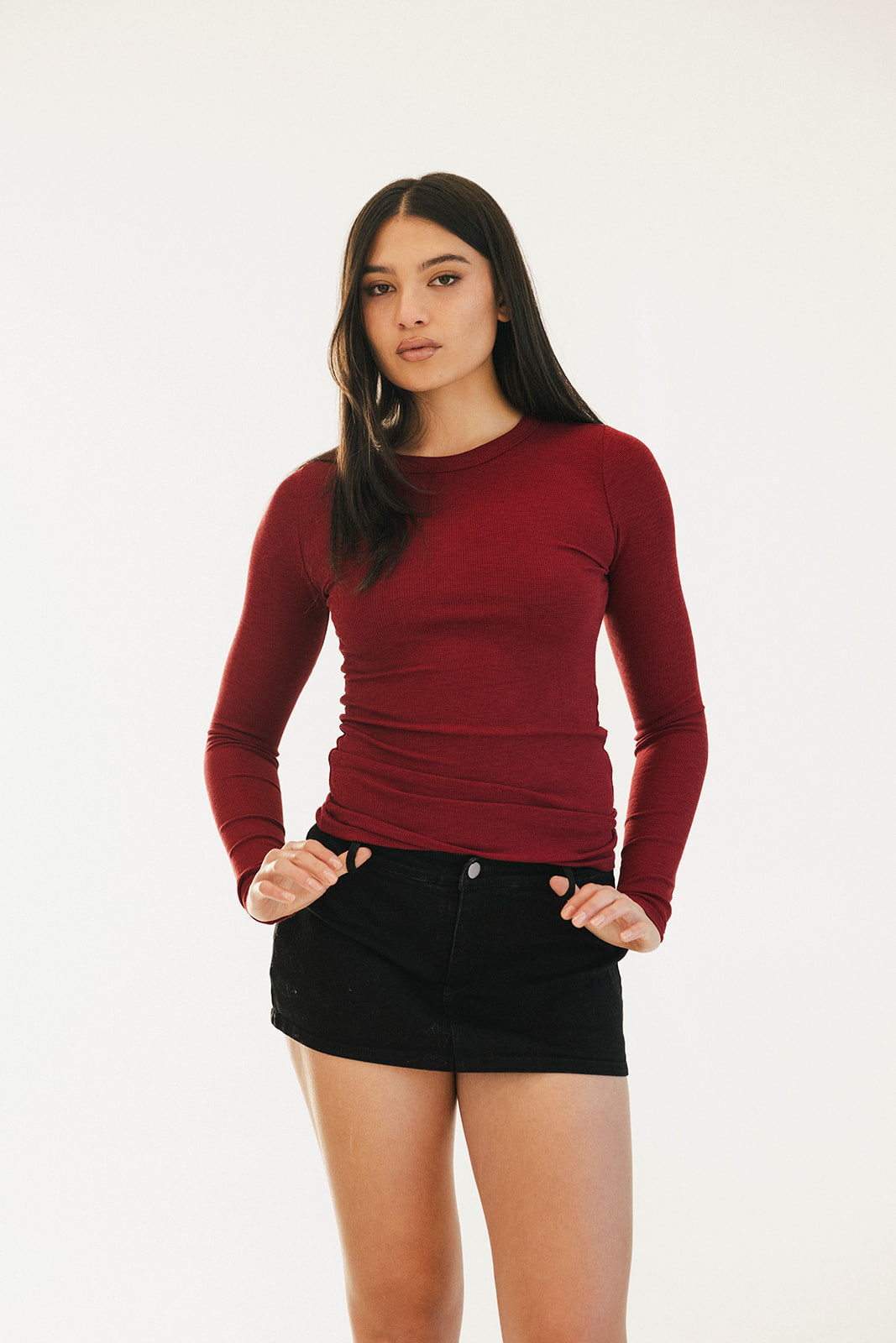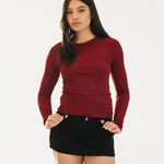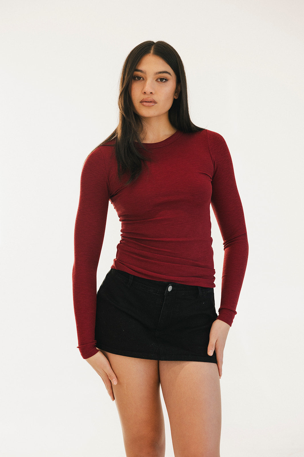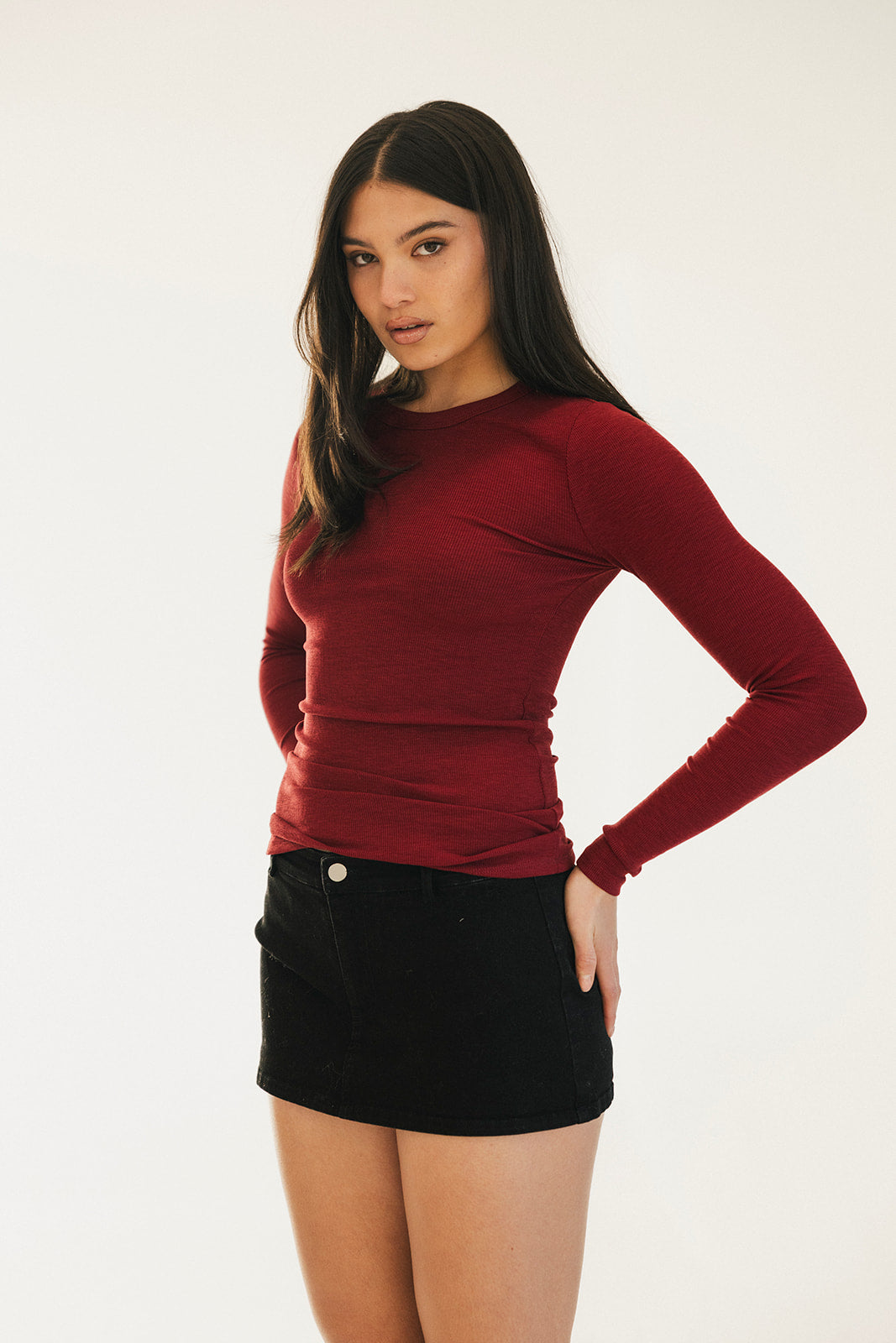 Embrace effortless elegance with the Abbey Long Sleeve Top in Scarlet. This thoughtfully designed piece combines a soft ribbed knit fabric that hugs your silhouette beautifully with generously long sleeves that add a contemporary touch. Perfect for layering or wearing solo, the Abbey delivers both comfort and style for your everyday wardrobe. Whether you're dressing up or keeping it casual, this versatile top supports your personal style with its flattering fit and cozy appeal.