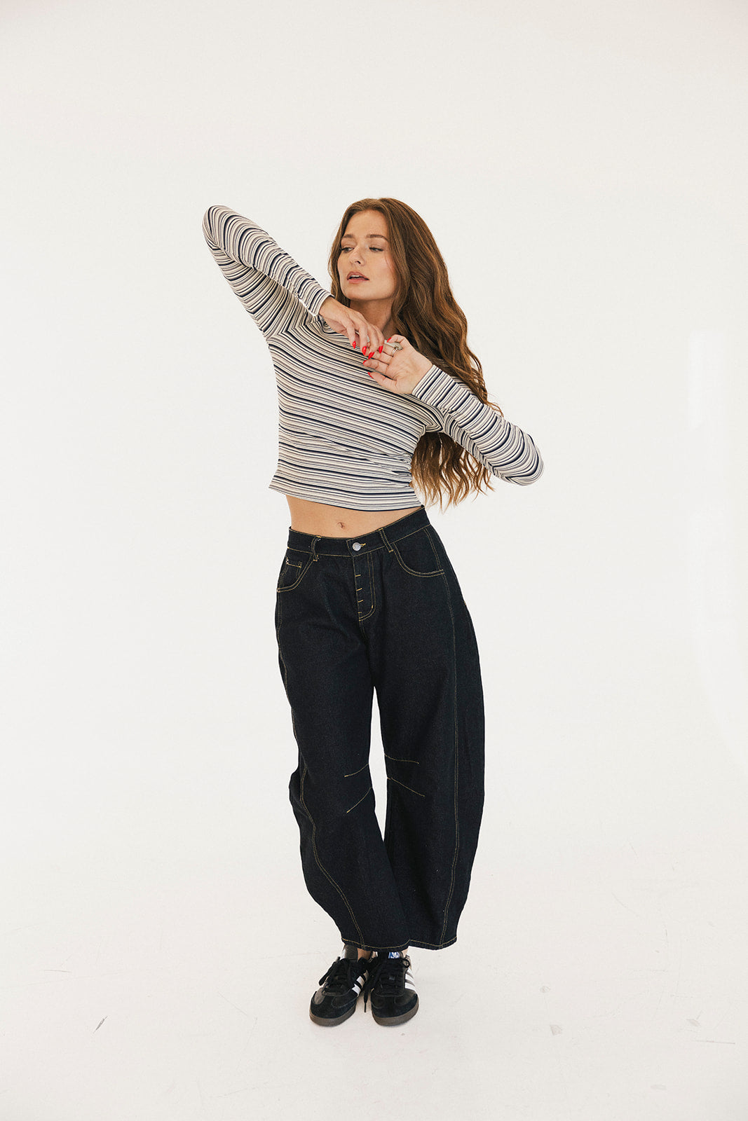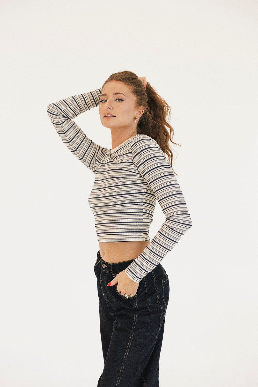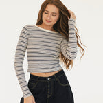 The Ava Striped Long Sleeve in Grey Multi is your new wardrobe essential for laid-back, effortless style. Featuring timeless stripes with a striking contrast neckline, this top adds instant personality to any look. The stretchy, breathable fabric moves with you for all-day comfort, while long sleeves make it perfect for layering through every season. Pair it with your favorite jeans for casual vibes or dress it up with a skirt—this versatile striped top is the chic, youthful piece you'll reach for again and again.