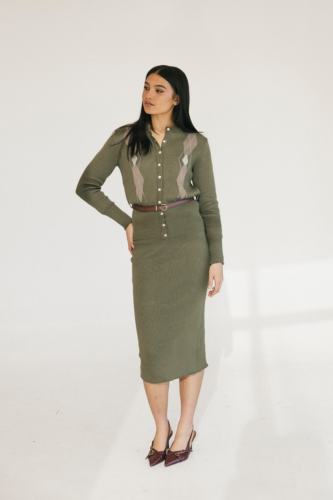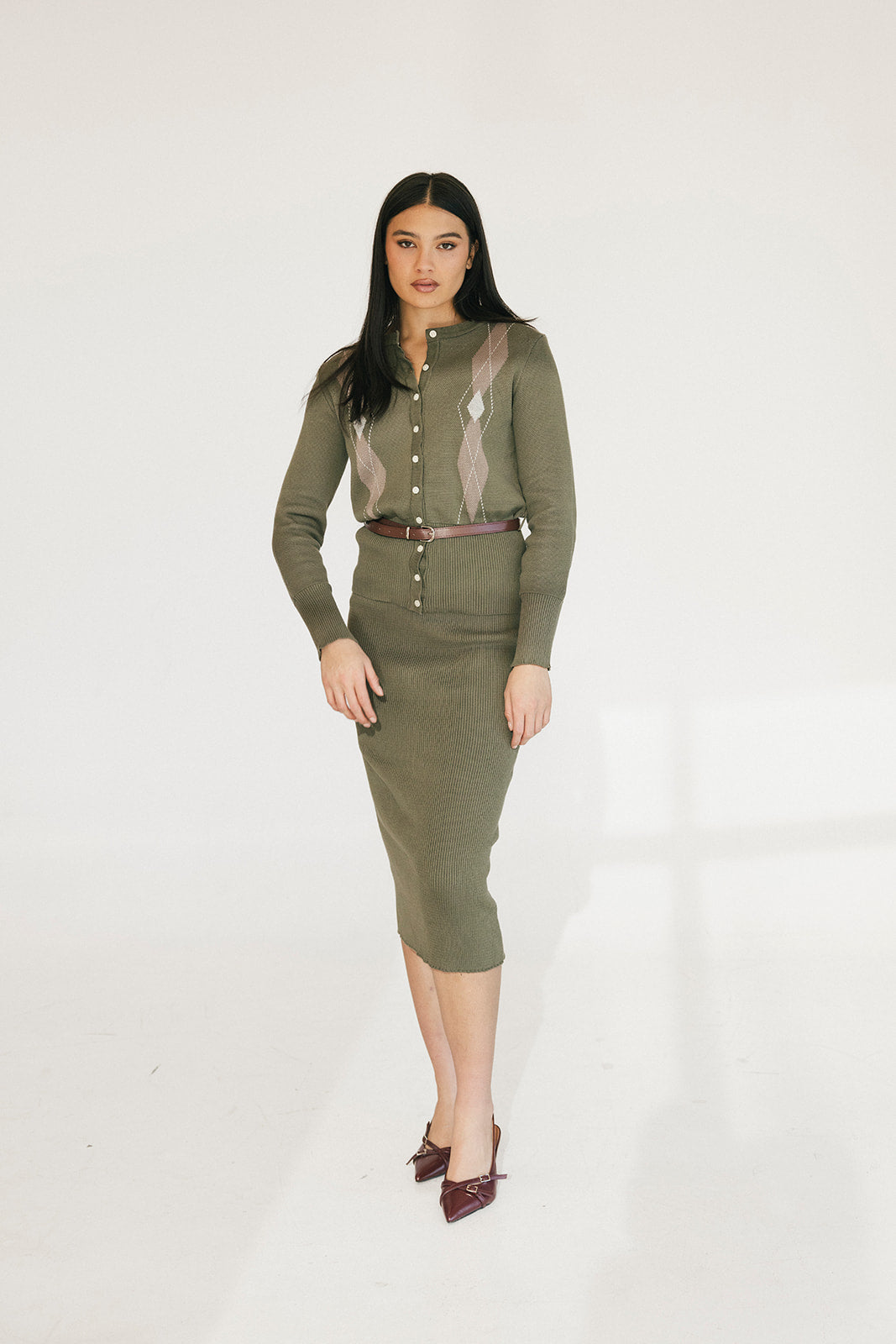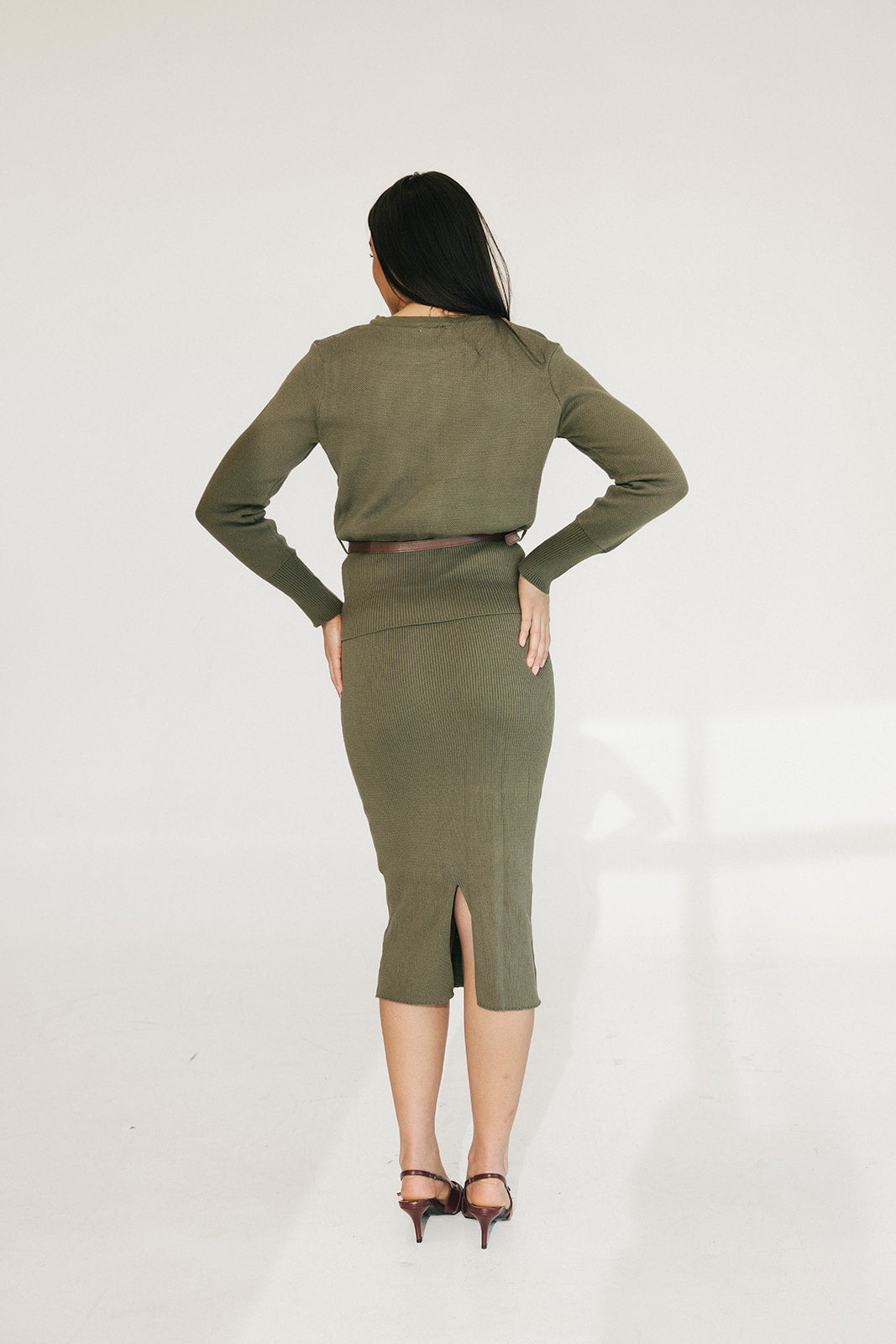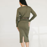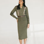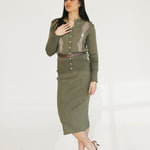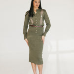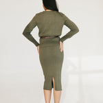 Wrap yourself in warmth and style with this charming two-piece set. The soft knit cardigan features a classic round neckline, cozy long sleeves, and a convenient front button-down closure that makes layering effortless. Pair it with the coordinating ribbed midi skirt and cinch the cardigan with the included belt for a polished, put-together look. Perfect for casual days or relaxed evenings, this olive set brings together comfort and elegance in one versatile ensemble that you'll reach for again and again.