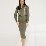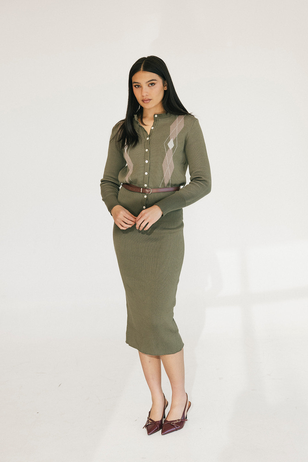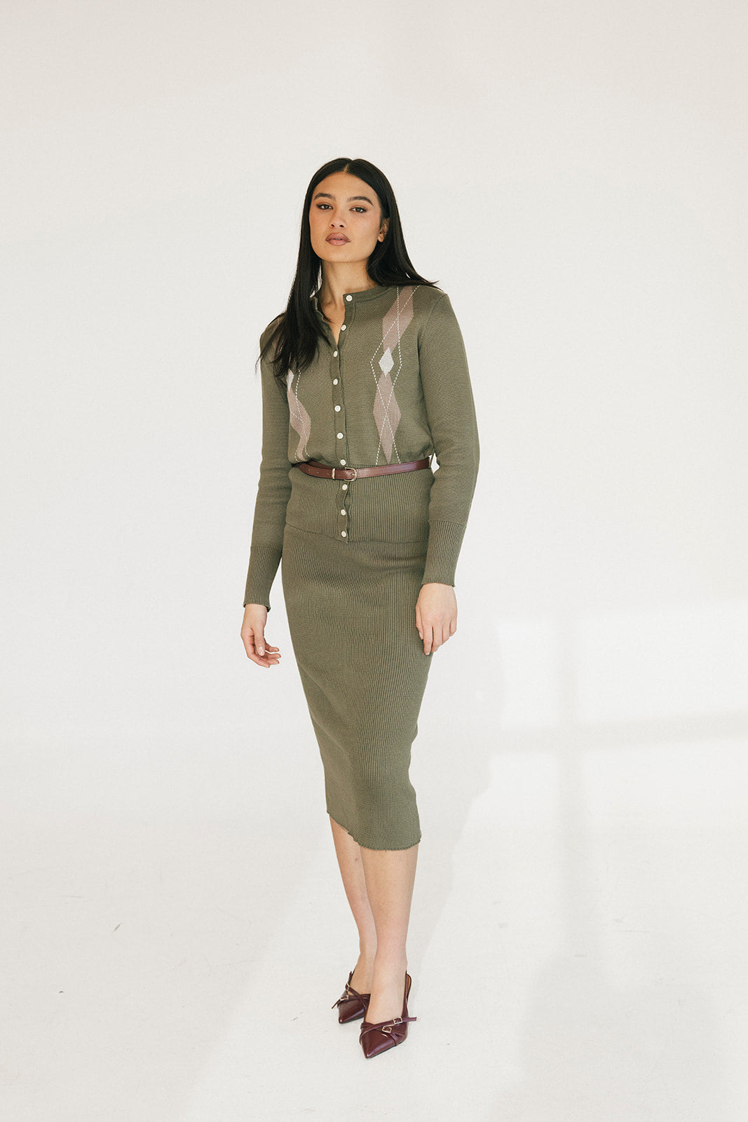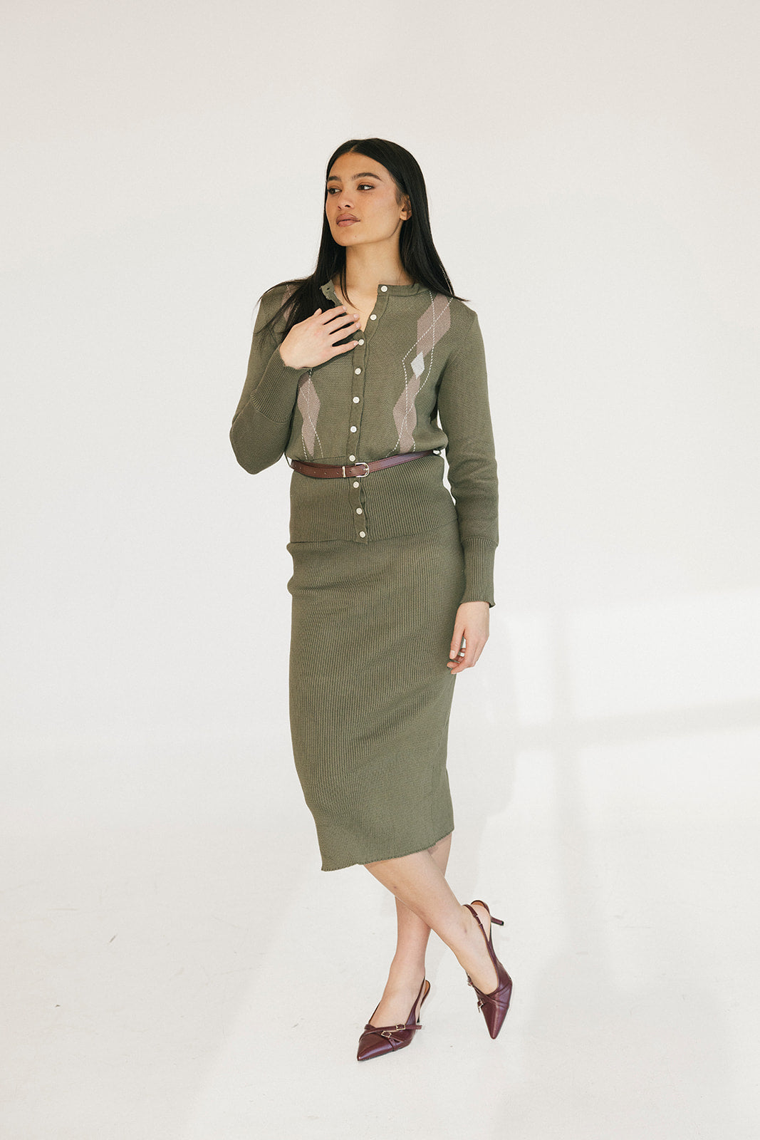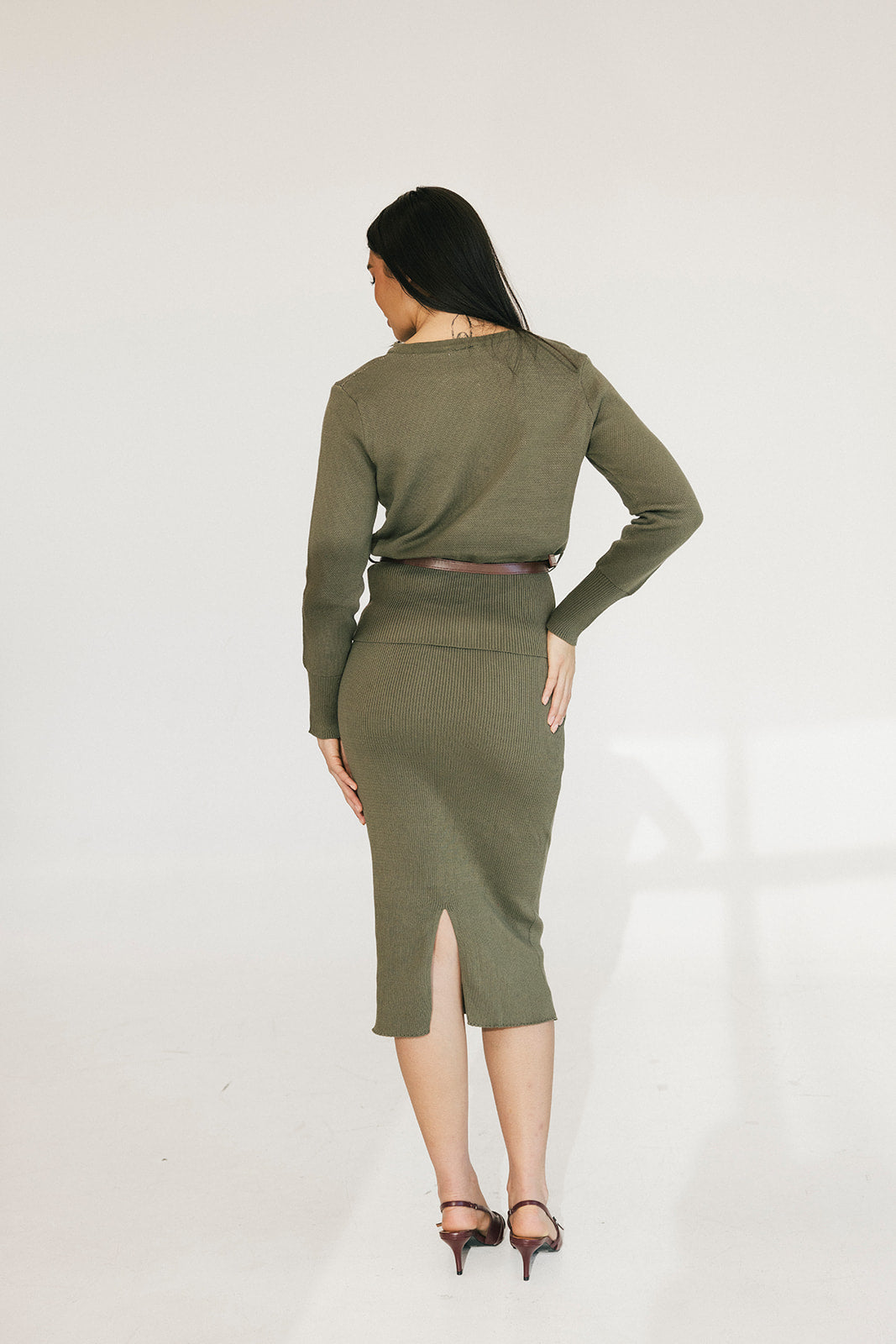 Wrap yourself in warmth and style with this charming two-piece set. The soft knit cardigan features a classic round neckline, cozy long sleeves, and a convenient front button-down closure that makes layering effortless. Pair it with the coordinating ribbed midi skirt and cinch the cardigan with the included belt for a polished, put-together look. Perfect for casual days or relaxed evenings, this olive set brings together comfort and elegance in one versatile ensemble that you'll reach for again and again.