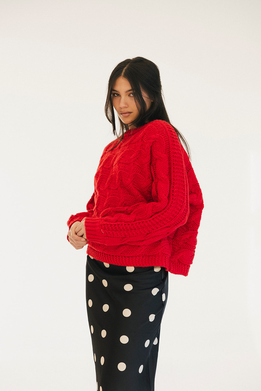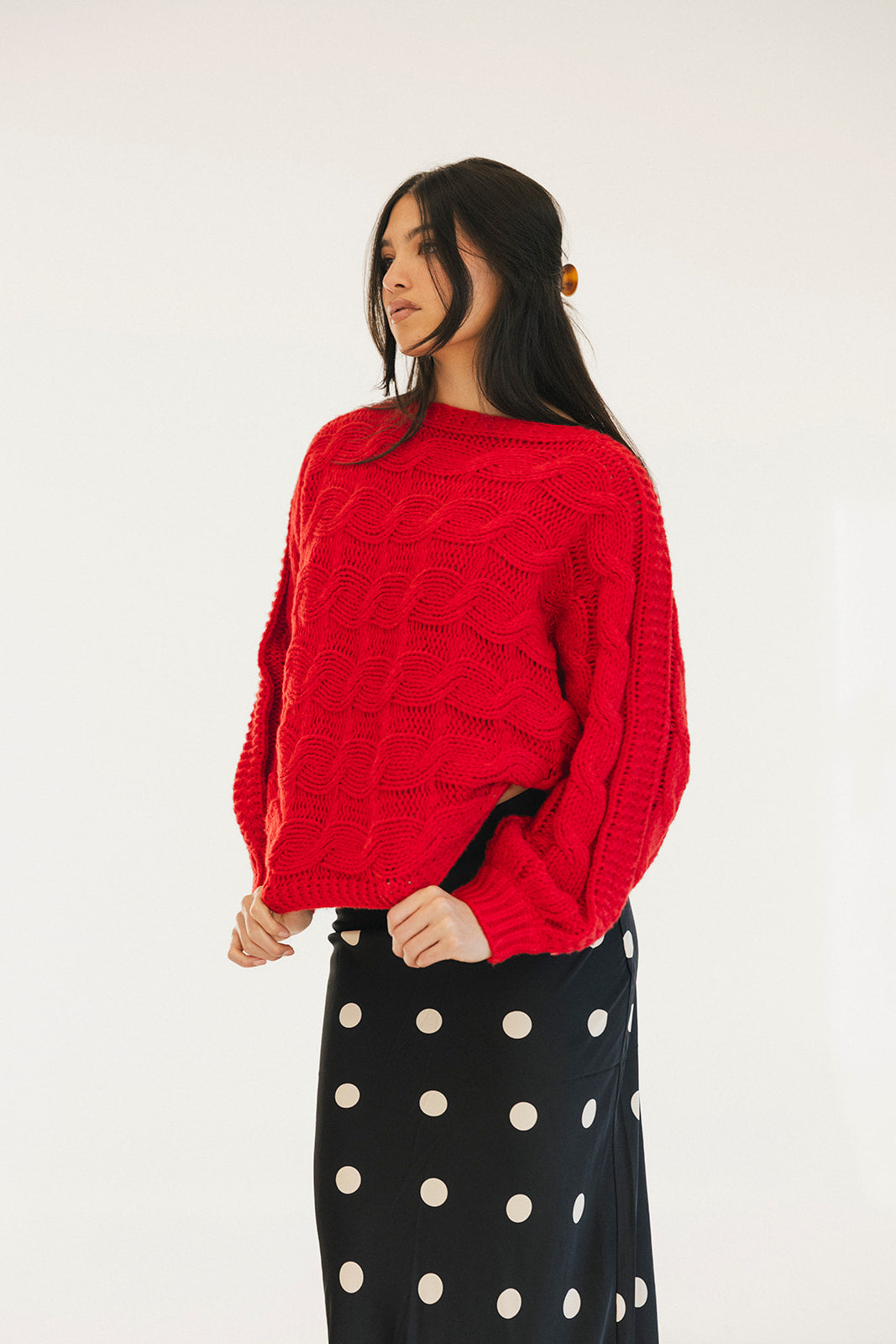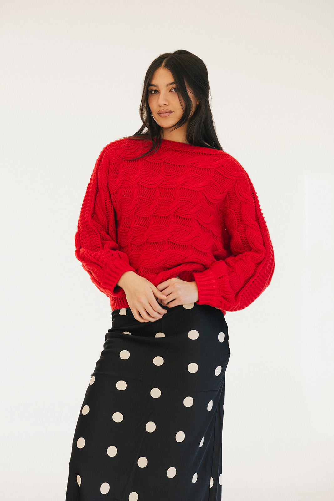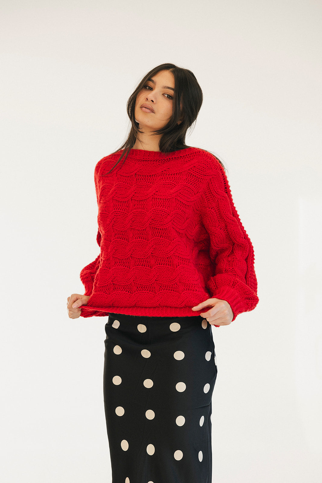 Wrap yourself in comfort with the Catie Braided Knit Sweater Top. This cozy essential features a textured braid knit design paired with ribbed detailing for a flattering, structured fit. The soft, breathable fabric makes it perfect for layering or wearing solo, whether you're heading to the office or enjoying a relaxed weekend. The timeless red shade pairs effortlessly with any wardrobe, making this sweater a versatile piece you'll reach for again and again. Embrace warmth without compromising on style.