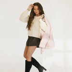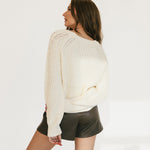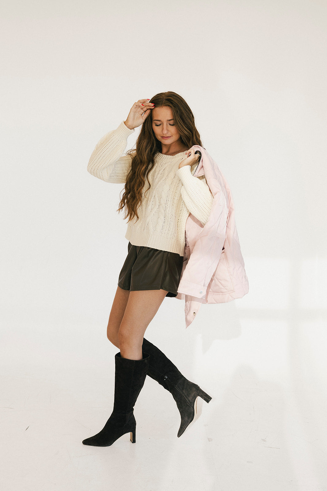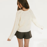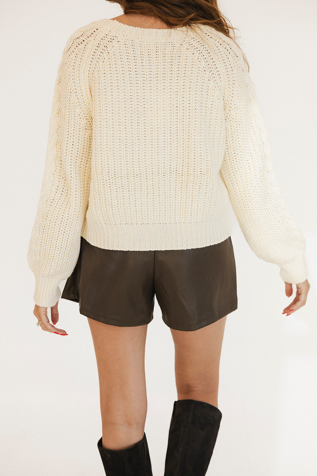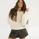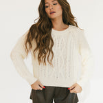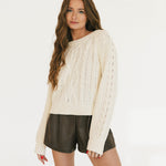 Elevate your everyday style with the Connie Cable Knit Sweater in a timeless cream shade. This cropped silhouette features intricate cable braid crochet detailing that adds texture and visual interest to any outfit. The cozy knit construction provides warmth without bulk, making it perfect for layering or wearing solo. Whether you're dressing up for a night out or keeping it casual, this versatile sweater top works beautifully with jeans, skirts, or tailored trousers. Embrace comfort and sophistication in one piece.