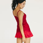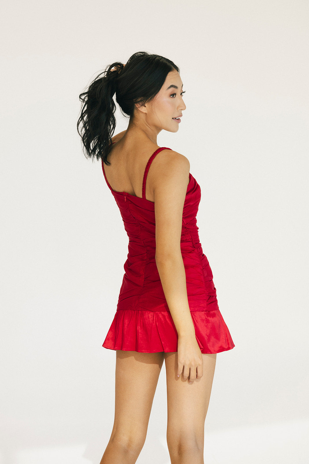This Lucy Ruched Mini Dress in Flame Red features a solid color and a flattering slim fit that accentuates your silhouette. The delicate ruching adds texture and style, creating a chic and versatile look for any occasion. Perfect for those who want a confident yet comfortable outfit, this dress pairs easily with your favorite accessories to complete your look.