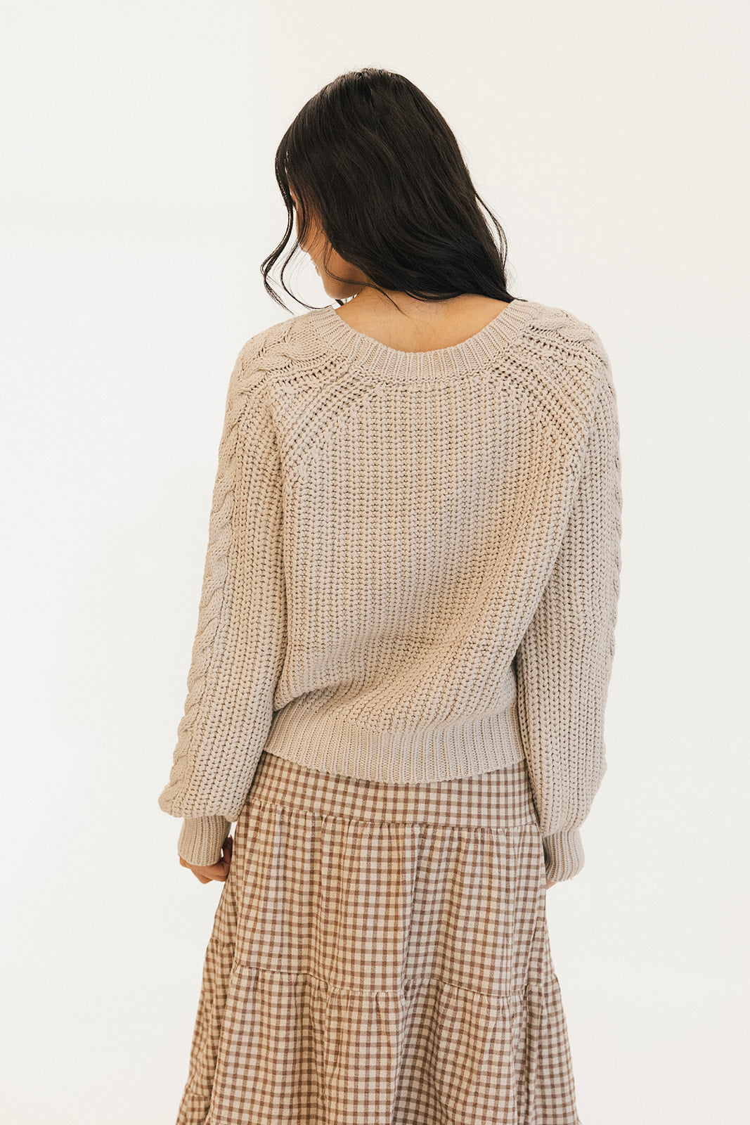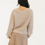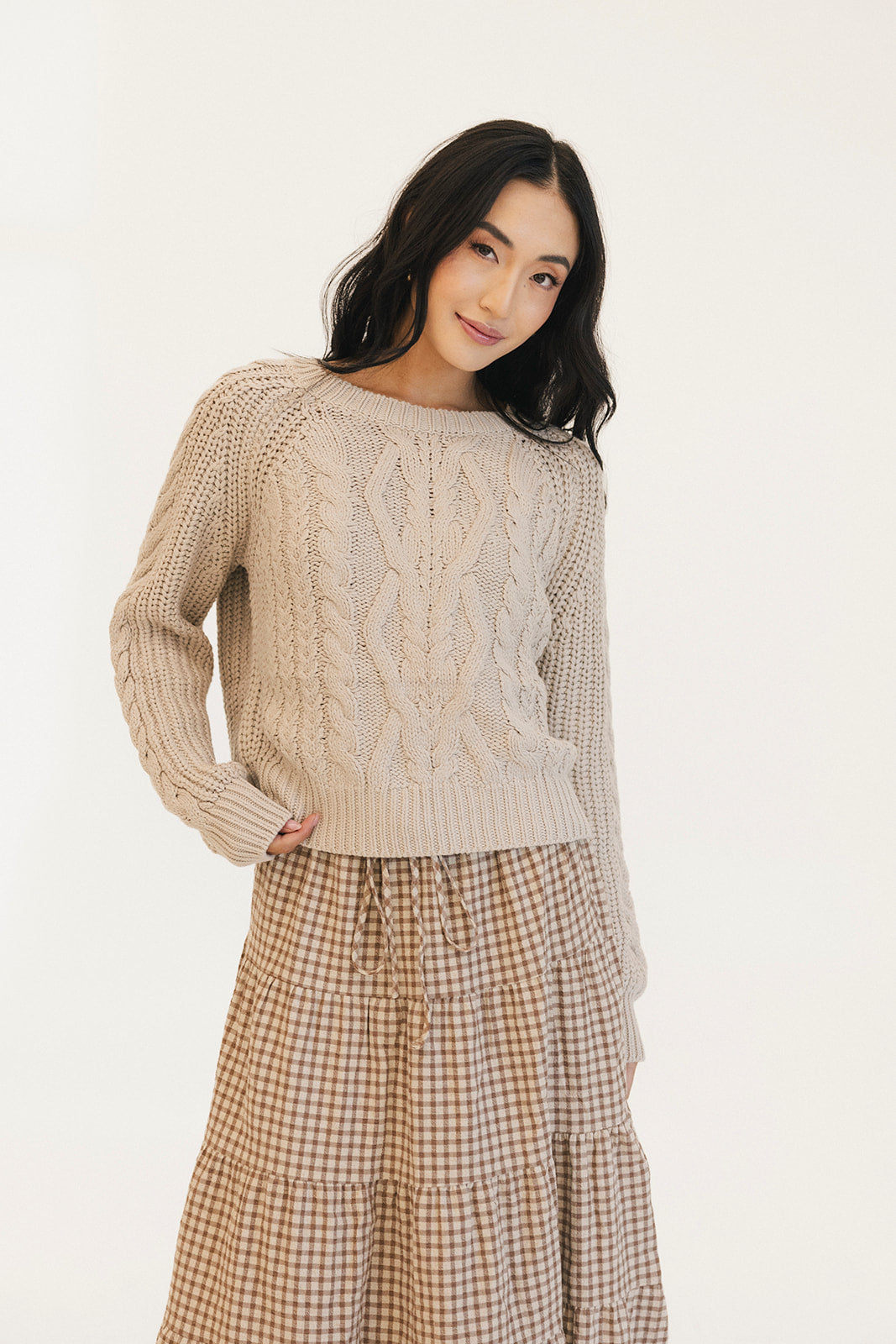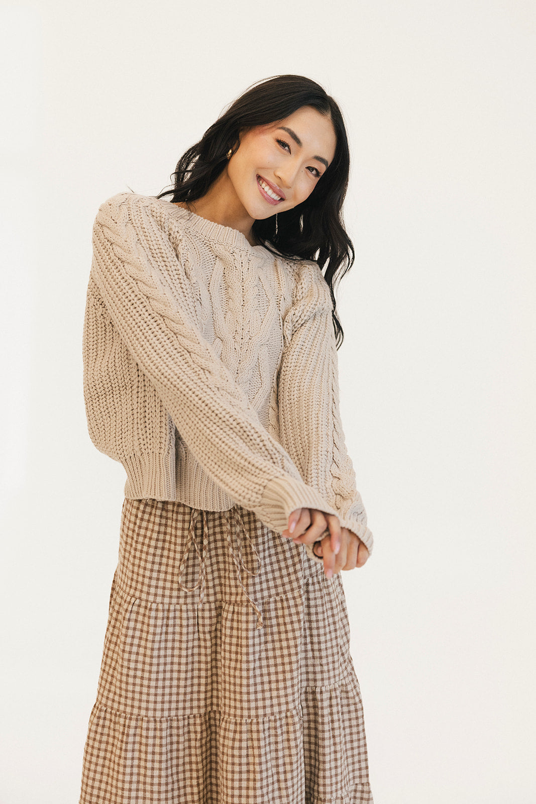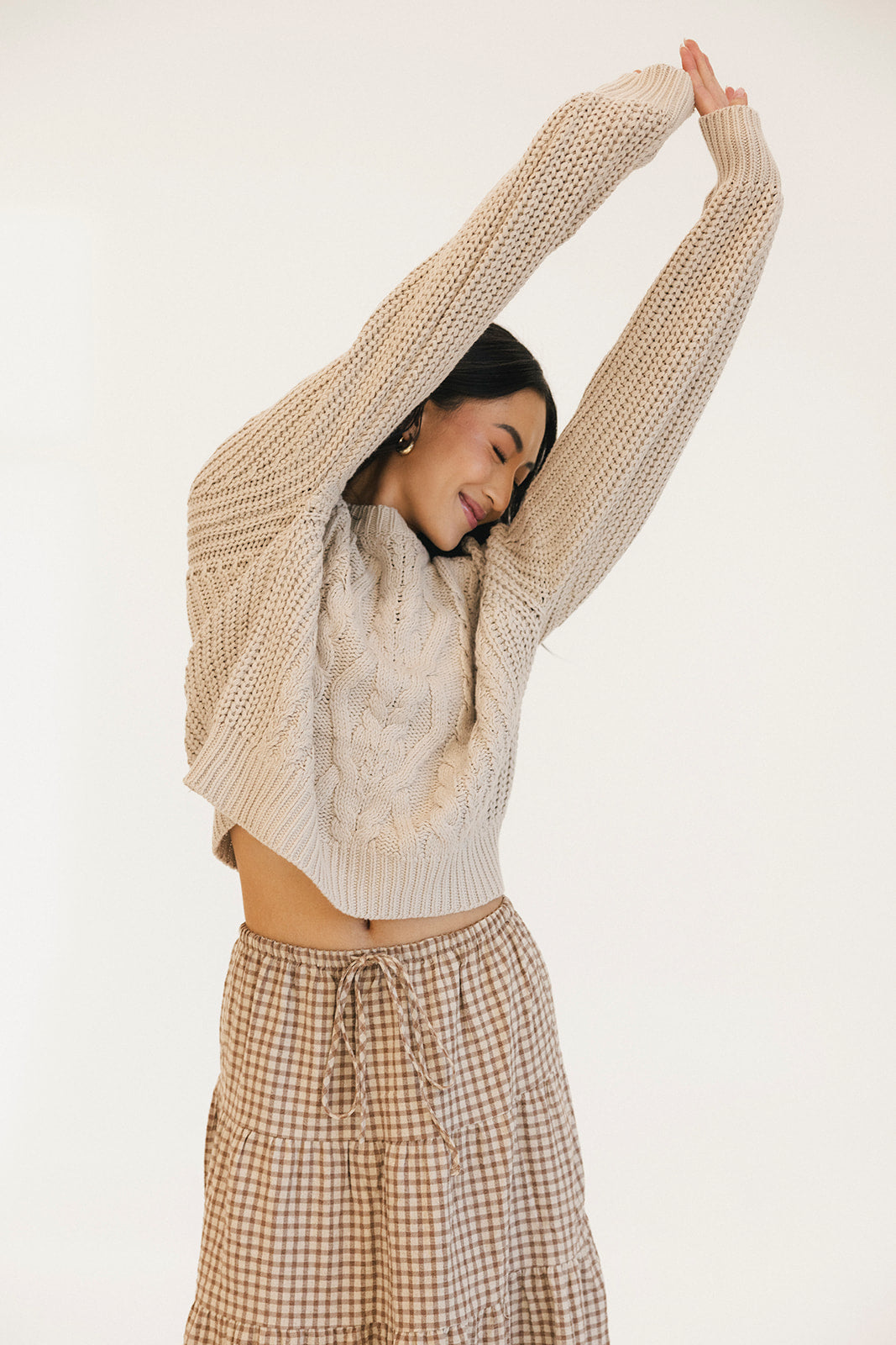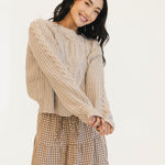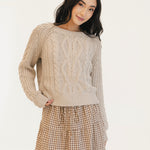 Elevate your everyday style with the Maggie Cable Knit Sweater in a timeless cream shade. This cropped silhouette features intricate cable braid crochet detailing that adds texture and visual interest to any outfit. The cozy knit construction provides warmth without bulk, making it perfect for layering or wearing solo. Whether you're dressing up for a night out or keeping it casual, this versatile sweater top works beautifully with jeans, skirts, or tailored trousers. Embrace comfort and sophistication in one piece.