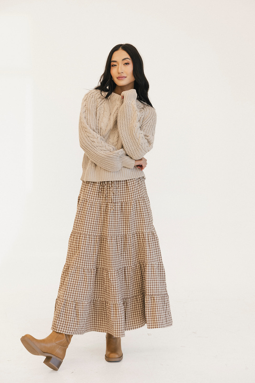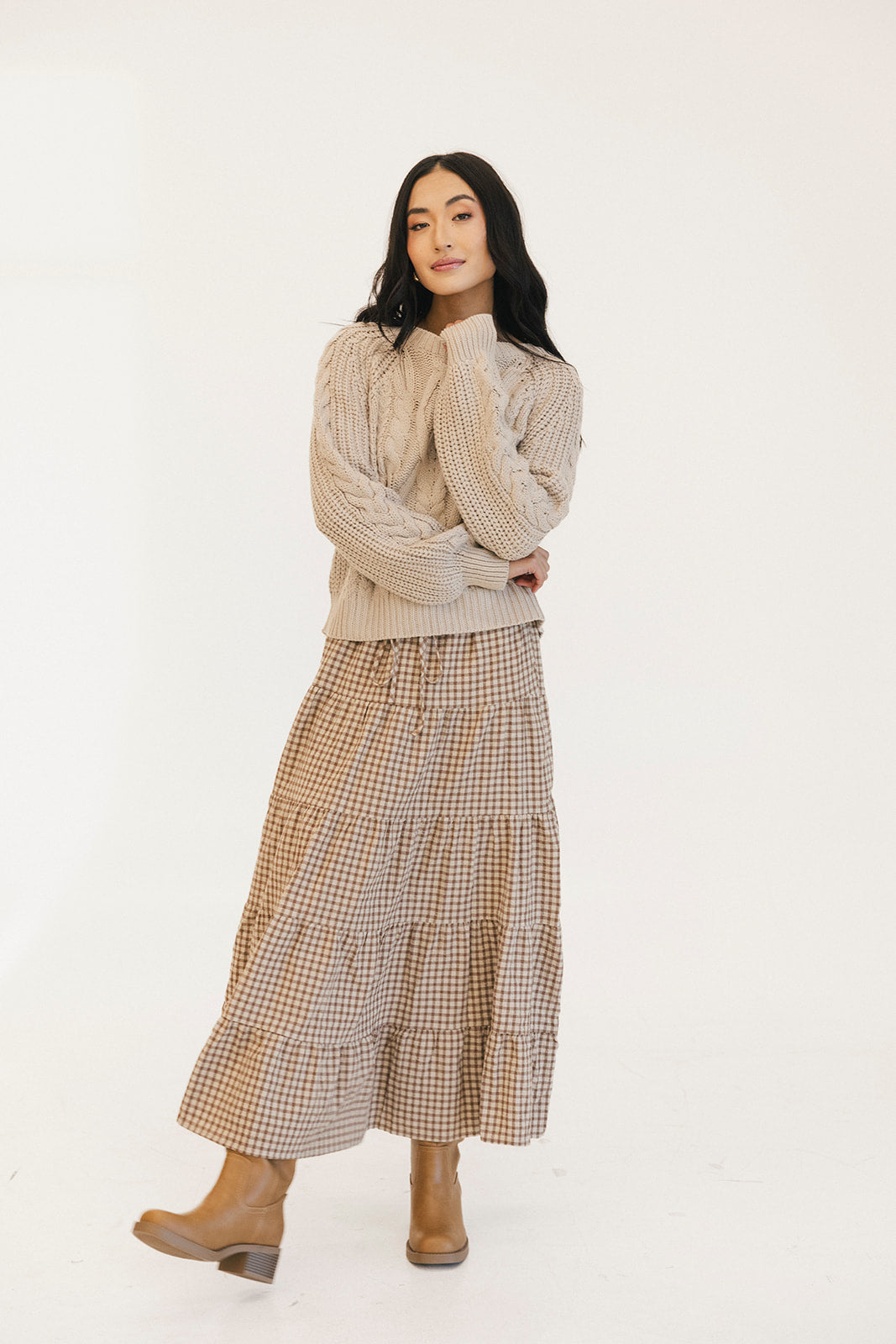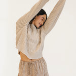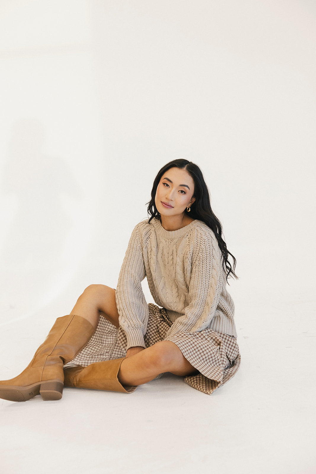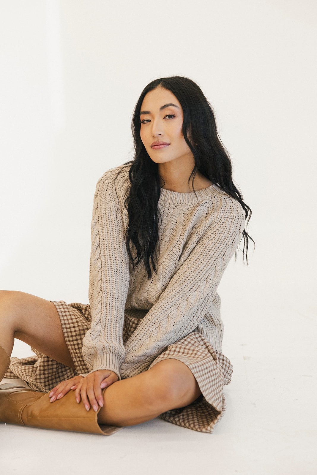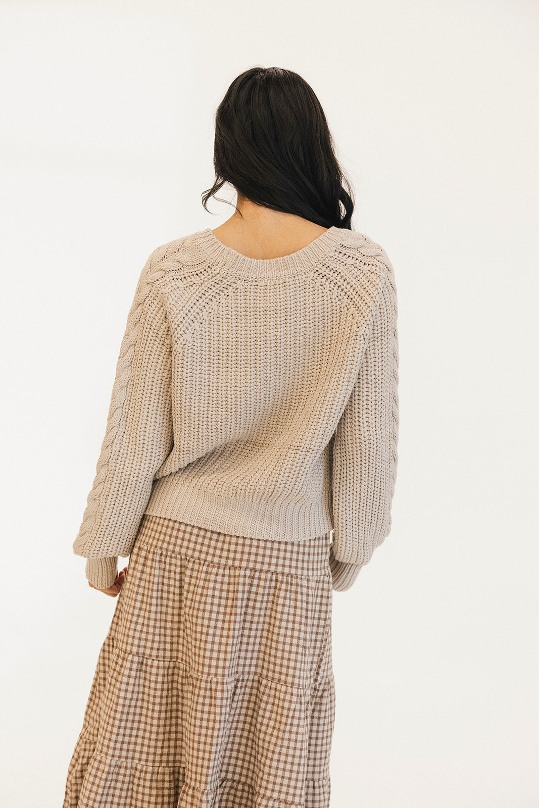 Elevate your everyday style with the Maggie Cable Knit Sweater in a timeless cream shade. This cropped silhouette features intricate cable braid crochet detailing that adds texture and visual interest to any outfit. The cozy knit construction provides warmth without bulk, making it perfect for layering or wearing solo. Whether you're dressing up for a night out or keeping it casual, this versatile sweater top works beautifully with jeans, skirts, or tailored trousers. Embrace comfort and sophistication in one piece.